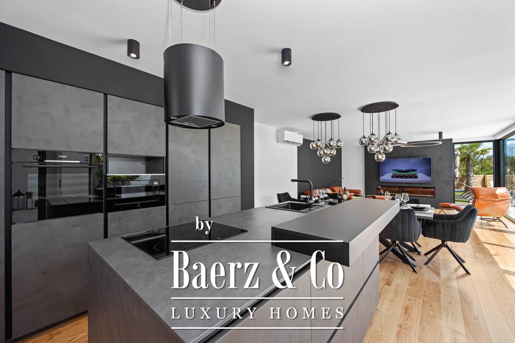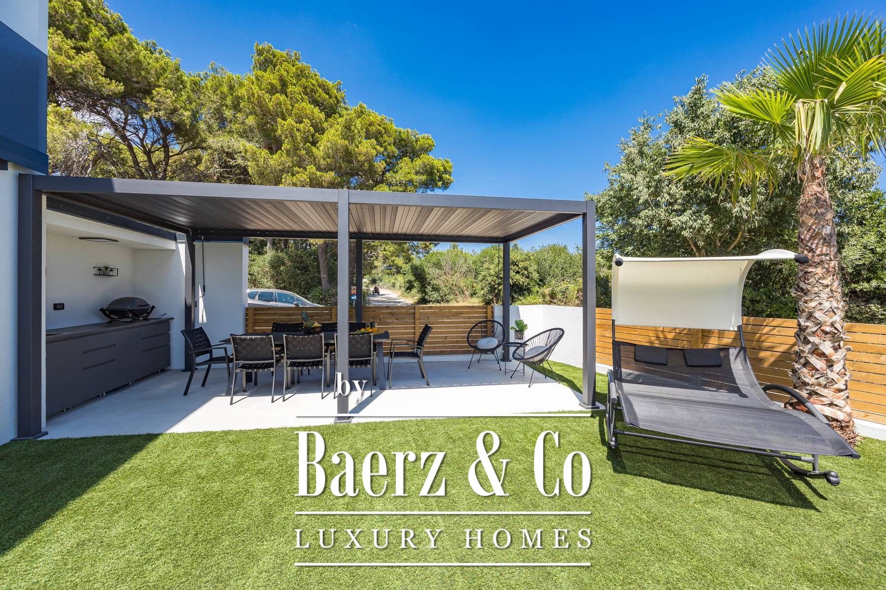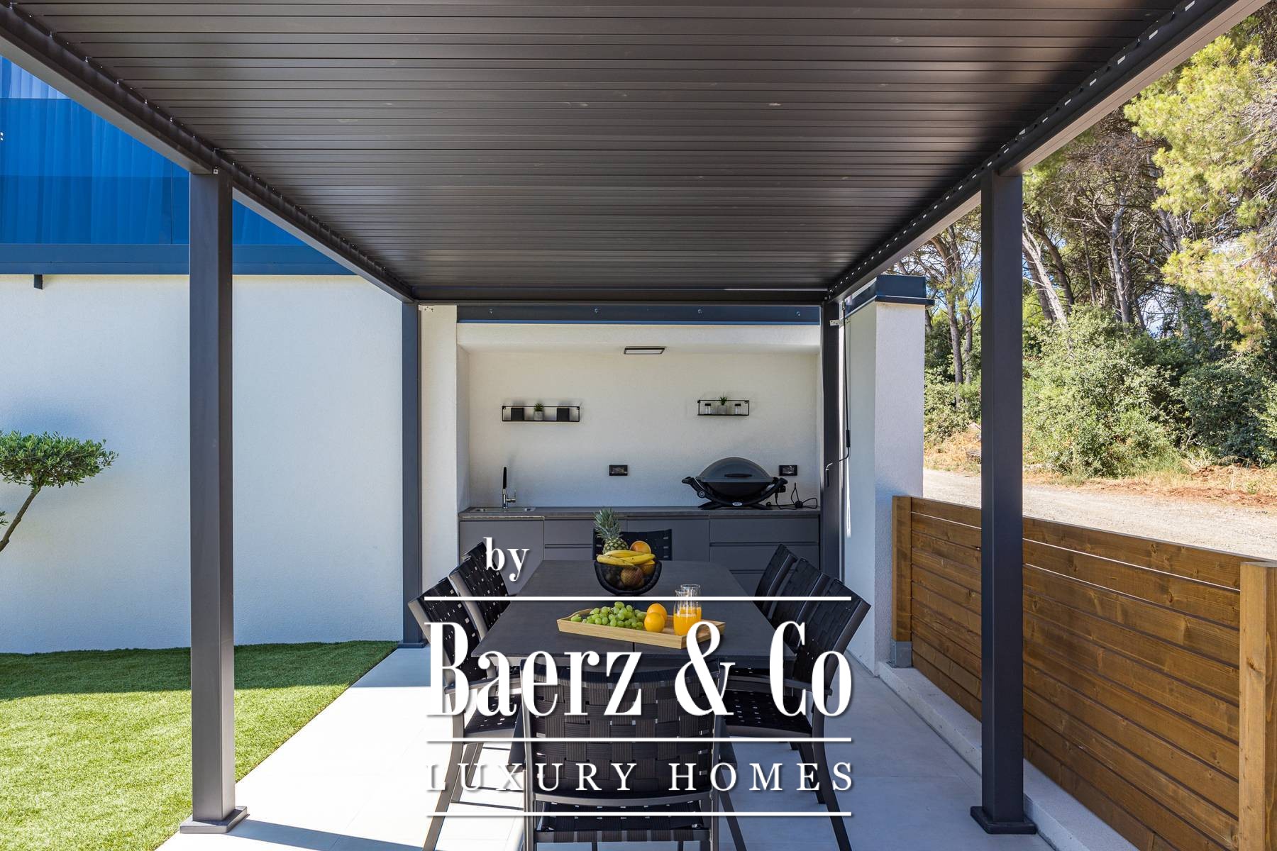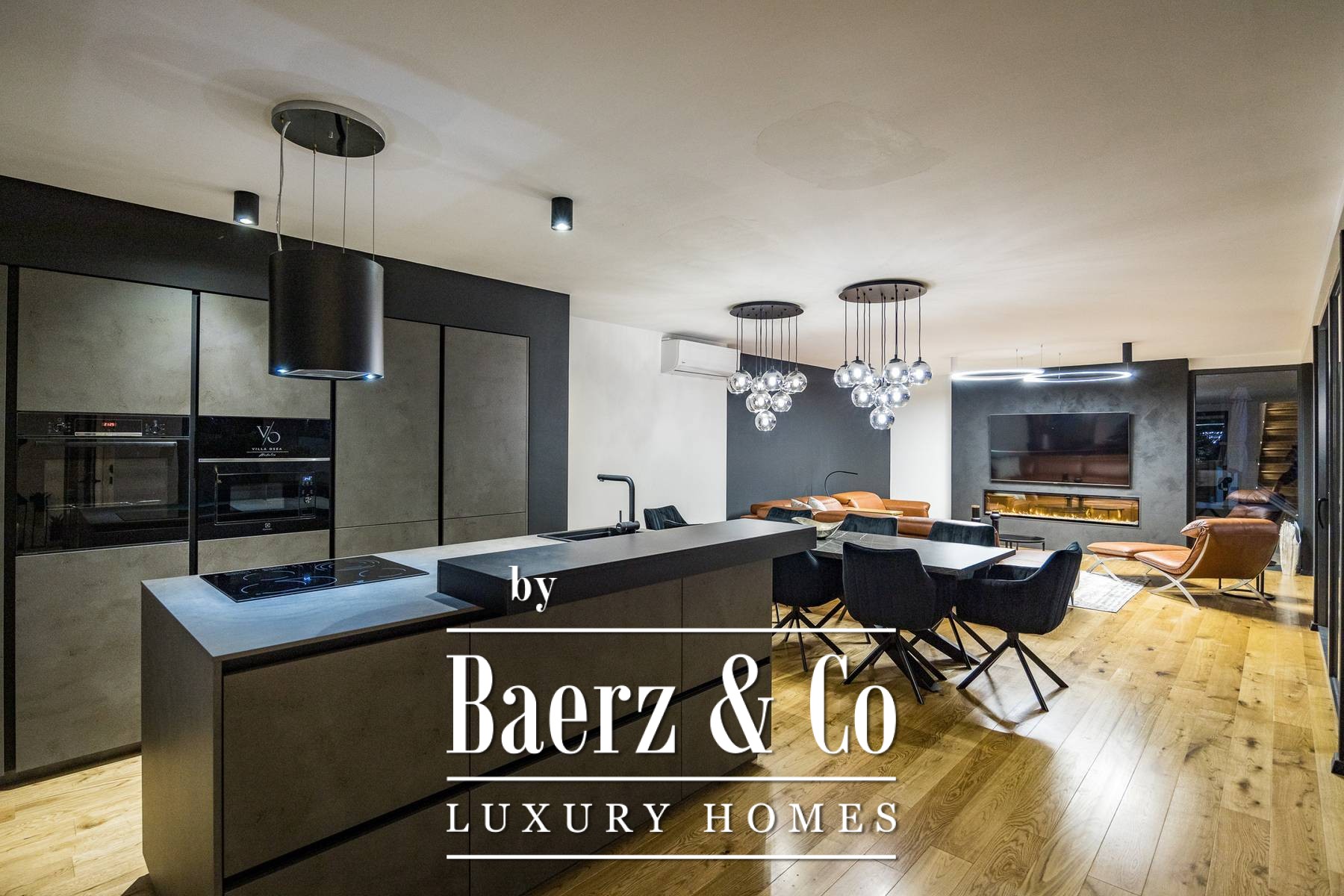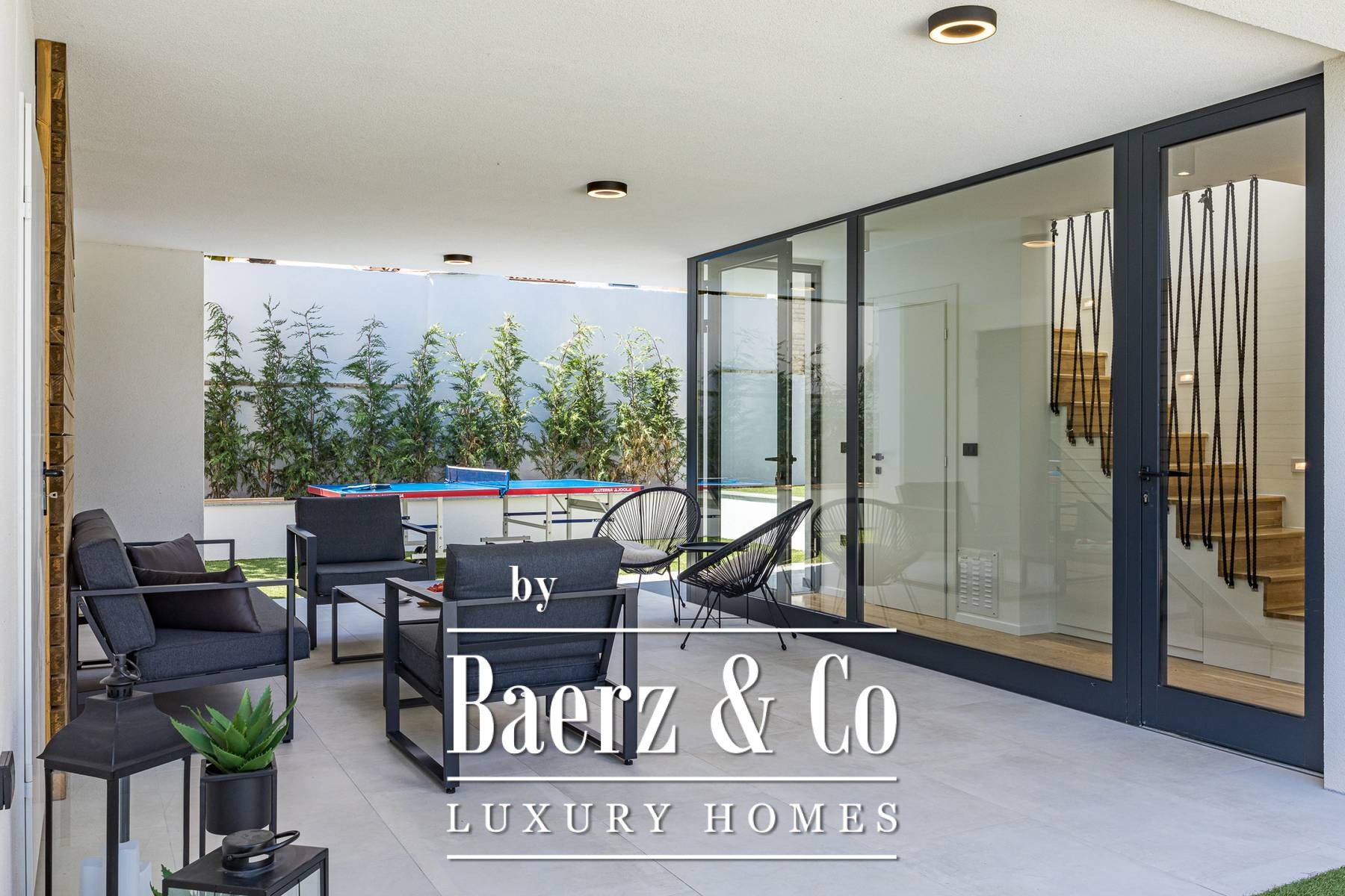 In Medulin, one of the most attractive tourist destinations, there is this modern meticulously decorated semi-detached villa NKP 220 m2.The villa is located in a quiet part of Medulin. It extends over 500 m2 of garden and is spread over two floors.The ground floor is dominated by a large and bright living room, a beautiful electric fireplace, an aluminum sliding wall with access to the 40 m2 pool that can be used even during the winter.Modern Dan Kuhen kitchen fully equipped. An internal staircase leads to the first