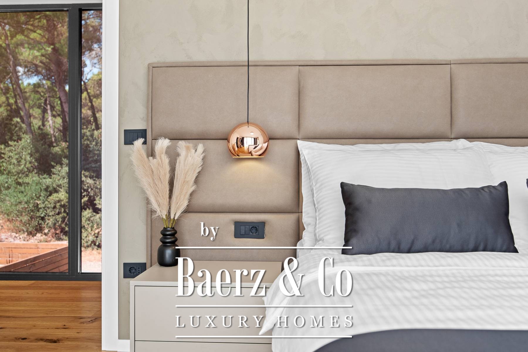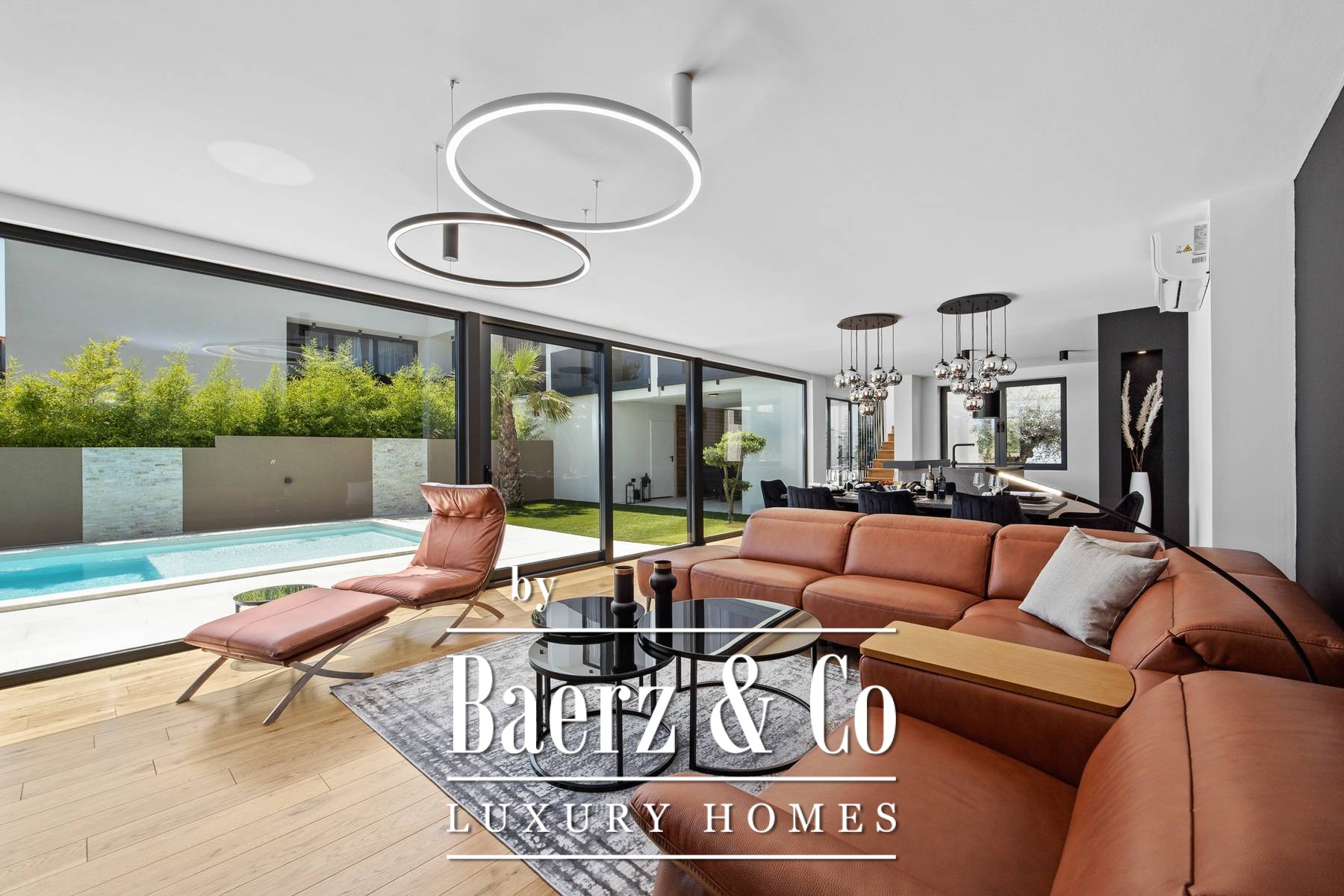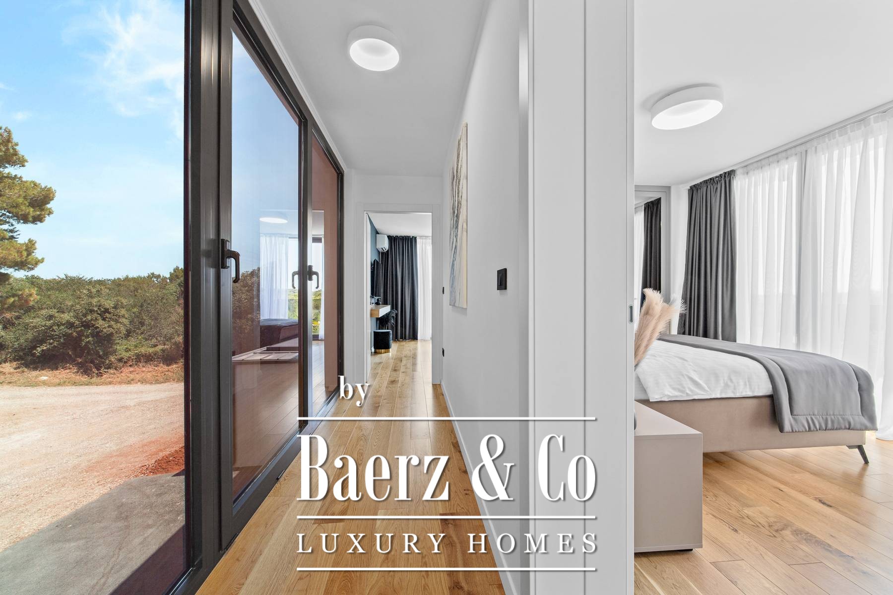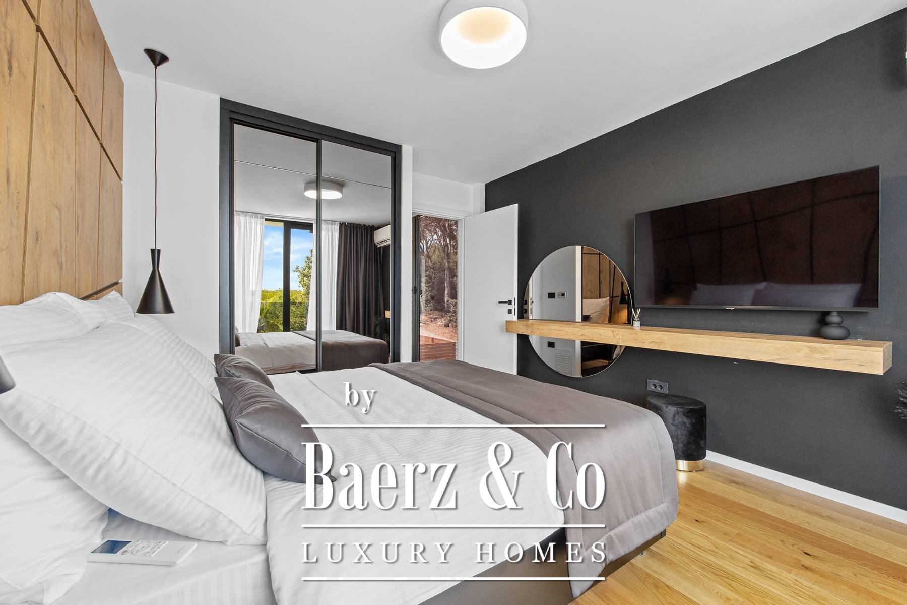 floor, where there are four well-arranged bedrooms, each with its own bathroom. Each room is air-conditioned, the floor has high-quality parquet that gives warmth to the entire space. All rooms are bright with high glass walls that give the space airiness, and have a view of the pool and nature.The ground floor also has a sauna, an outdoor shower, and a toilet. The garden of the villa is meticulously arranged and maintained. There is parking for 4 vehicles in front.We are at your disposal for more information.