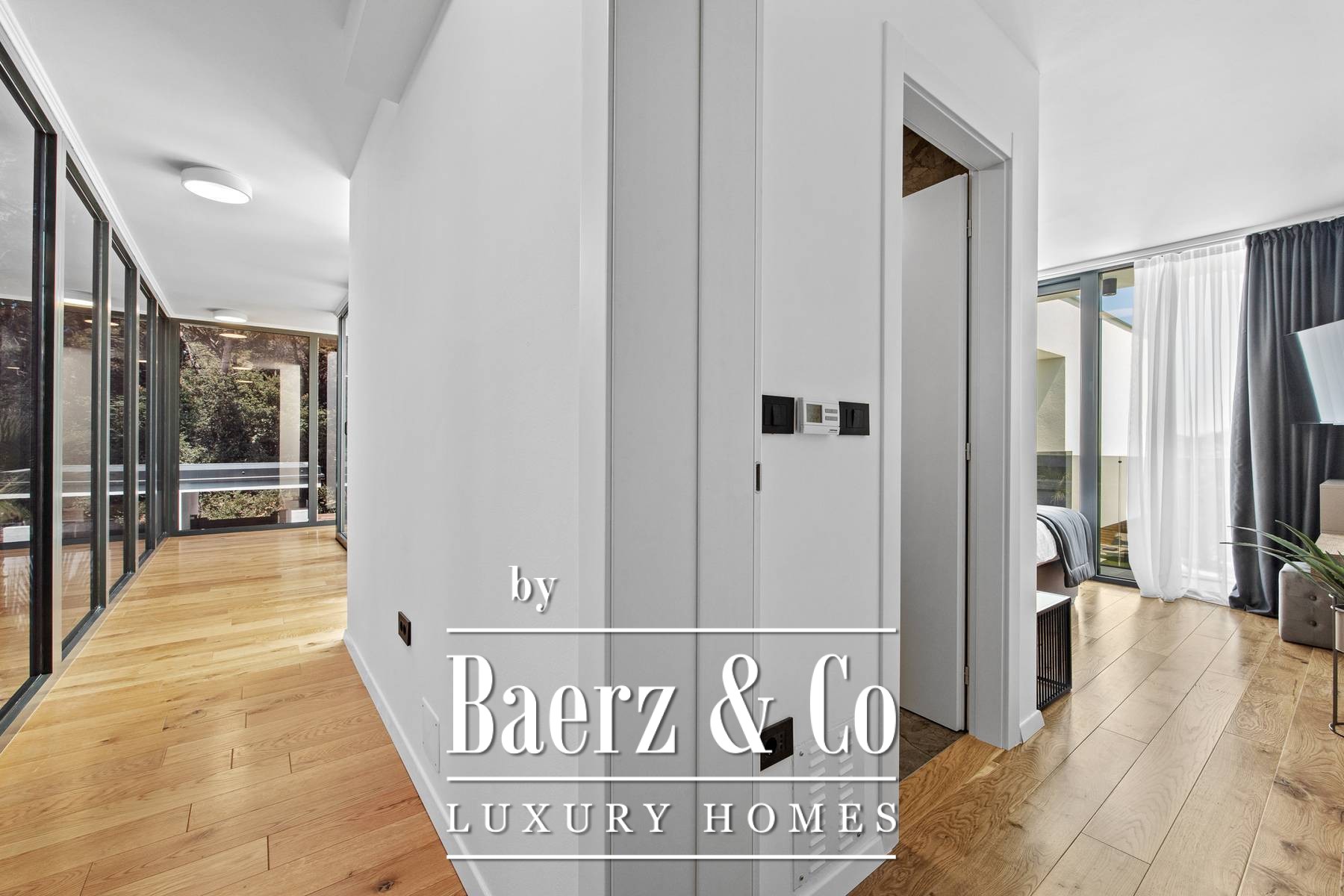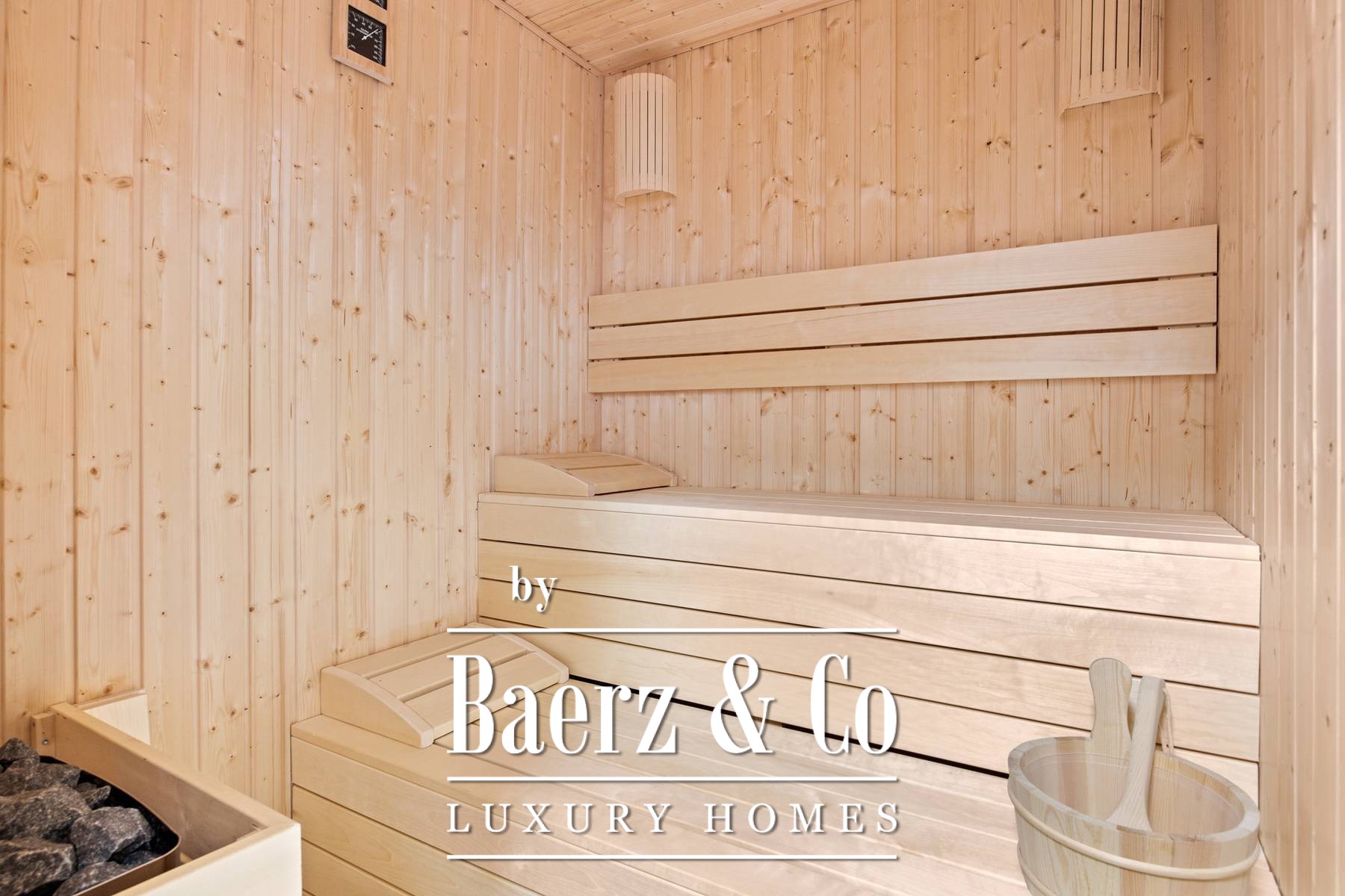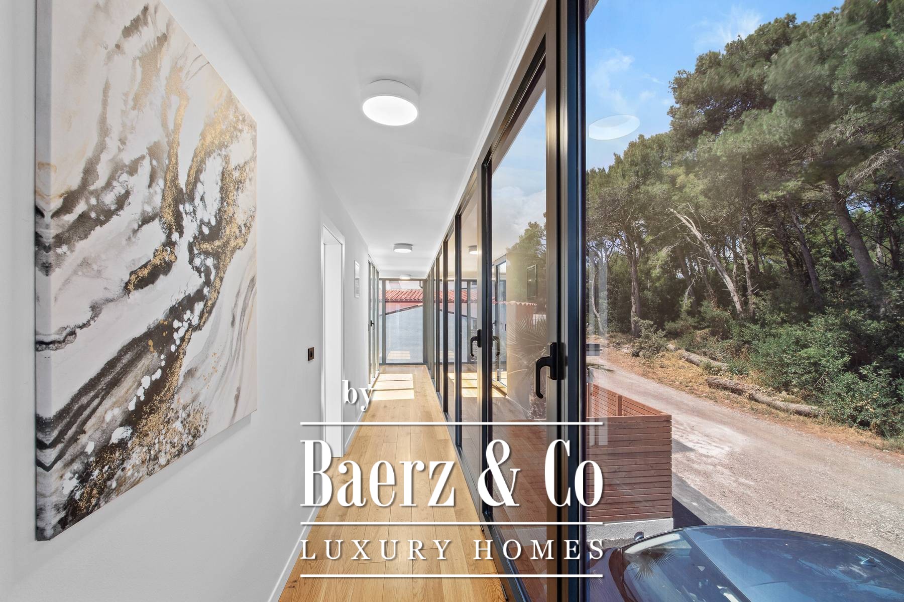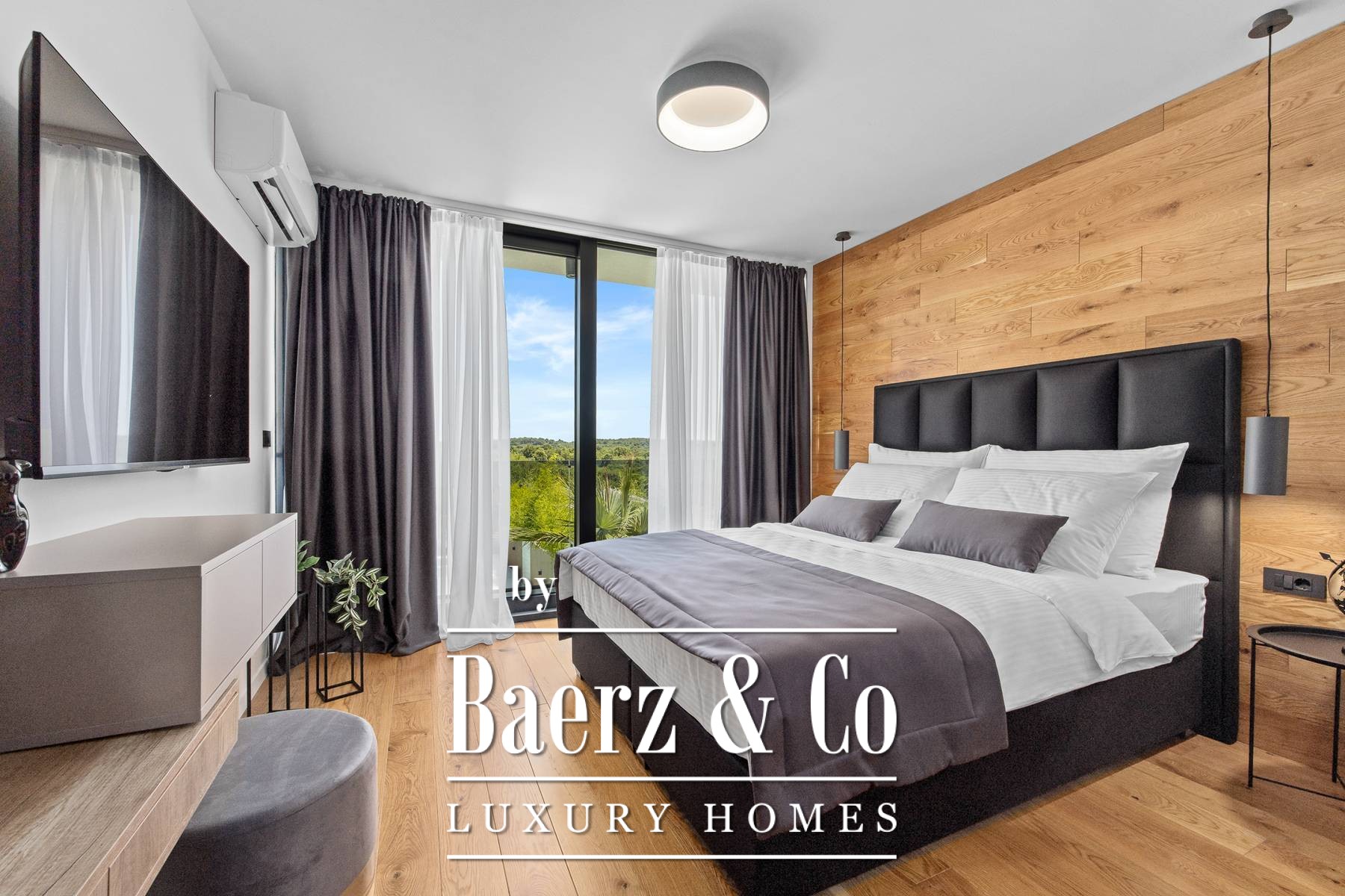 floor, where there are four well-arranged bedrooms, each with its own bathroom. Each room is air-conditioned, the floor has high-quality parquet that gives warmth to the entire space. All rooms are bright with high glass walls that give the space airiness, and have a view of the pool and nature.The ground floor also has a sauna, an outdoor shower, and a toilet. The garden of the villa is meticulously arranged and maintained. There is parking for 4 vehicles in front.We are at your disposal for more information.