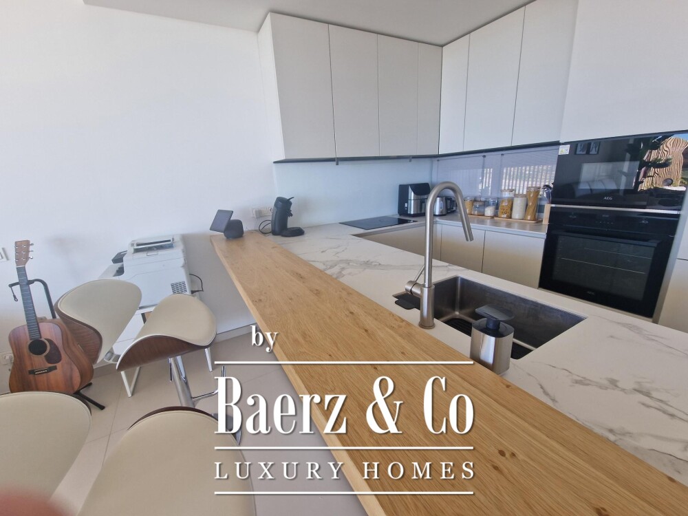 Een overdekt terras van 60 m² loopt naadloos over in een privé tuin van gelijke omvang. Hier vormt zich een serene setting om op elk moment van het dagdeel te genieten van het onbelemmerde vergezicht. Binnen worden strakke architectonische lijnen samengebracht in een royale woonkamer die elegant overgaat in een volledig uitgeruste open keuken. Hoogwaardige afwerkingen en materialen bepalen het ingetogen luxegevoel.