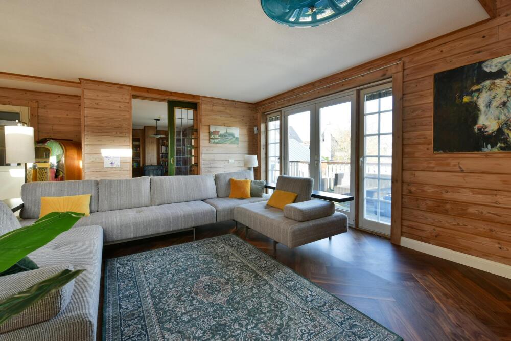 Via een charmante, beschutte binnenplaats bereik je de houten trap die je naar de veranda rondom de woning leidt. Bij binnenkomst stap je de royale hal binnen, waar een toilet met wastafel te vinden is en waar je toegang hebt tot de woonkamer, de bibliotheek en de bijkeuken. De lichte en ruime woonkamer is een ware oase van sfeer, dankzij de notenhouten visgraatvloer, de glas-in-lood schuifdeuren naar de bibliotheek en de openslaande deuren naar zowel de veranda als de tuin. Veel natuurlijk daglicht wordt in de woonkamer gegeven door de lichtstraat van dakramen die op het zuiden gesitueerd zijn.