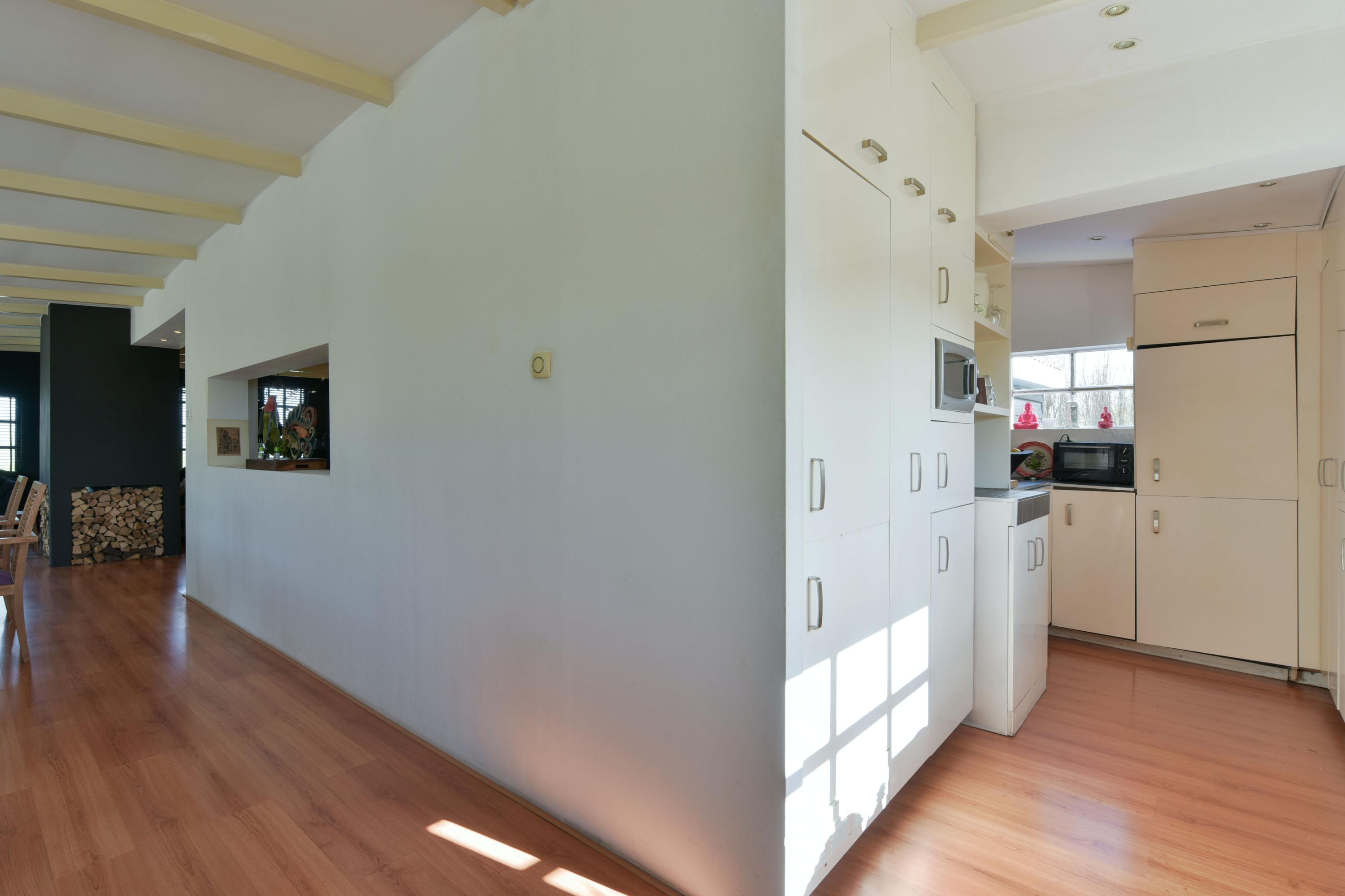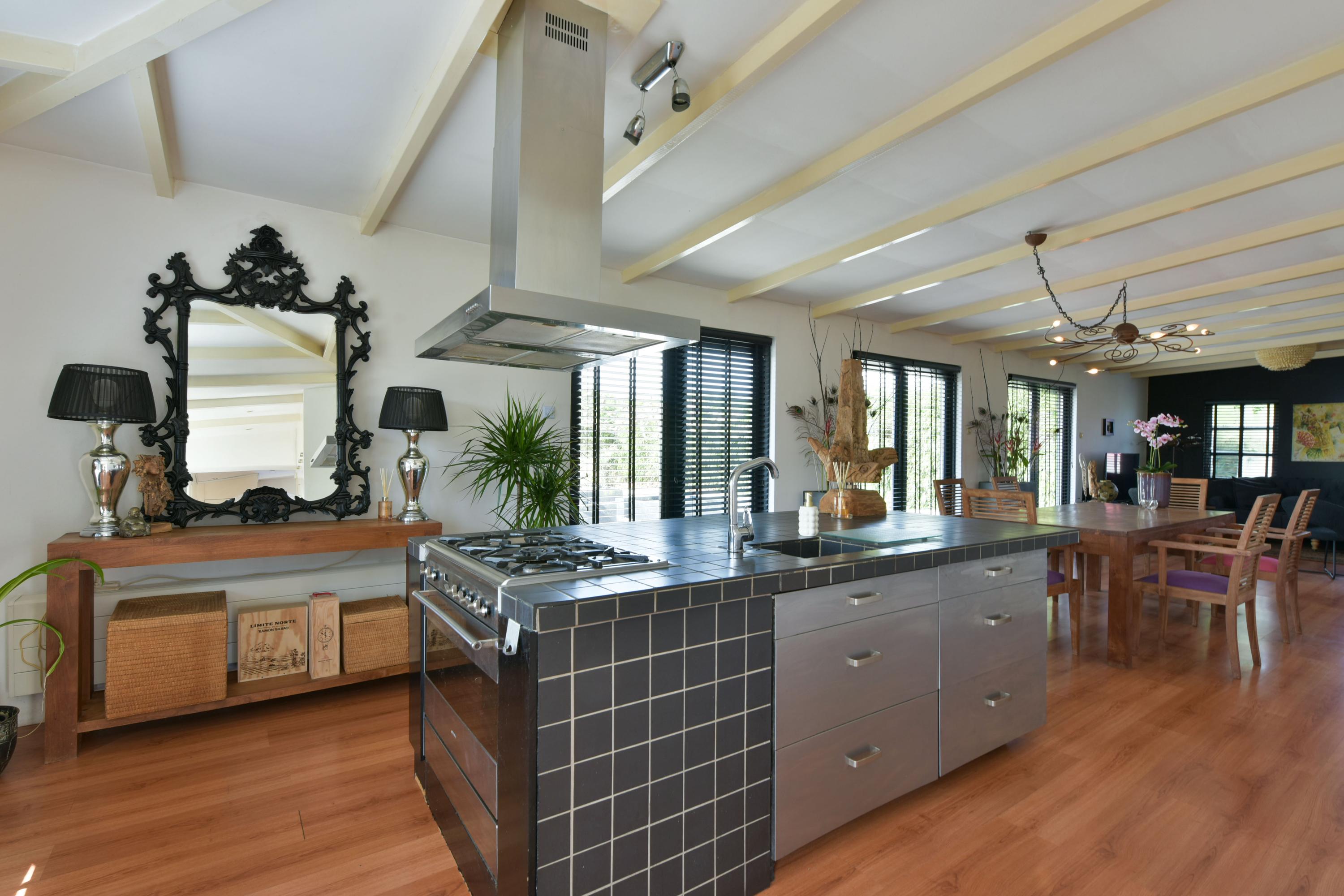 De open keuken is ruim opgezet en van alle gemakken voorzien. Het grote kookeiland met veel lades biedt volop werk- en opbergruimte, terwijl de kastenwand zorgt voor extra bergruimte. De keuken beschikt over een gasfornuis met afzuigkap, een heteluchtoven, koelkast en vaatwasser. Praktisch detail: de wasmachine, de wasdroger en cv-ketel zijn netjes weggewerkt in verschillende keukenkasten.