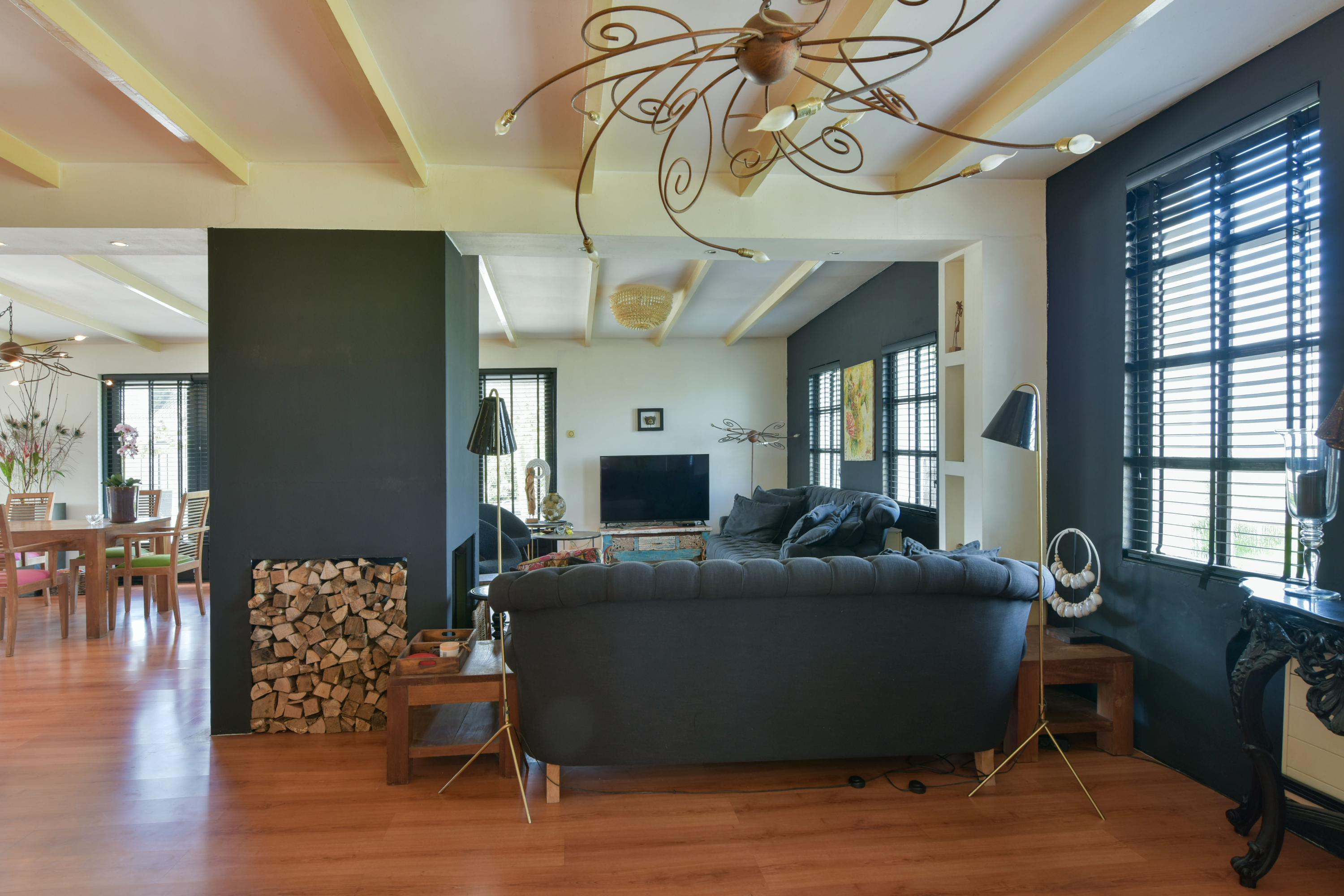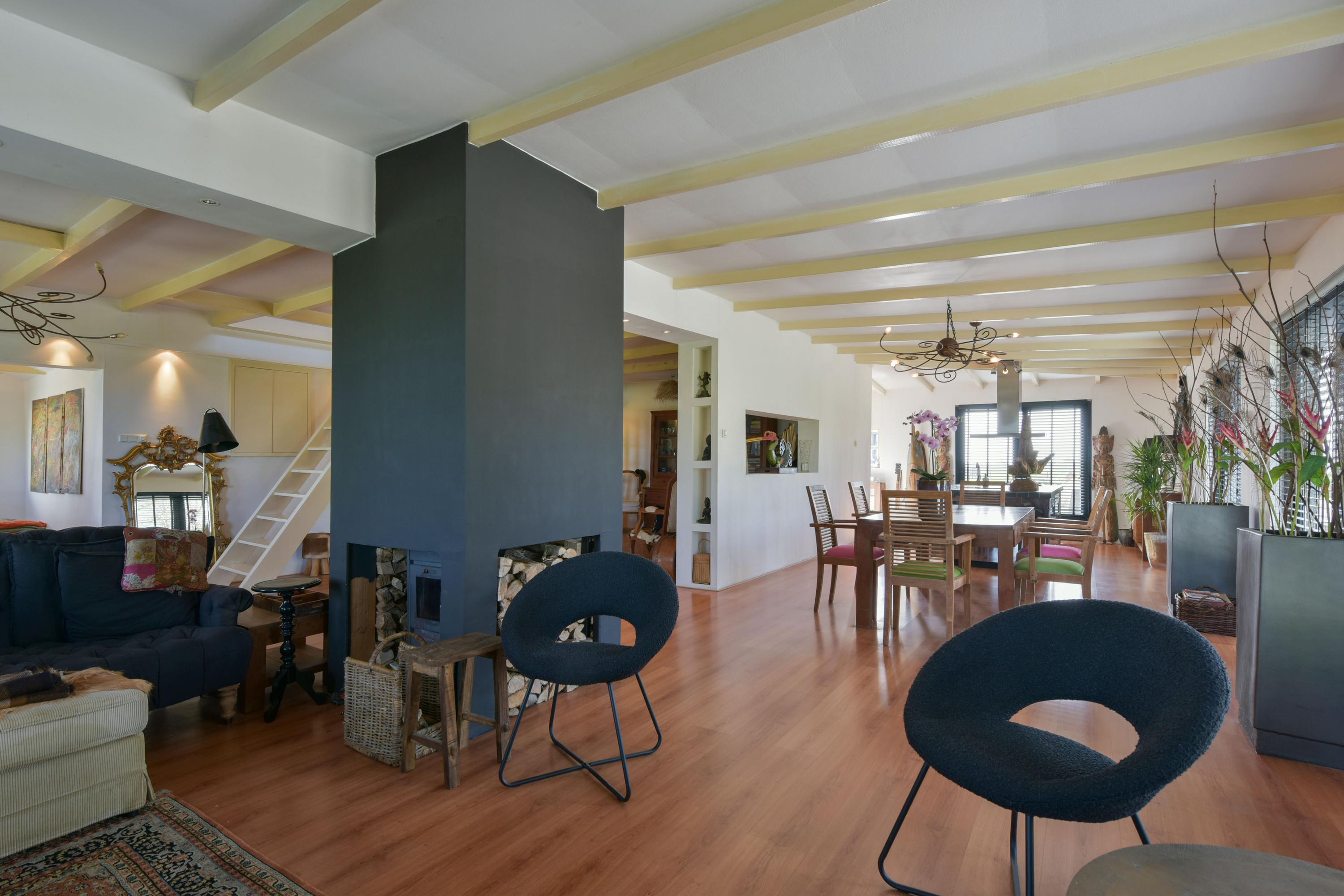 De grote schouw met houtkachel vormt het warme hart van de ruimte, terwijl de houten balken aan het plafond zorgen voor een sfeervolle, landelijke uitstraling. Daarnaast is er een aparte hoekje gecreëerd wat momenteel ingericht is als kantoor ideaal voor thuiswerken of als rustige lees- of hobbyplek.