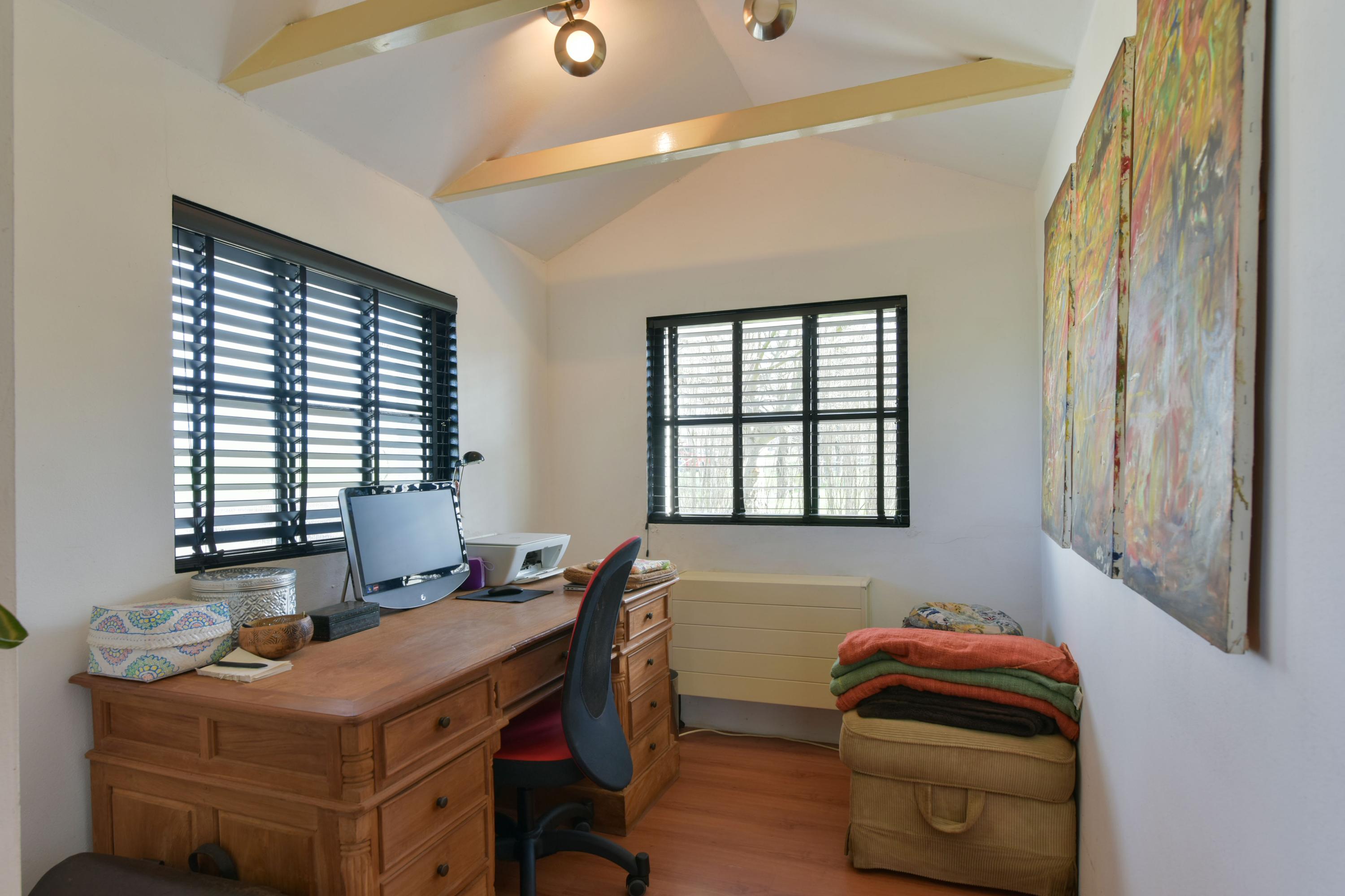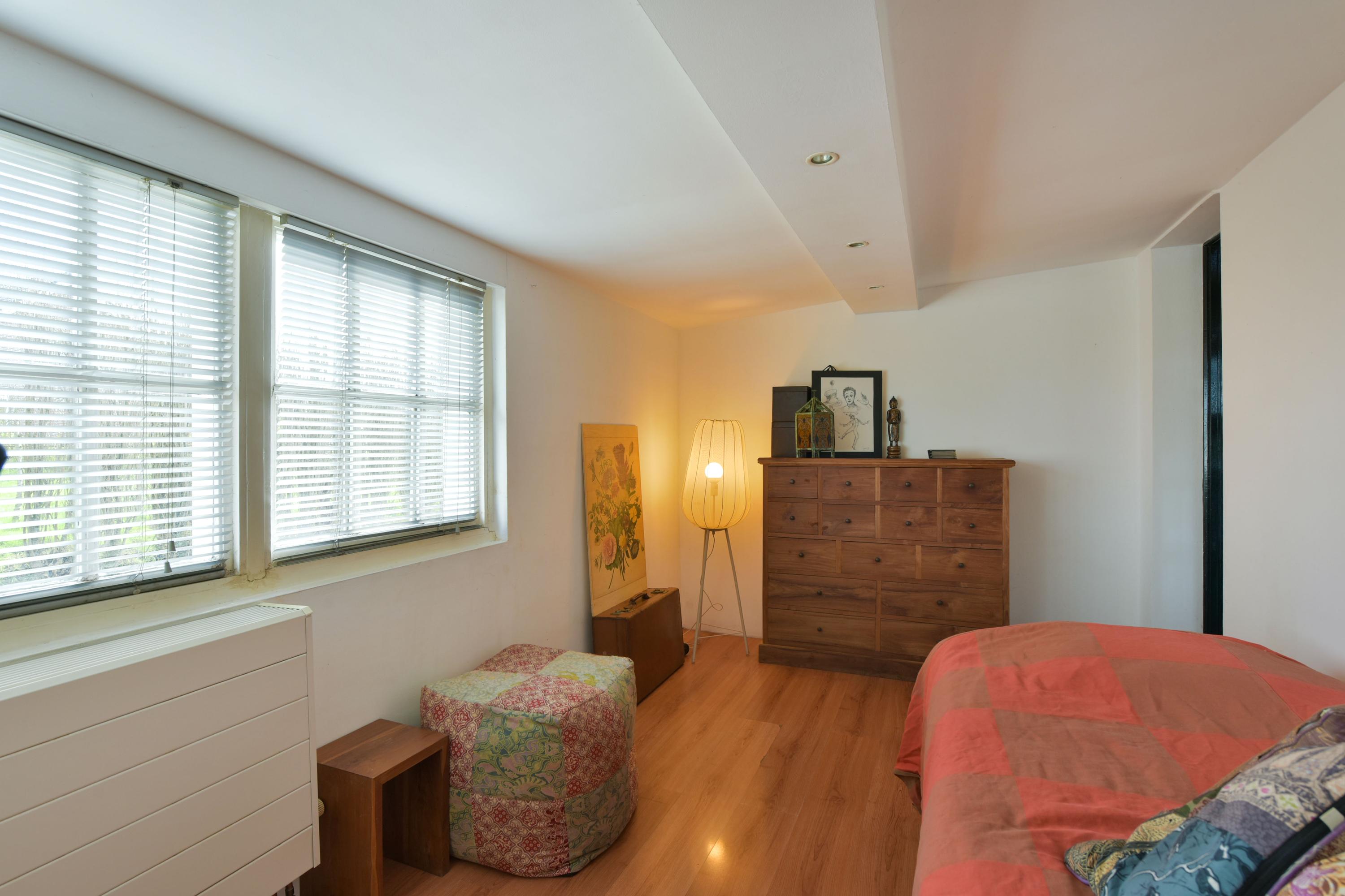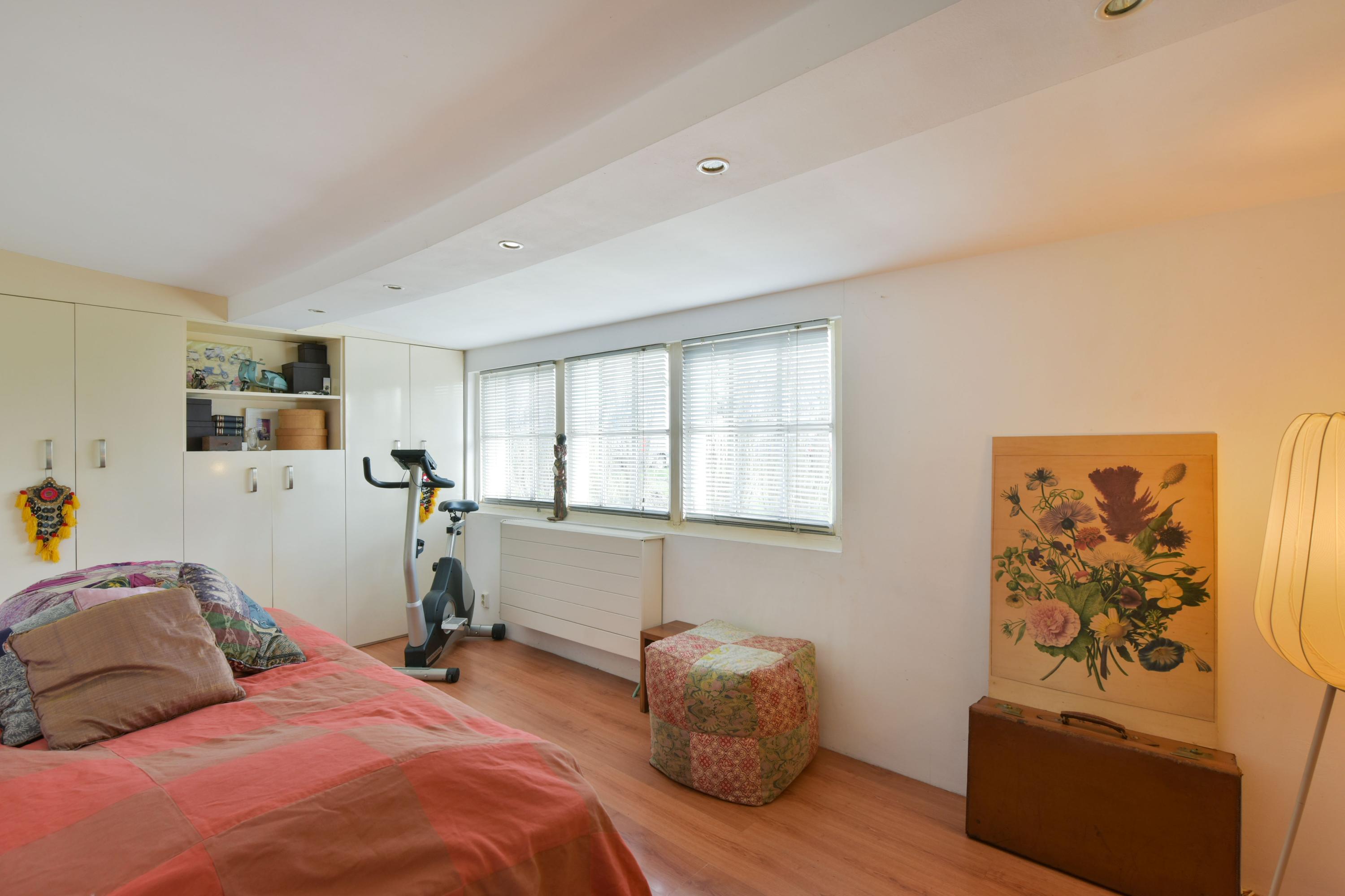 Vanuit de woonkamer is de slaapkamer op de begane grond bereikbaar. Deze kamer is voorzien van twee vaste kasten en biedt volop mogelijkheden: van comfortabele hoofdslaapkamer tot gastenverblijf of werkruimte.