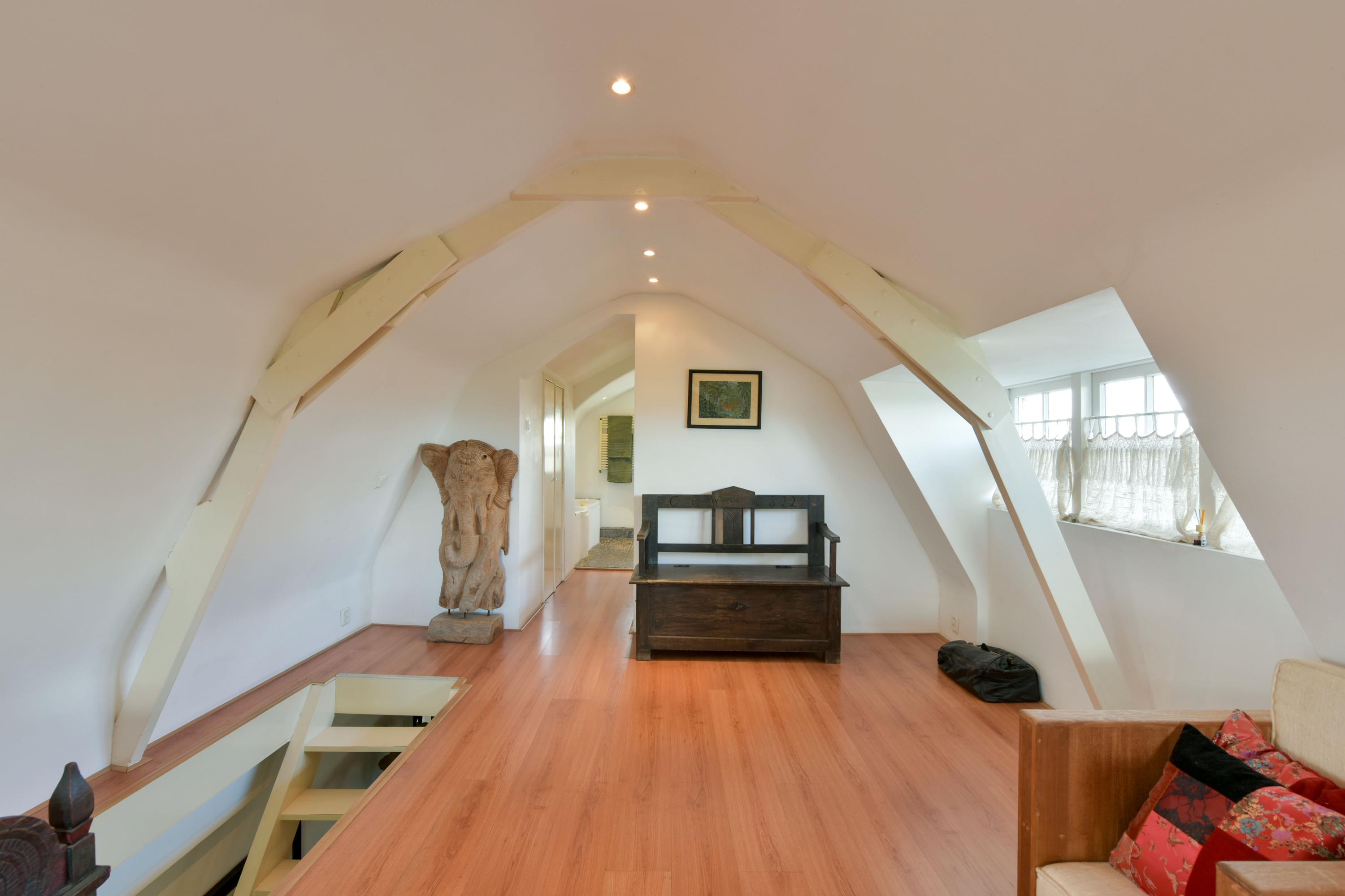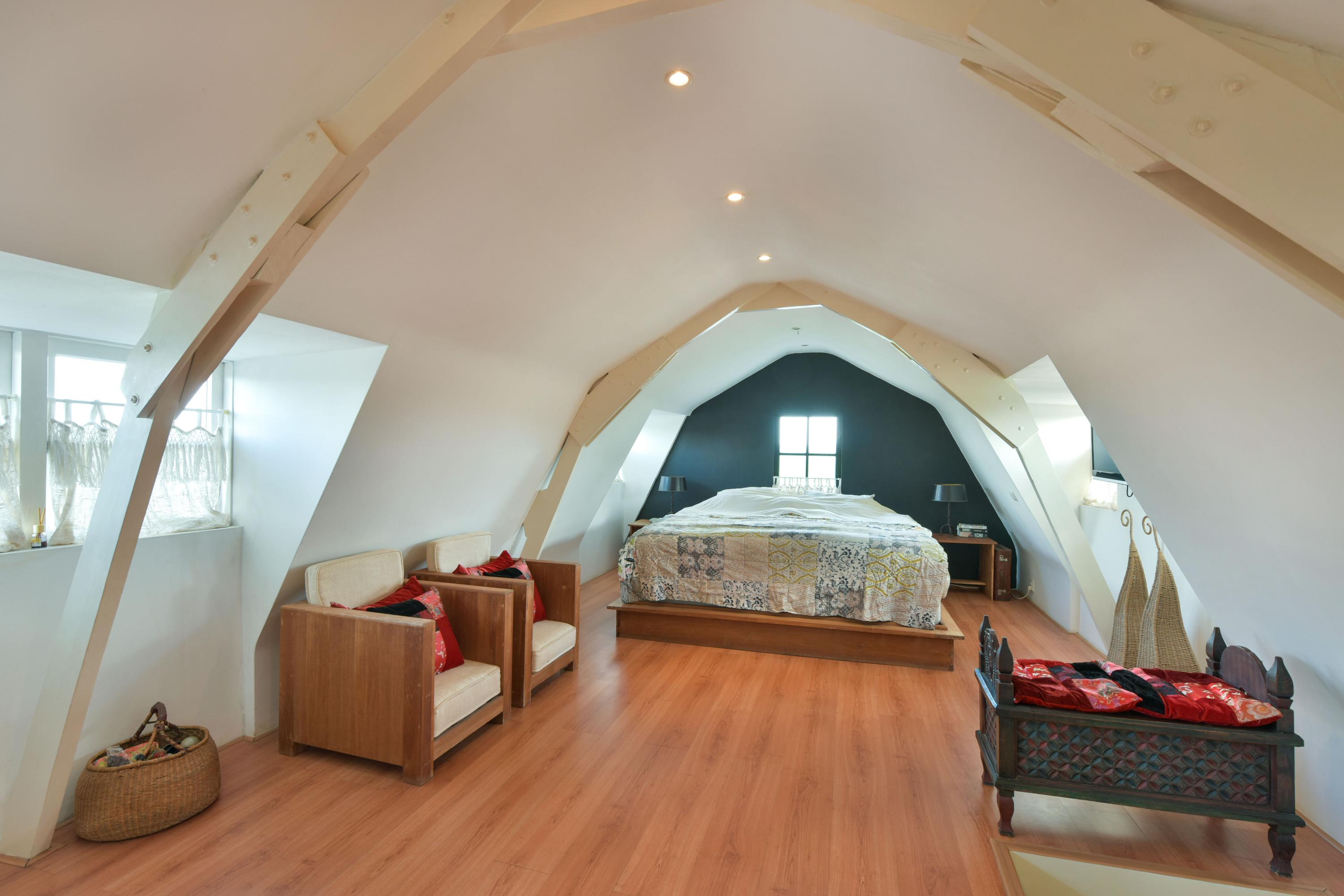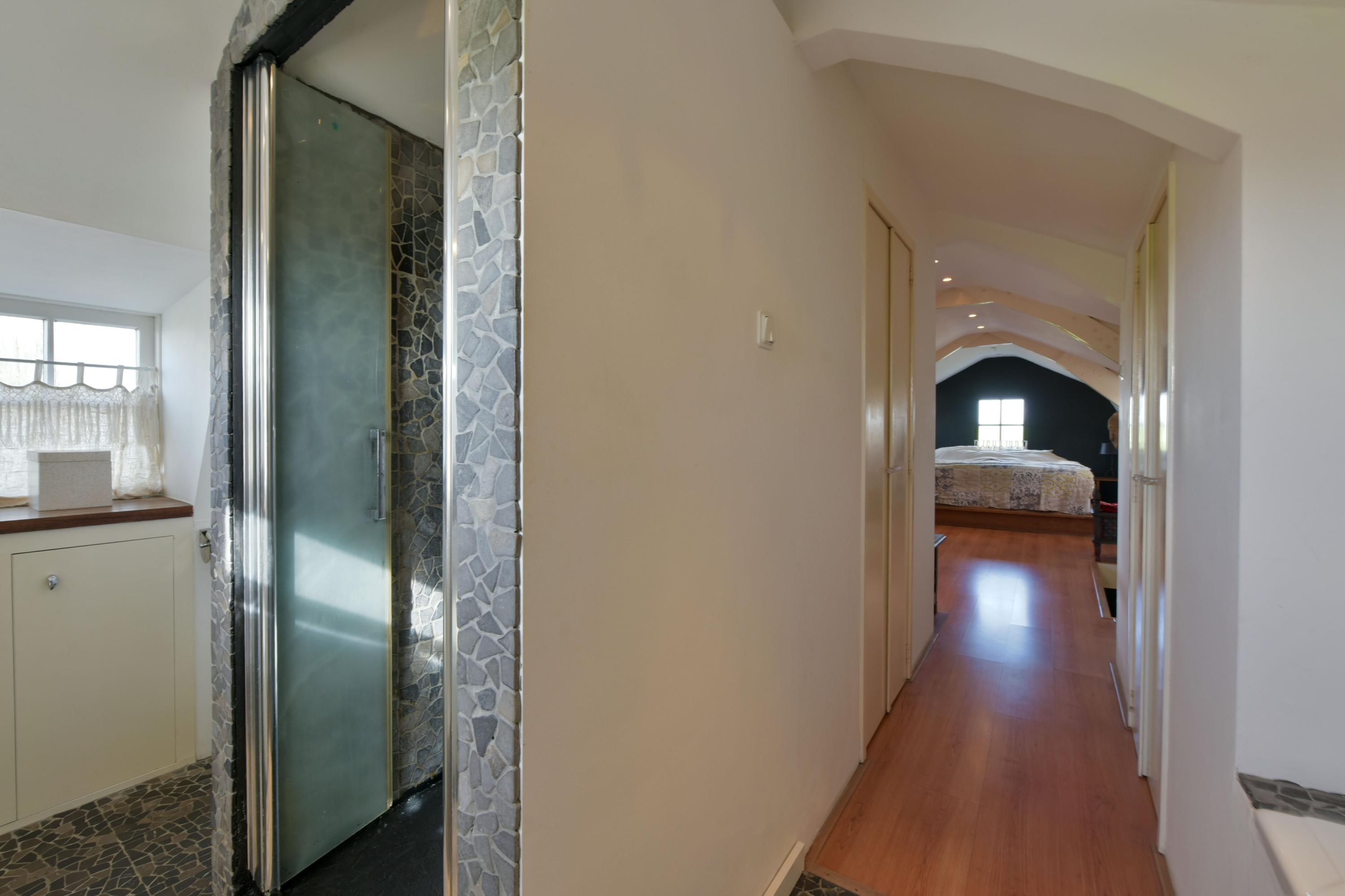 Via de trap in de woonkamer kom je op de eerste verdieping. Hier vind je een riante slaapkamer met twee grote vaste kledingkasten, ideaal voor wie behoefte heeft aan veel bergruimte.