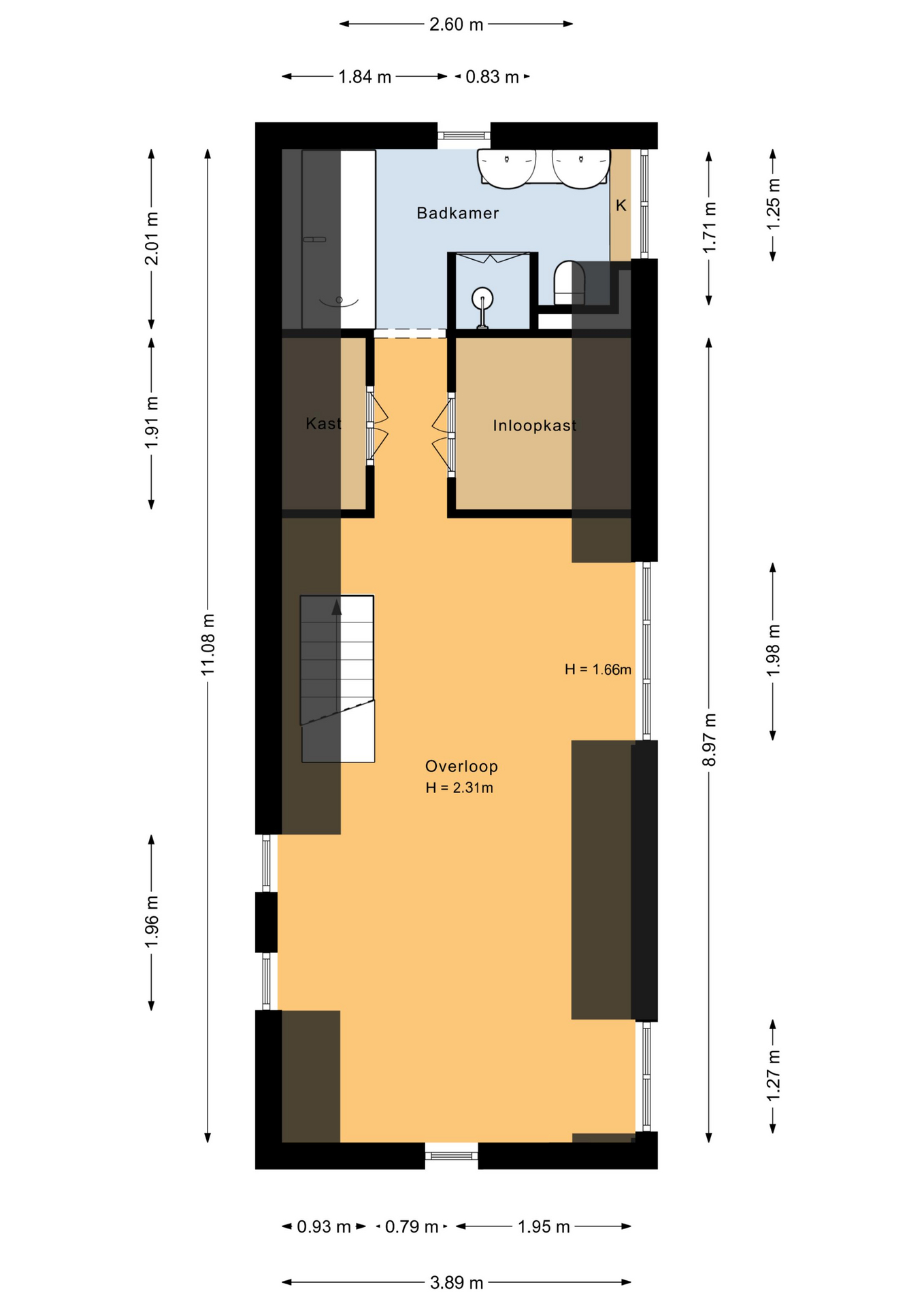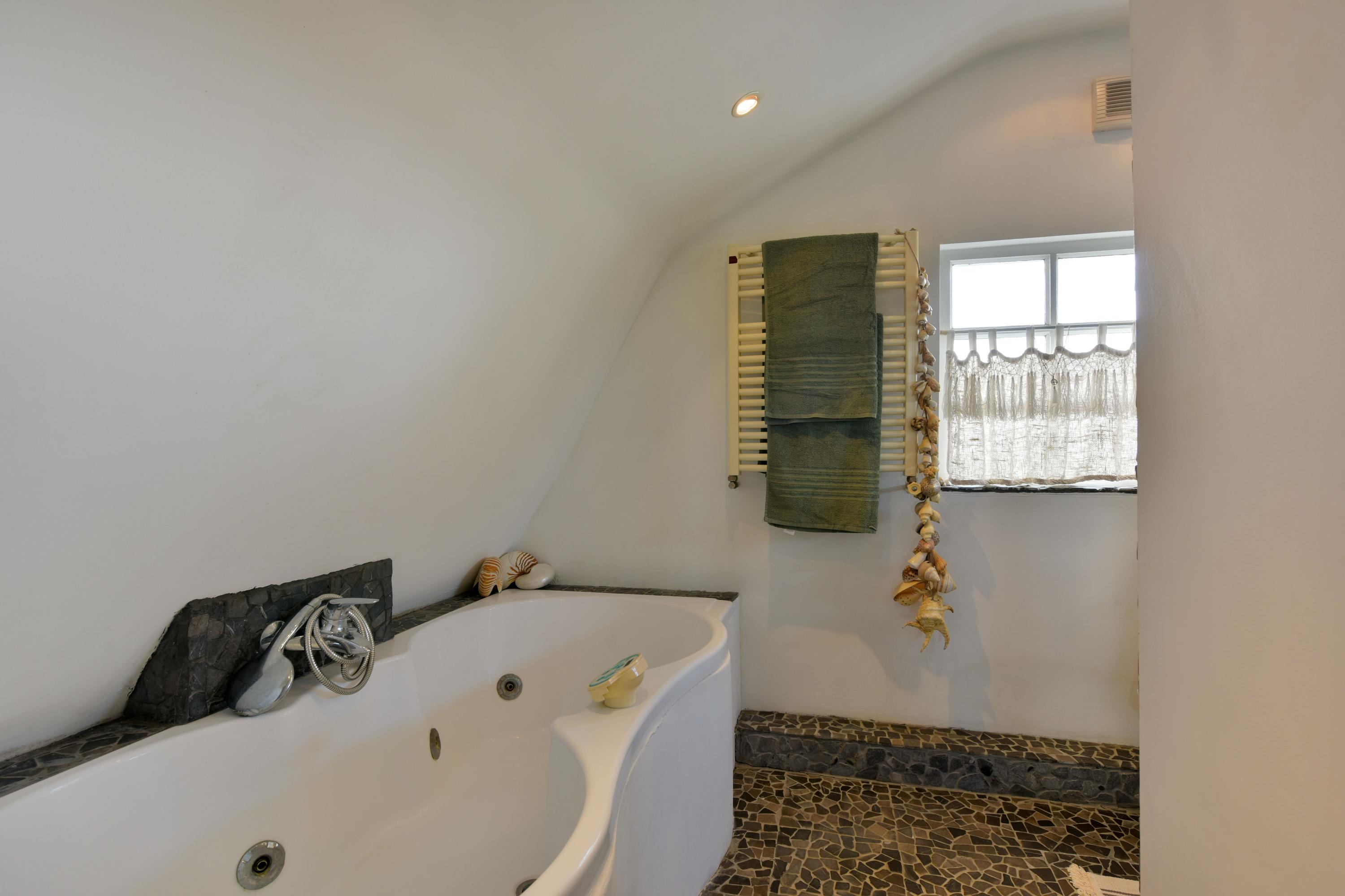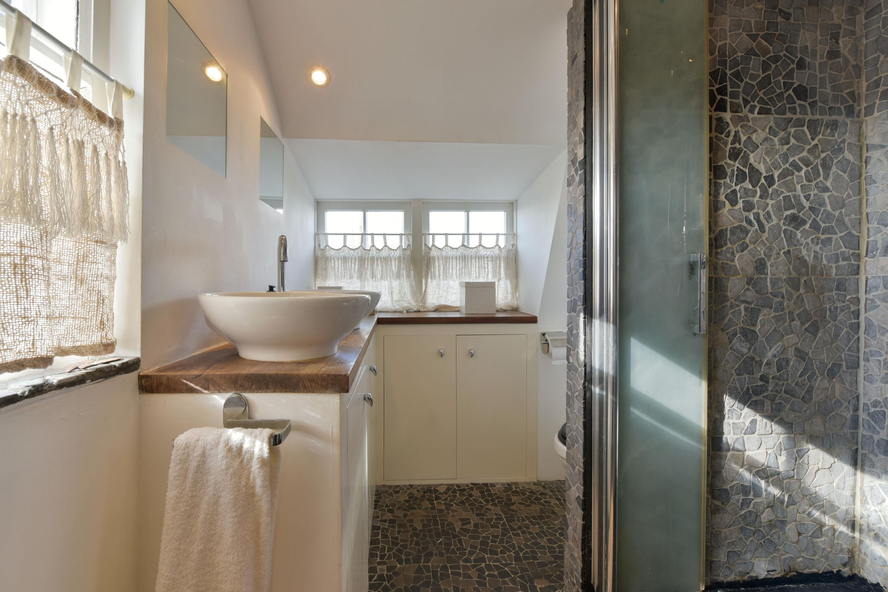 De badkamer, gelegen aan de achterzijde van de woning, is compleet uitgevoerd. Hier geniet je van een ruime douche met stortdouche, een heerlijk whirlpool ligbad, een toilet, een dubbele wastafel met meubel en een handdoekenradiator. Een fijne plek om de dag ontspannen te beginnen of juist af te sluiten.
