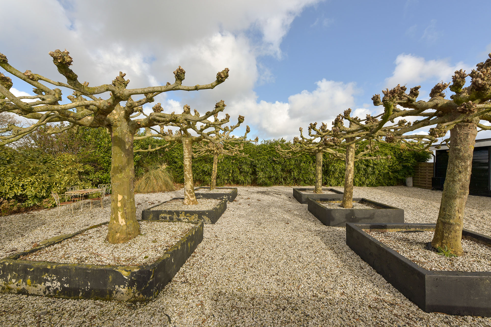 De tuin rondom de woning is verzorgd en biedt volop ruimte om te genieten van het buitenleven. Met een speelse indeling van grind, gras en een terras is er altijd wel een plek te vinden in de zon of juist in de schaduw. De grote platanen zorgen op warme dagen voor verkoeling en geven de tuin een karakteristieke uitstraling.