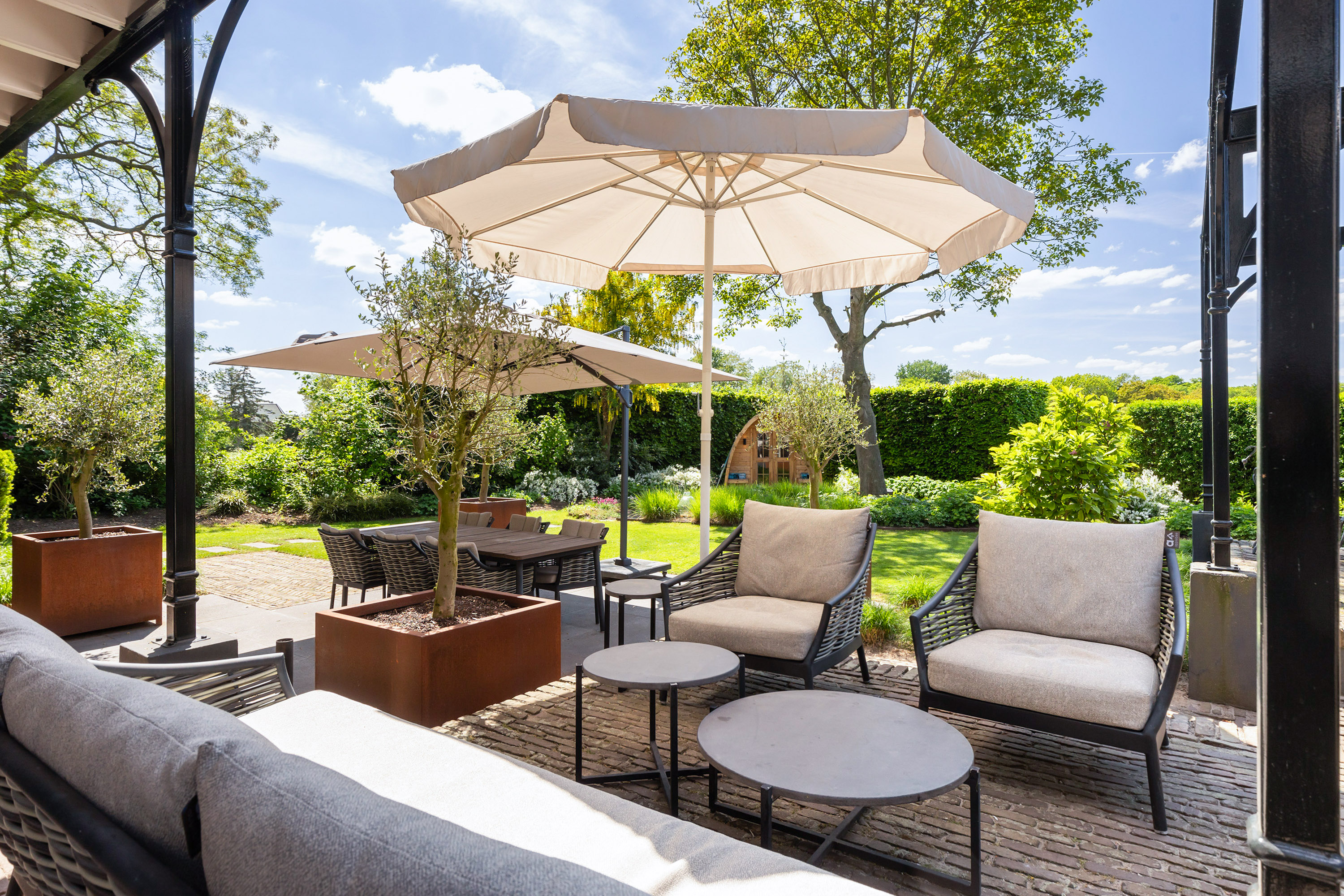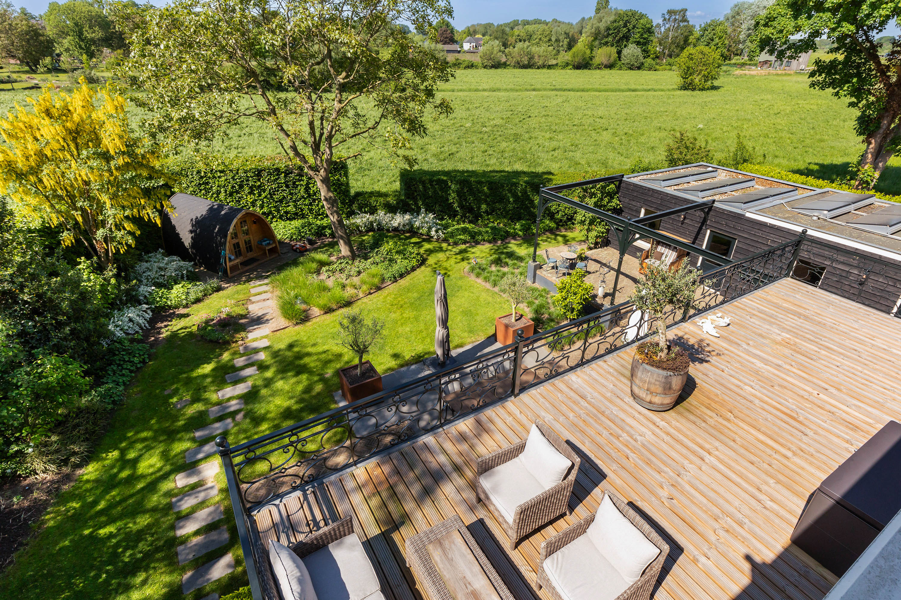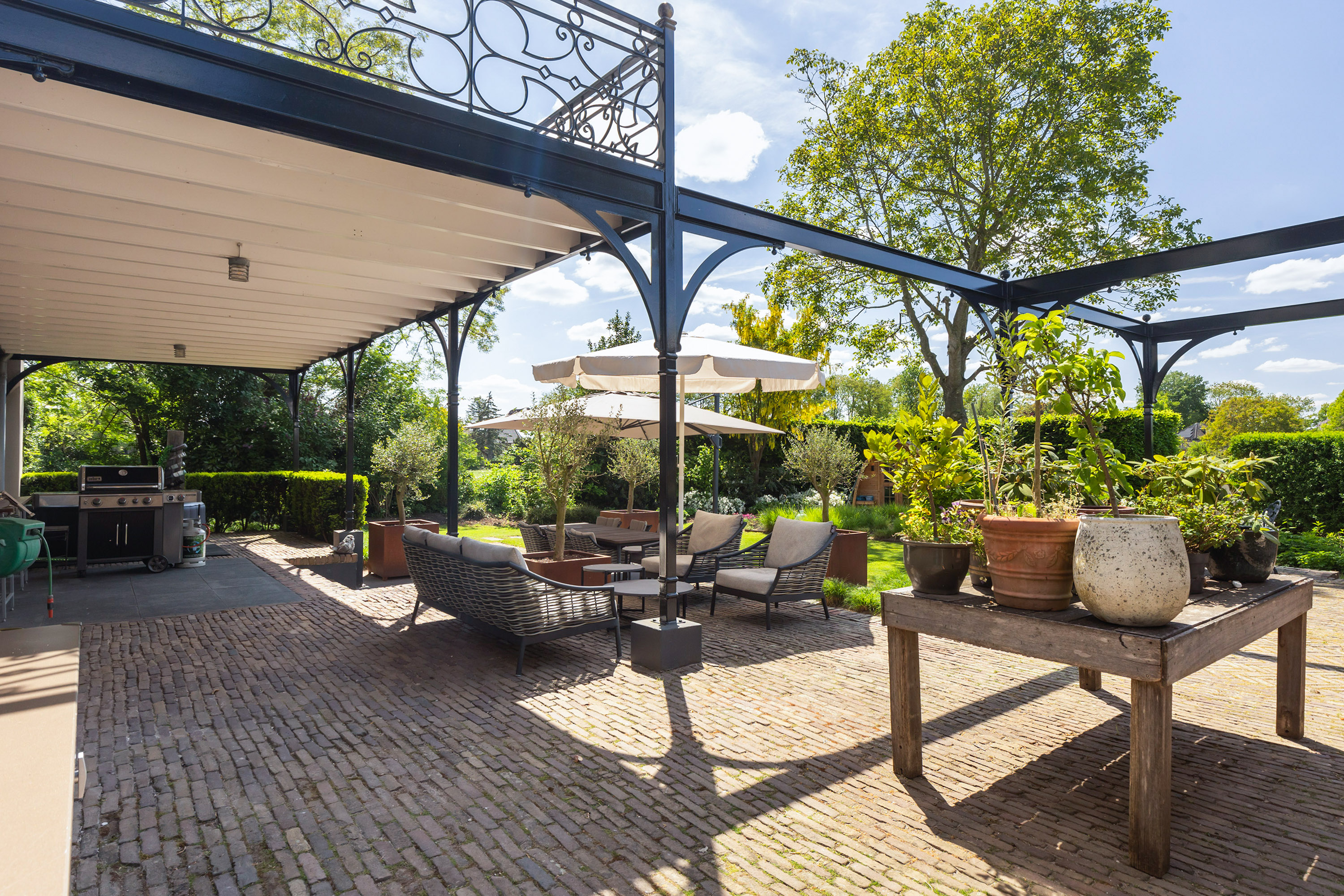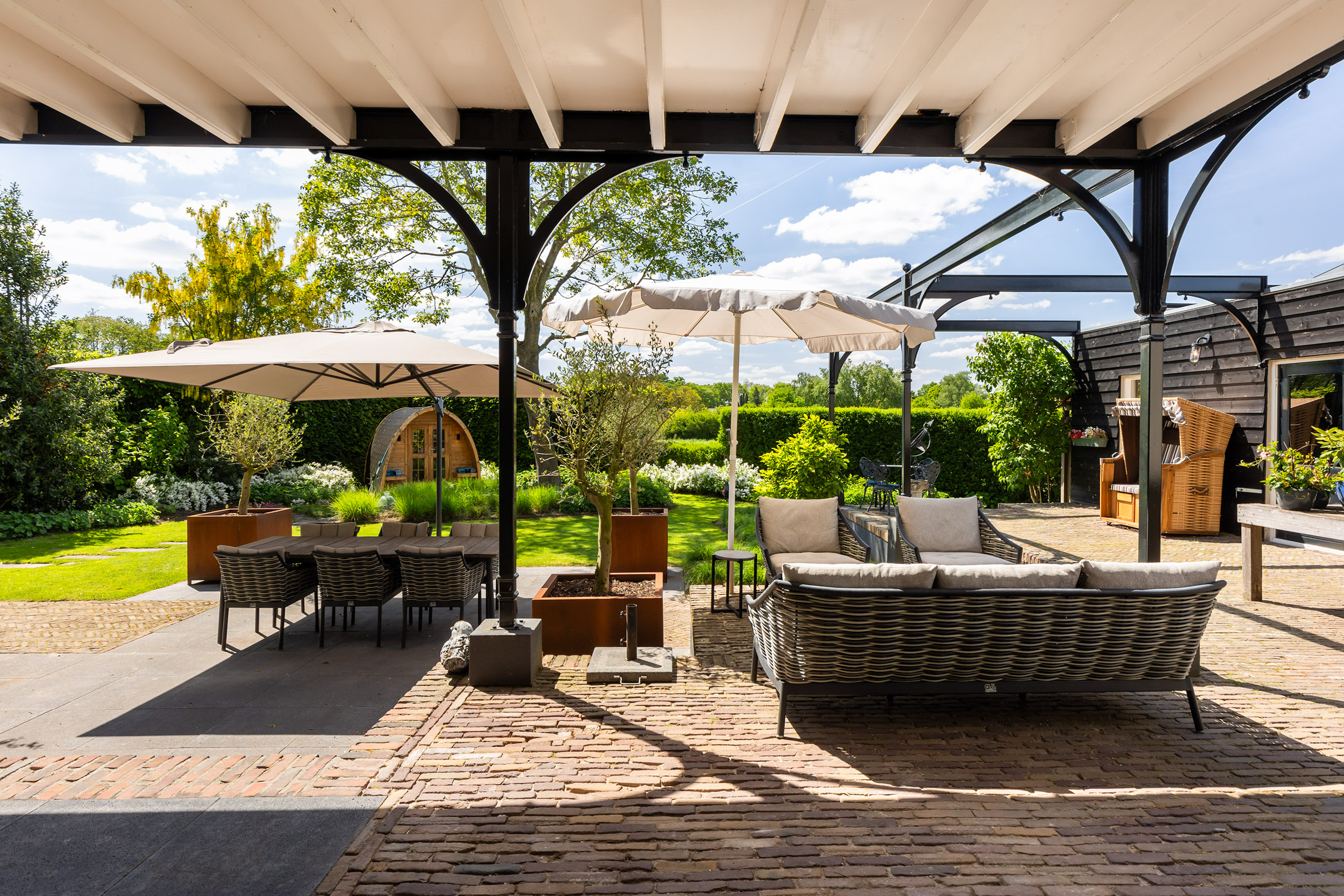 Het buitenterrein vormt een volwaardig verlengstuk van de woning. De tuin, opnieuw aangelegd in 2022, is ontworpen met oog voor rust en functionaliteit. Strakke lijnen worden afgewisseld met natuurlijke beplanting en meerdere terrassen bieden altijd een plek in zon of schaduw. De veranda met houten balkenplafond, voorbereid op buitenkeuken en wellness, maakt het buitenleven bijzonder aangenaam. Aan de zijkant van het perceel ligt een tweede tuin met gazon en een karakteristieke treurwilg, wat bijdraagt aan de groene beleving.