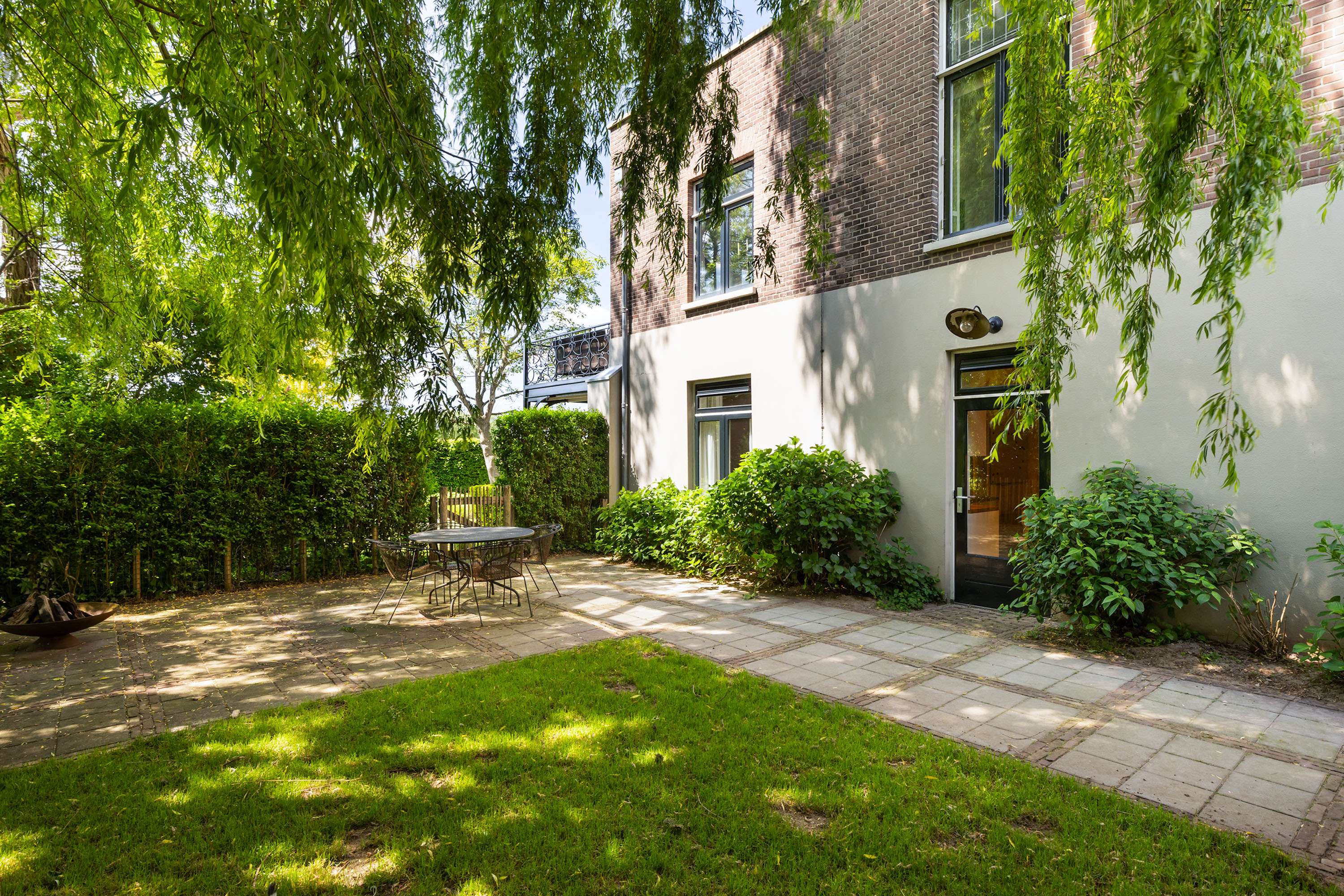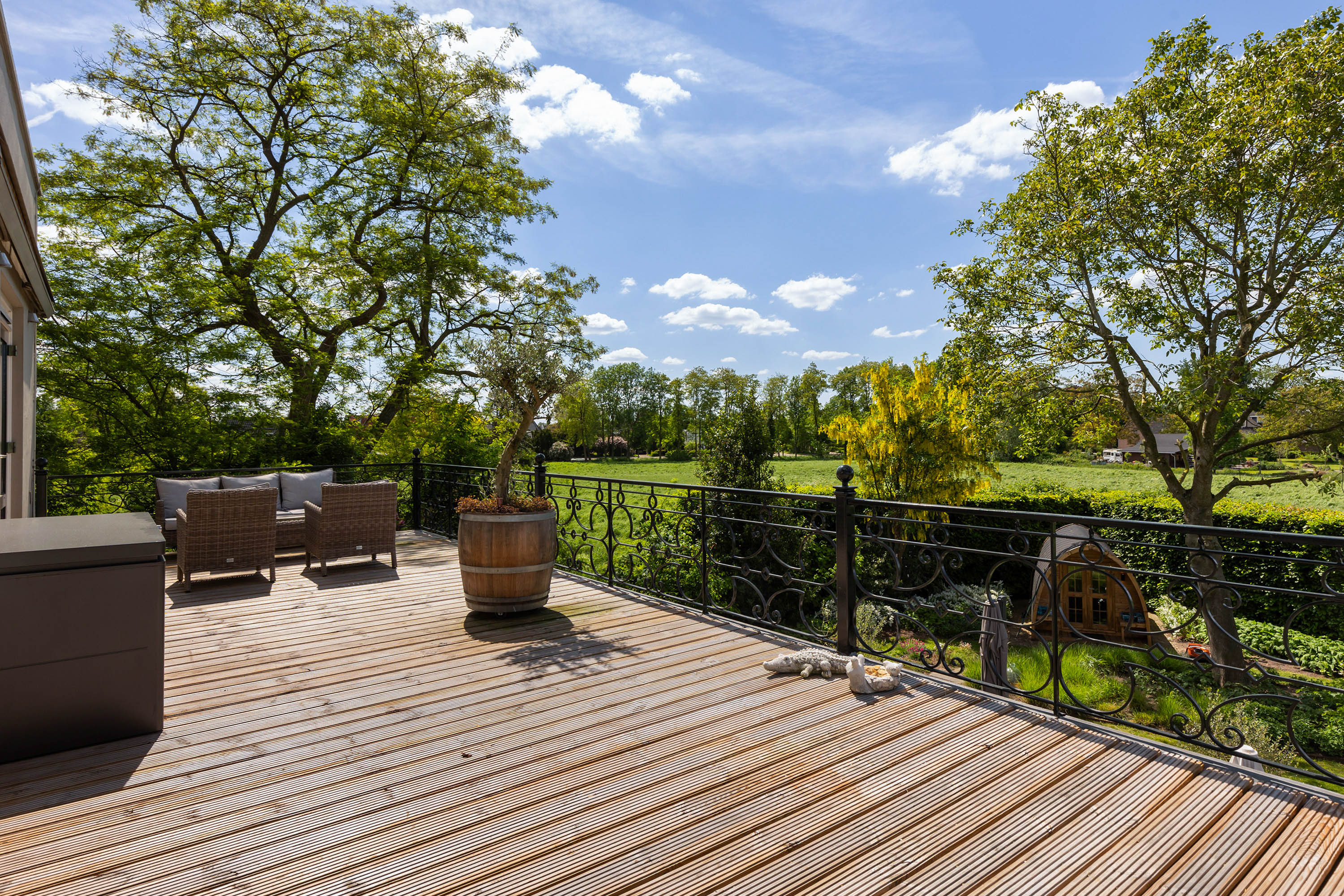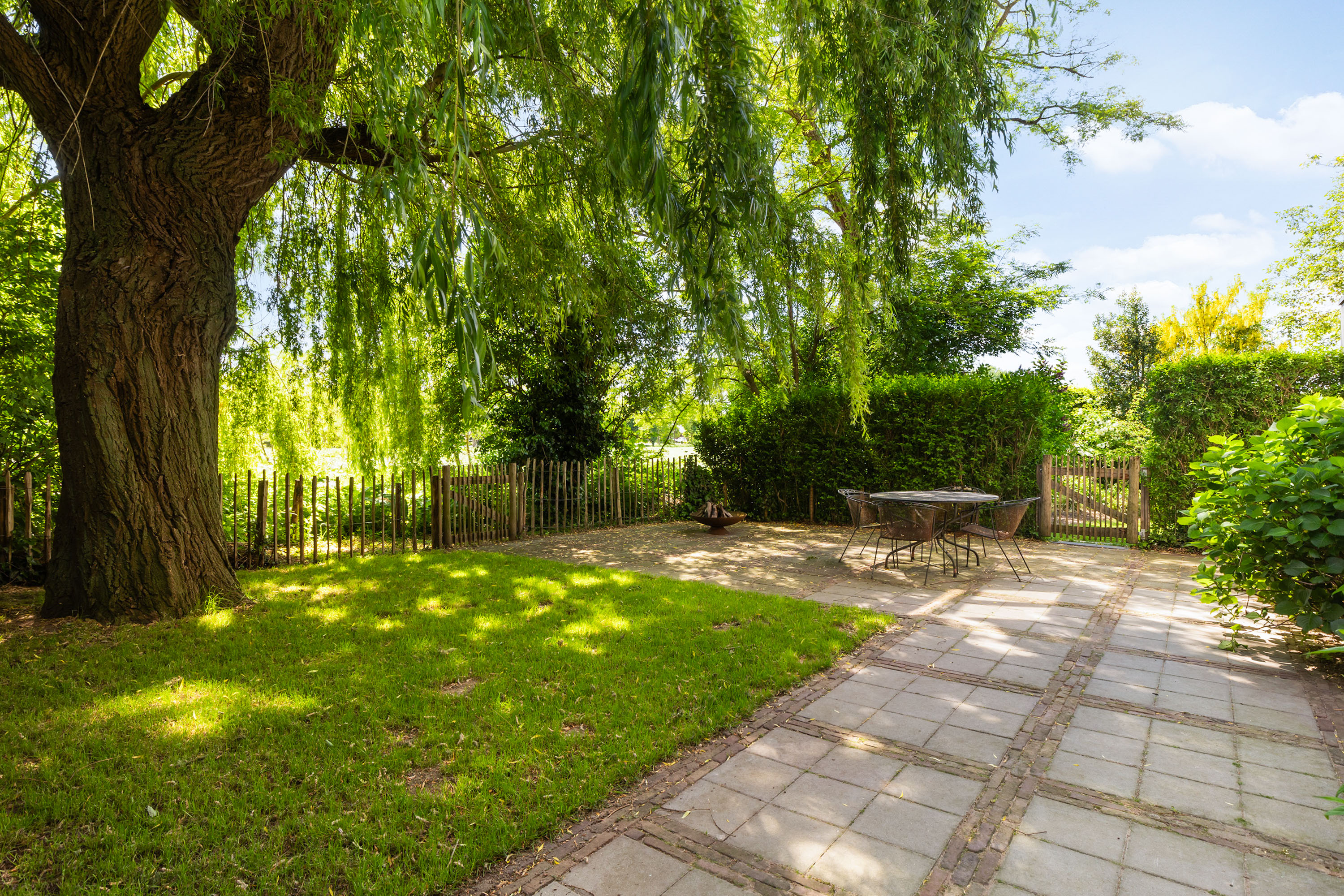 Het buitenterrein vormt een volwaardig verlengstuk van de woning. De tuin, opnieuw aangelegd in 2022, is ontworpen met oog voor rust en functionaliteit. Strakke lijnen worden afgewisseld met natuurlijke beplanting en meerdere terrassen bieden altijd een plek in zon of schaduw. De veranda met houten balkenplafond, voorbereid op buitenkeuken en wellness, maakt het buitenleven bijzonder aangenaam. Aan de zijkant van het perceel ligt een tweede tuin met gazon en een karakteristieke treurwilg, wat bijdraagt aan de groene beleving.