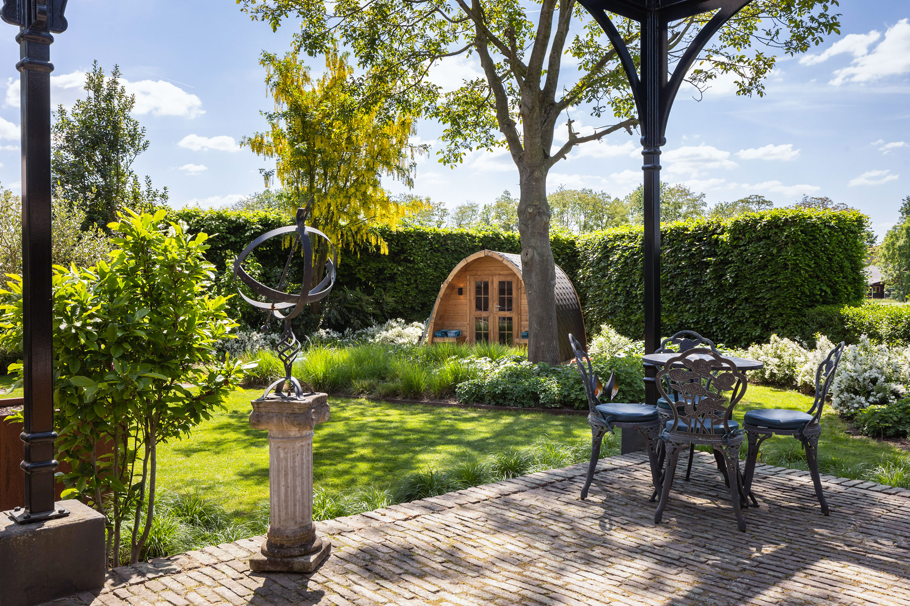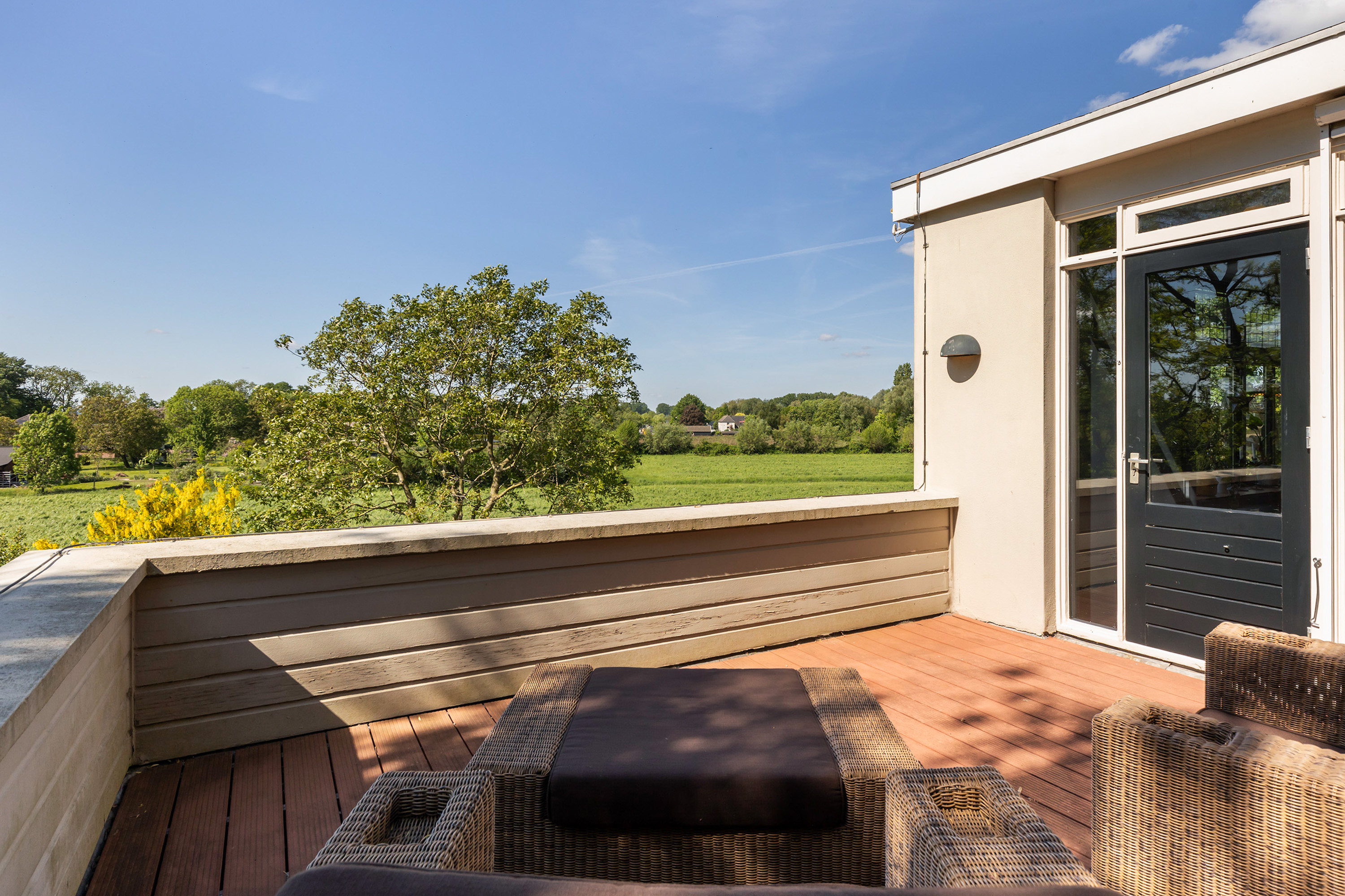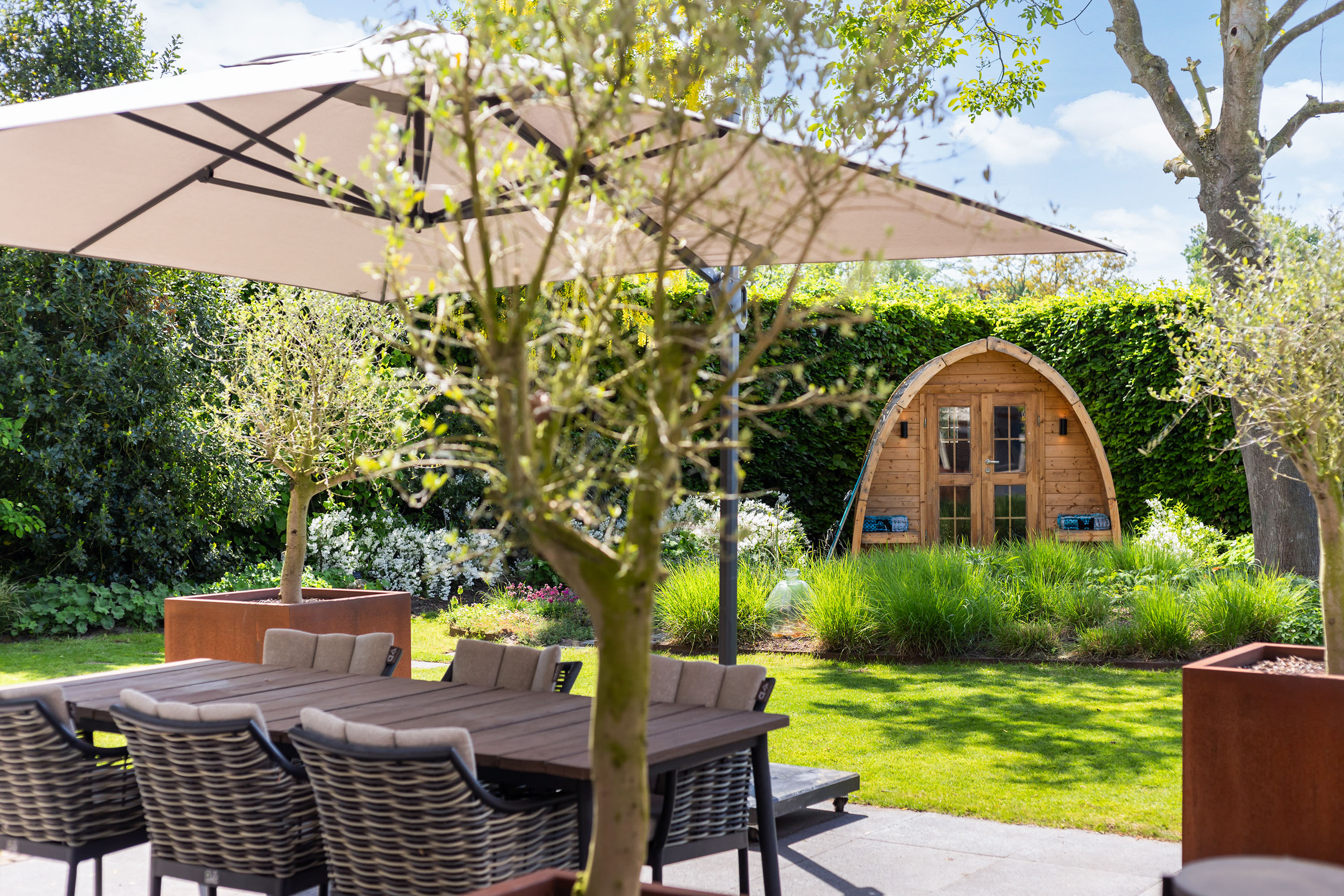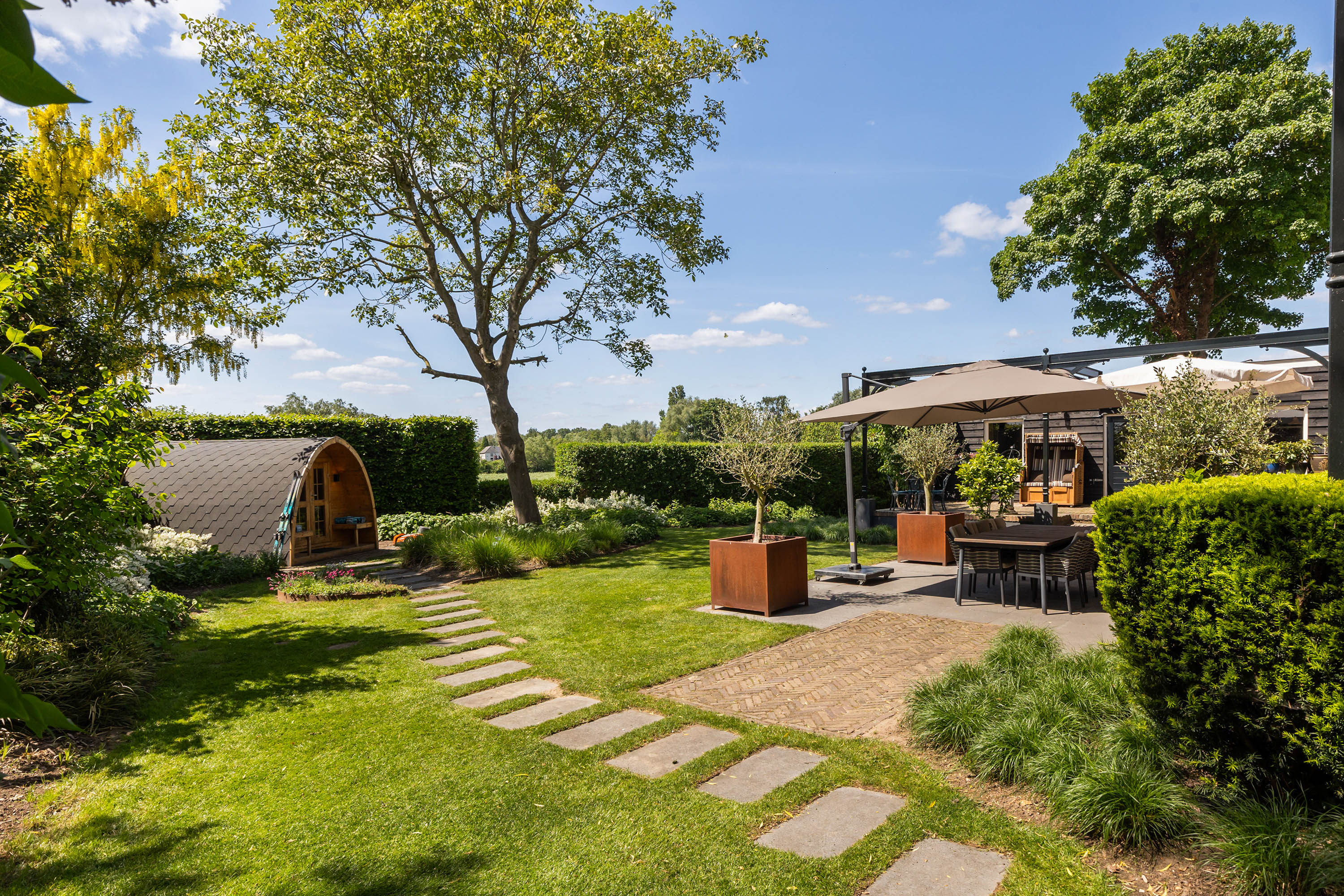Het buitenterrein vormt een volwaardig verlengstuk van de woning. De tuin, opnieuw aangelegd in 2022, is ontworpen met oog voor rust en functionaliteit. Strakke lijnen worden afgewisseld met natuurlijke beplanting en meerdere terrassen bieden altijd een plek in zon of schaduw. De veranda met houten balkenplafond, voorbereid op buitenkeuken en wellness, maakt het buitenleven bijzonder aangenaam. Aan de zijkant van het perceel ligt een tweede tuin met gazon en een karakteristieke treurwilg, wat bijdraagt aan de groene beleving.