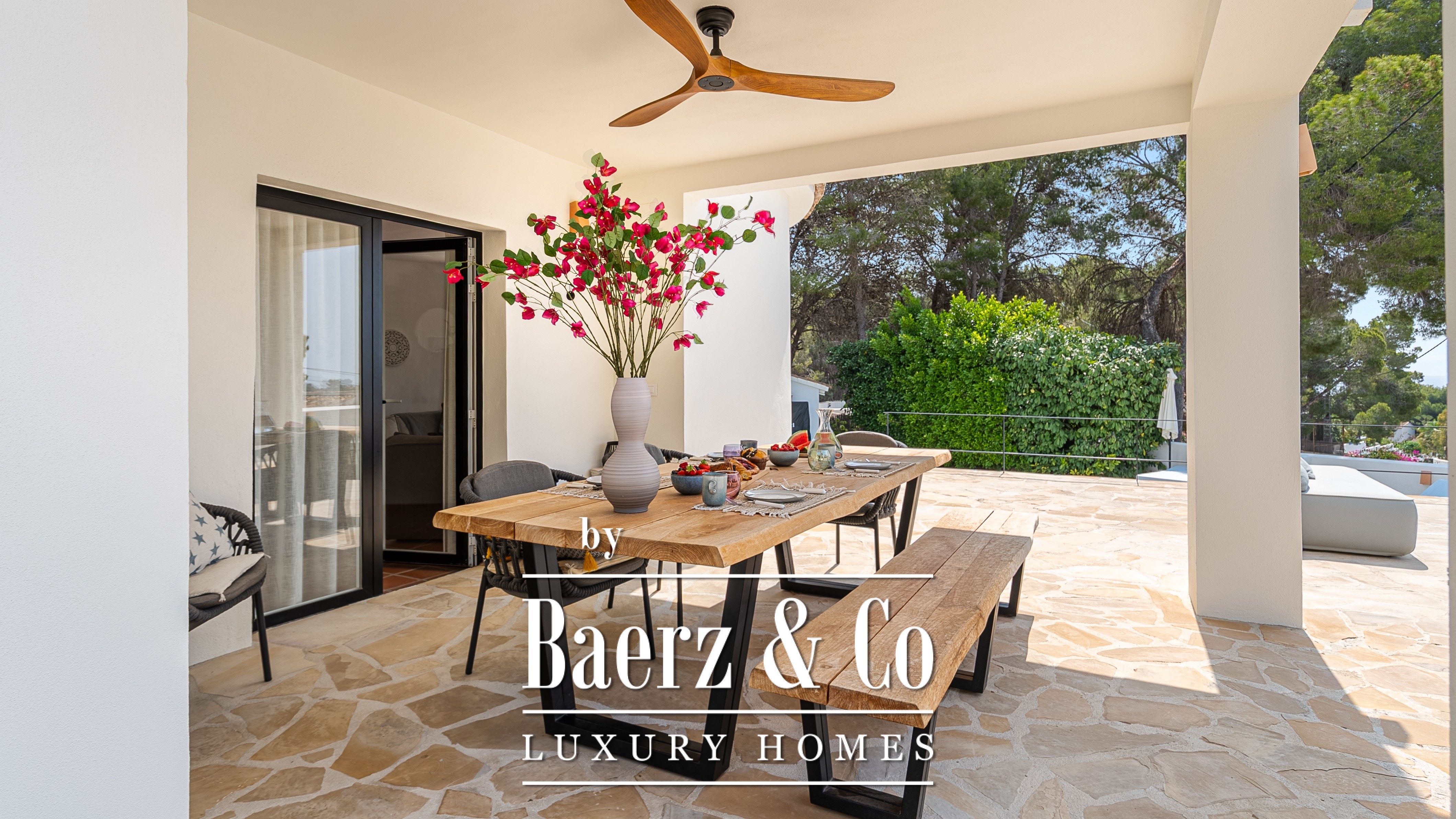 De villa beschikt over vier ruime slaapkamers en drie verfijnde badkamers, waaronder een master suite met een uniek detail: uitzicht op zee, zelfs vanuit de douche – een dagelijkse dosis luxe.