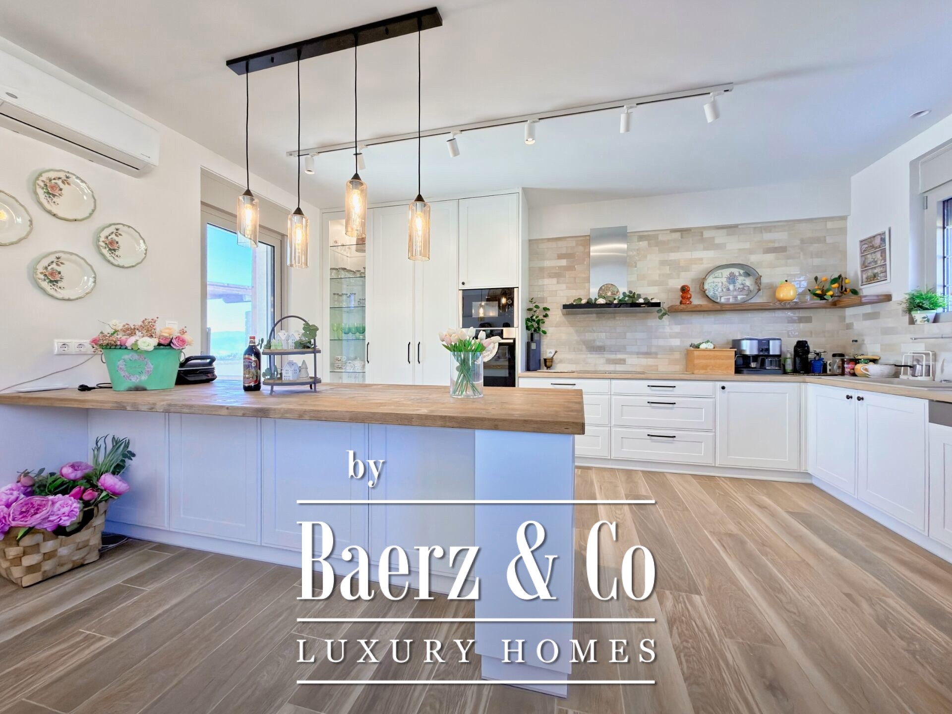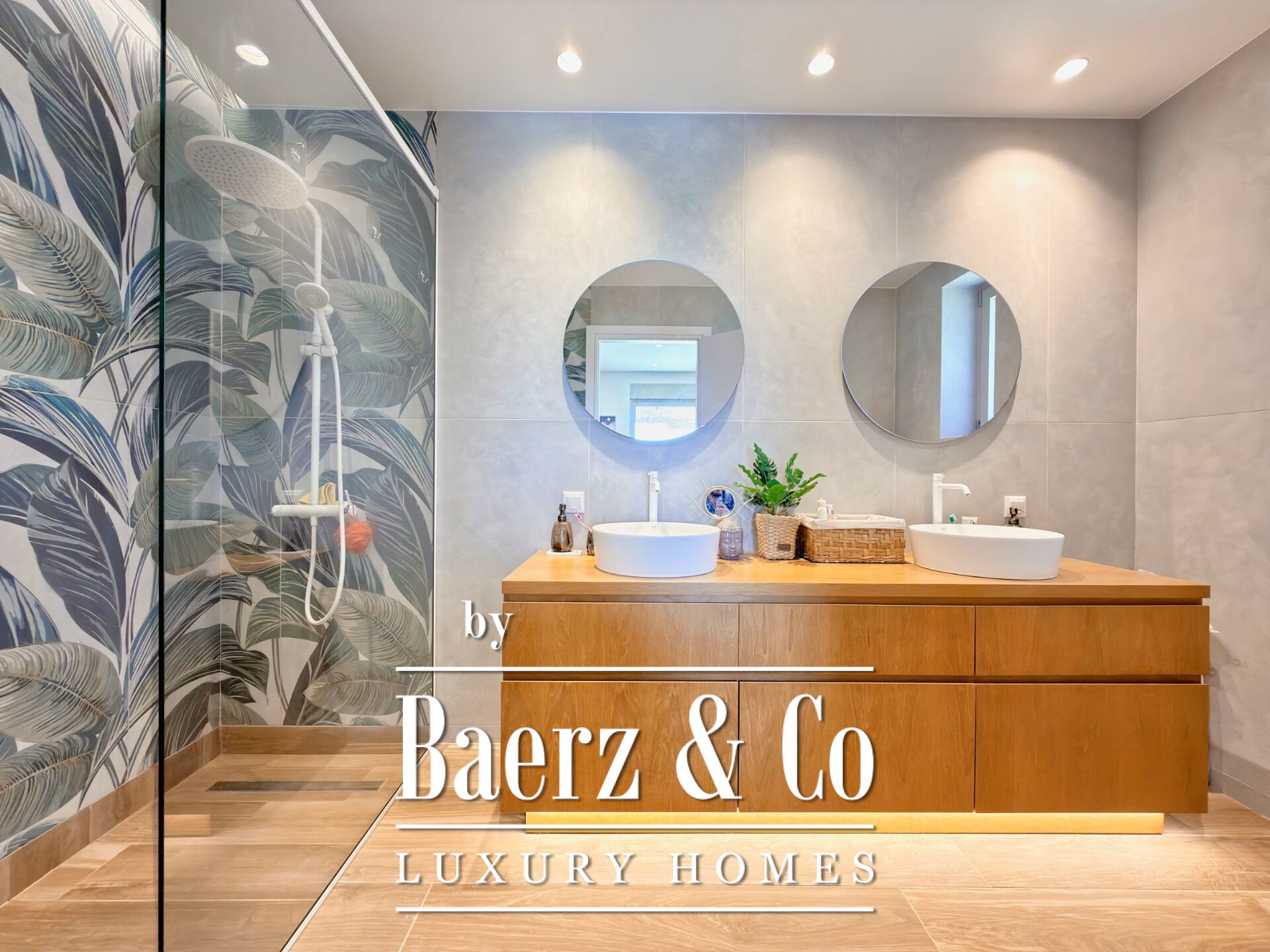 Bij binnenkomst vormt de royale woonkamer het hart van de woning, met een sfeervolle open haard die is opgebouwd uit authentiek natuursteen en doorloopt tot het exterieur. De open keuken, harmonieus verbonden met de leefruimte, combineert comfort met functionele helderheid. Drie ruime masterbedrooms en drie verfijnde badkamers, aangevuld met een extra gastentoilet, bieden optimaal wooncomfort en privacy voor zowel dagelijks gebruik als gastenverblijf. Door het hele huis zorgen dubbele beglazing, energiezuinige ramen, hoogwaardige isolatie en geavanceerde beveiliging voor rust en gemoedsrust.