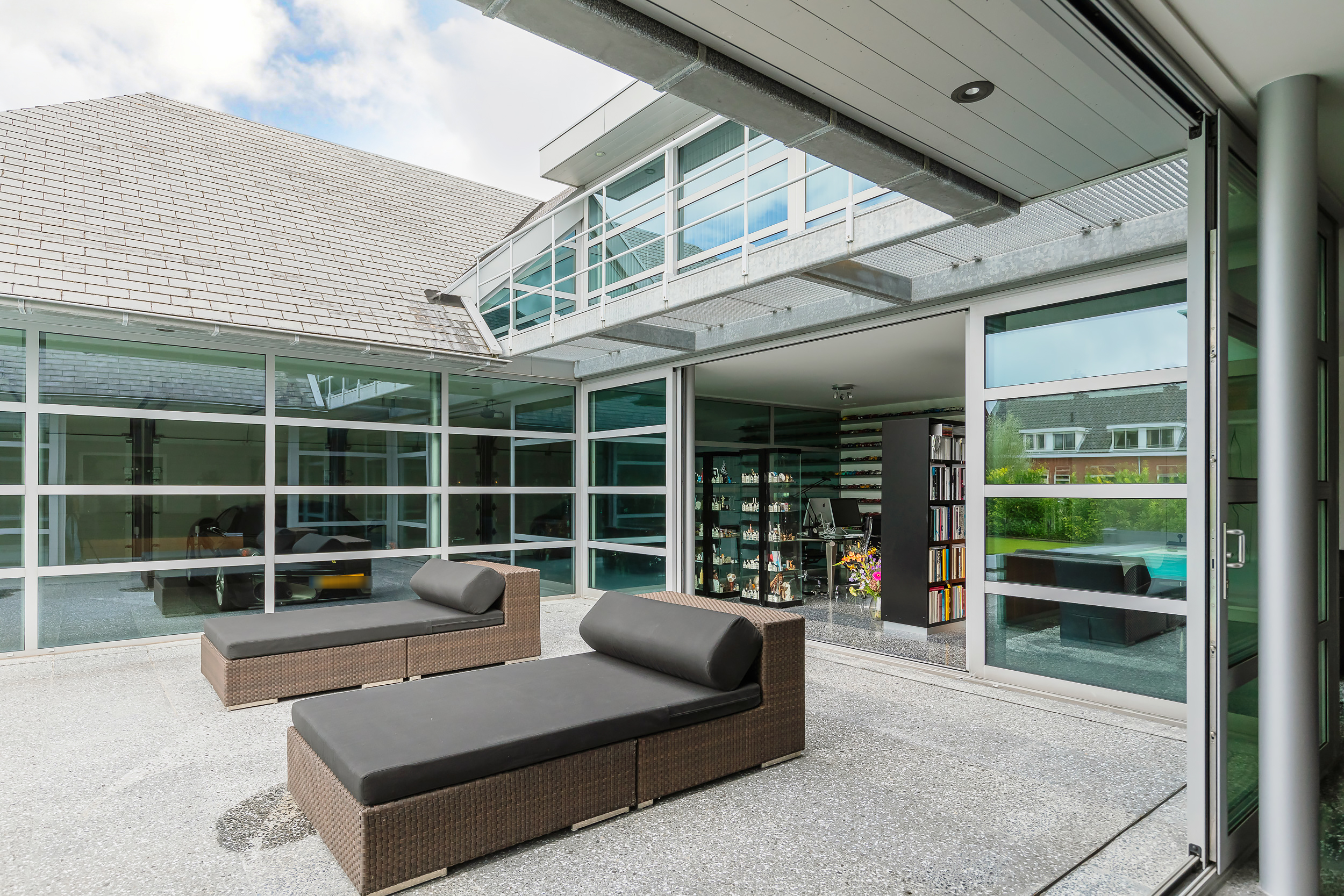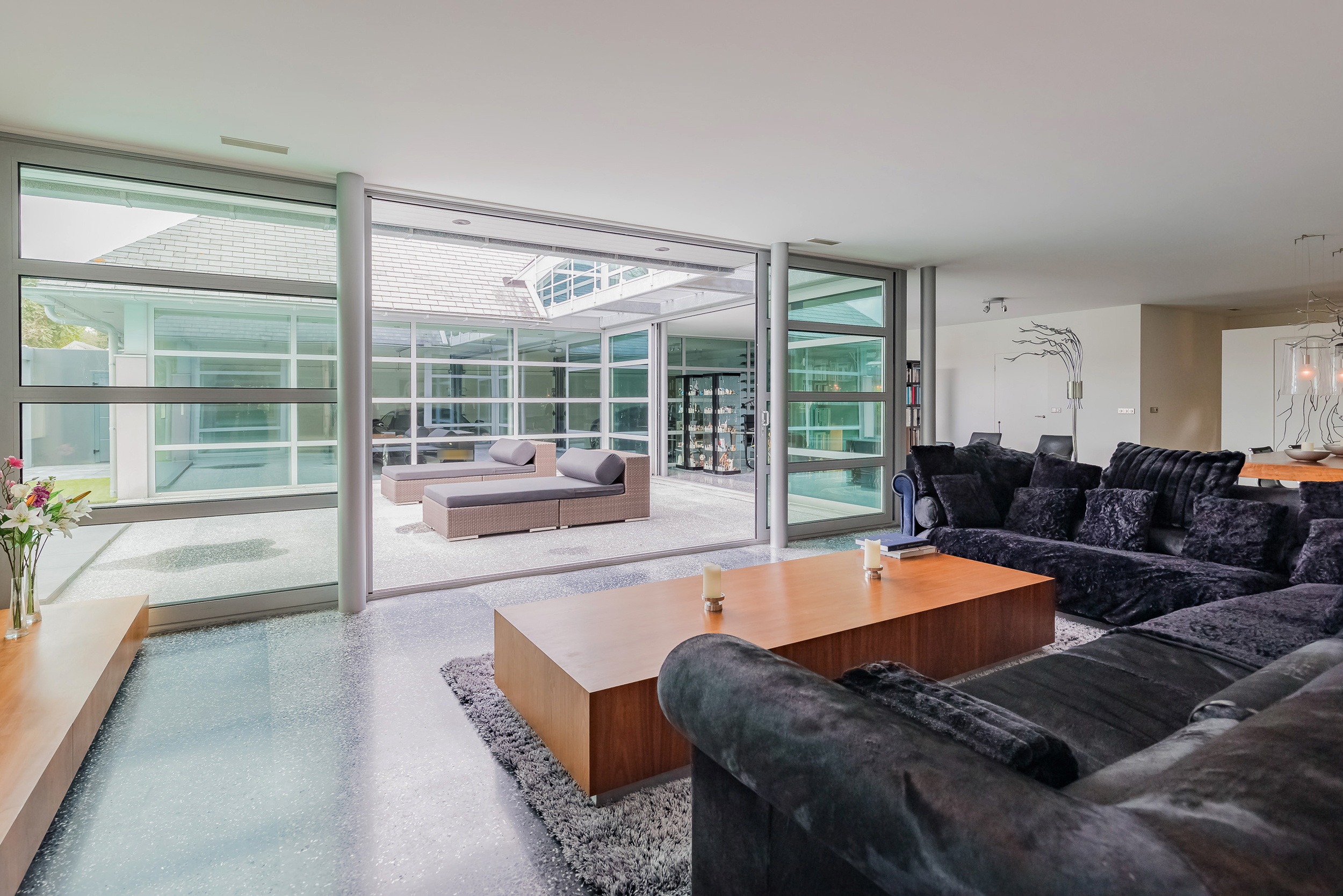 De buitenschil van de U-vormige woning heeft kleine ramen en zorgt hierdoor voor veel privacy, de schuifpuien aan de binnenzijde van de U-vorm zijn volledig voorzien van glas wat voor een overvloed aan lichtinval zorgt.
