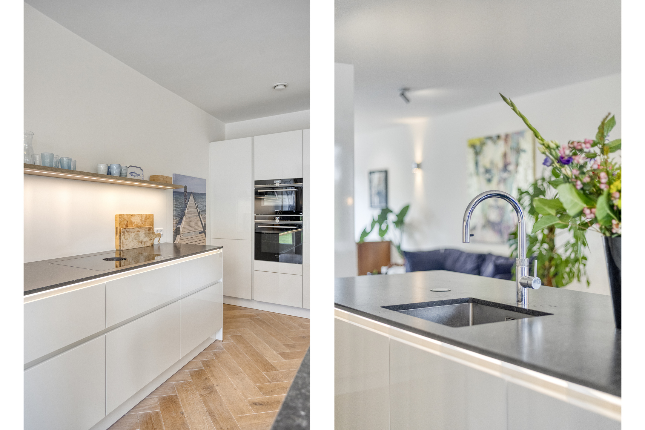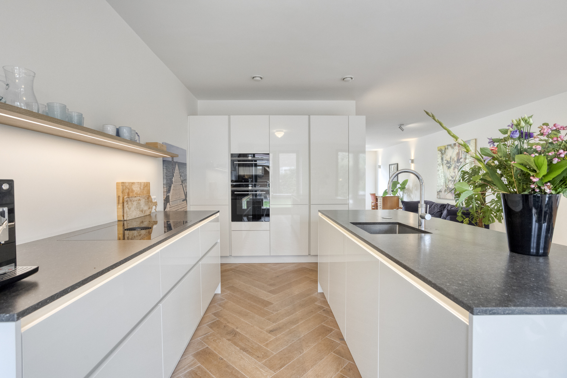 Entree, ruime hal met modern toilet en garderobekast onder de trap. Aan de voorzijde de lichte en ruime L-vormige woonkamer. Aan de achterzijde de riante woonkeuken met kookeiland en luxe inbouwapparatuur (dubbele oven, wijnklimaatkast, fornuis met Bora-afzuigsysteem, Quooker) met twee keer openslaande deuren naar de tuin.