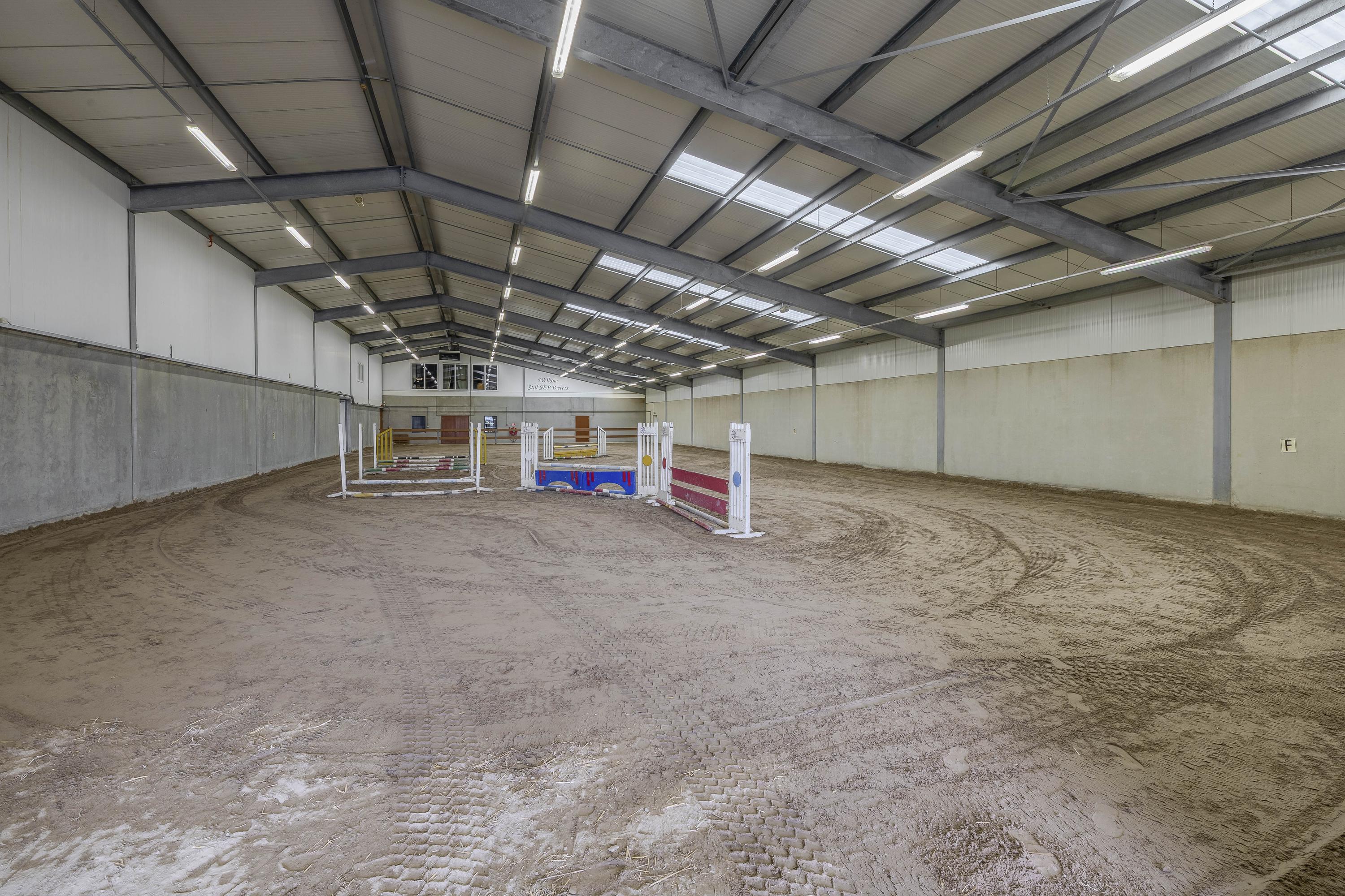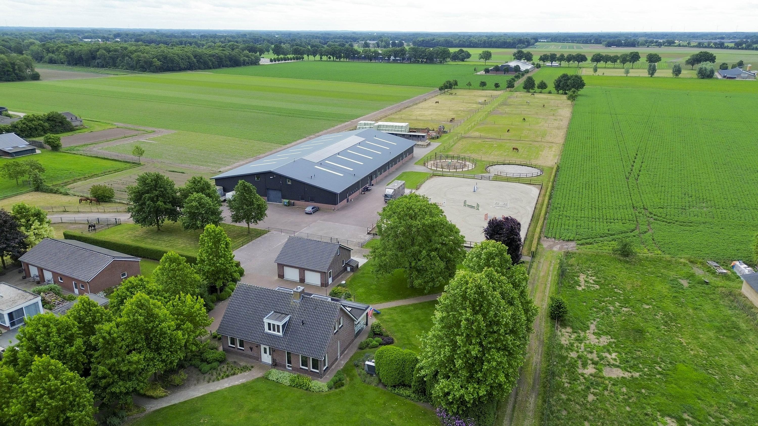 De goed onderhouden hippische accommodatie bestaat uit een vrijstaande rijhal met een binnenpiste (ca. 20x40 mtr.), een stalgedeelte met in totaal 20 paardenboxen, een ontvangstruimte met appartement, een 2e appartement en een loods/werkplaats.. Het erf is verder ingericht met een buitenpiste, 6 buitenstallen, een stapmolen, een longeercirkel, weiland, een mestvaalt. De rijhal is opgetrokken uit metselwerk gevels, stalen spanten en een geïsoleerd dak. De gevels zijn aan de buitenzijde deels gepotdekseld. Lichtdoorlatende platen zorgen voor natuurlijke lichtinval. Aan de binnenzijde zijn de gevels voorzien van betonelementen. De binnenpiste heeft een afmeting van ca. 20mtr. x 40mtr. en is uitgerust met een eb-vloed bodem. Er is een heather aanwezig. De piste is voorzien van verlichting. De wanden zijn van beton. Een roldeur in de achtergevel en een loopdeur in de zijgevel zorgen voor toegang. Het stalgedeelte is uitgerust met maar liefst 20 paardenboxen, waarvan de voorwanden deels zijn uitgevoerd in kunststof en deels in gegalvaniseerd staal. De boxen hebben betonnen tussen- en achterwanden en zijn voorzien van schuifdeuren. Aan de voorzijde van de hal is de loods/werkplaats gelegen welke is voorzien van een betonnen vloer en wanden en een betonplaten plafond. Aan de rechterzijde is de vaste trap gesitueerd naar de ontvangstruimte en het appartement op de 1e verdieping. De ruime ontvangstruimte is voorzien van een PVC-vloer en deels metselwerk/ deels stucwerk gevels. Er is een keukenblok gesitueerd welke is uitgerust met een gootsteen en een koelkast en bergruimte. De slaapkamer beschikt over dezelfde afwerking als de ontvangstruimte. De badkamer is uitgerust met een douche en een wastafel. Ook is er een zwevend toilet aanwezig. Vanuit de ontvangstruimte is er een fraai zicht op de binnenpiste. In de berging zijn de aansluitingen voor de wasapparatuur, de unit voor de vloerverwarming, de opstelling voor de CV-ketel (Nefit Topline) en de omvormer voor de zonnepanelen gesitueerd. De stro opslag aan de achterzijde van de rijhal is afgewerkt met een betonnen vloer. De voersilo is hier gesitueerd. Een roldeur aan de achtergevel en een loopdeur zorgen voor toegang tot het erf. Het dak is geïsoleerd.