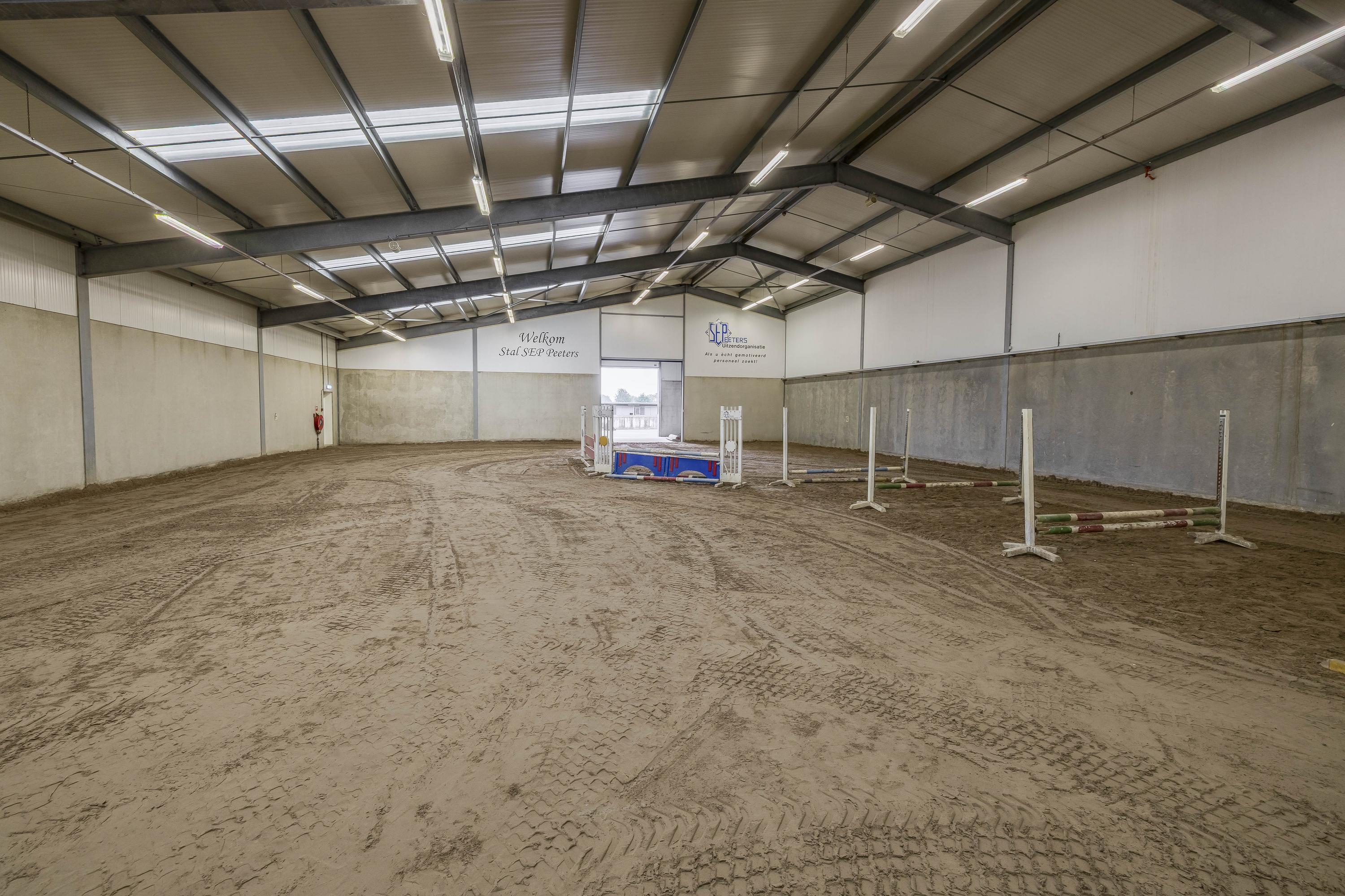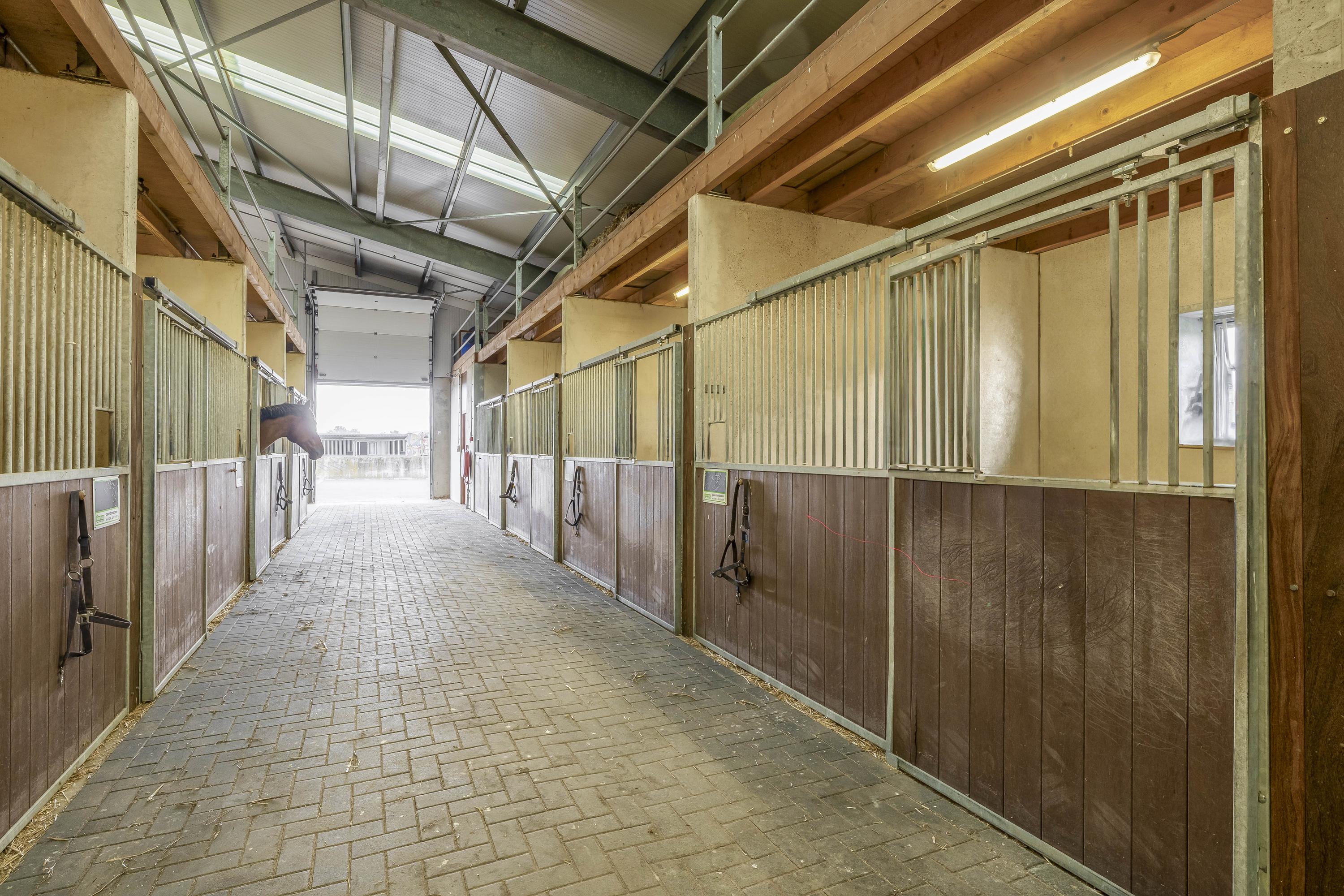 Middels een loopdeur is er toegang tot de stal. Een roldeur zorgt dan weer voor toegang tot de binnenpiste. Er zijn praktische magazijnopstellingen opstellingen gesitueerd. Er is krachtstroom aanwezig en een hogedrukleiding voor het reinigen van de stallen. Een elektrische roldeur en een loopdeur zorgen voor toegang tot het erf. Openslaande deuren zorgen voor toegang tot de rijhal. Daarnaast zijn 10 boxen uitgerust met praktische buitenluiken. Een groot voordeel is de hooizolder met handige hooiluiken, strategisch boven de stallen geplaatst, waardoor hooi en stro eenvoudig direct in de boxen kunnen worden gegooid. Verder draagt de aanwezige sleepketting voor de mest bij aan extra gemak en efficiëntie in het onderhoud van de stallen. Naast de stallen is een douche- en toiletruimte voor heren en dames gesitueerd. Ook zijn er 3 wasplaatsen aanwezig, welke zijn voorzien van een warm- en koud watervoorziening. Via een separate ingang, gelegen naast de zadelkamer is het appartement bereikbaar. Het appartement is afgewerkt met een vinylvloer, deels metselwerk / deels stucwerk wanden en een systeemplafond. Er bergruimte onder de dakschuinte gecreëerd. De woonkamer van het appartement is uitgerust met een keukenblok. Vanuit deze ruimte is er zicht op de binnenpiste. De slaapkamer is voorzien van een praktische inbouwkast. De badkamer is ingericht met een douche, wastafel en een toilet en is geheel betegeld.