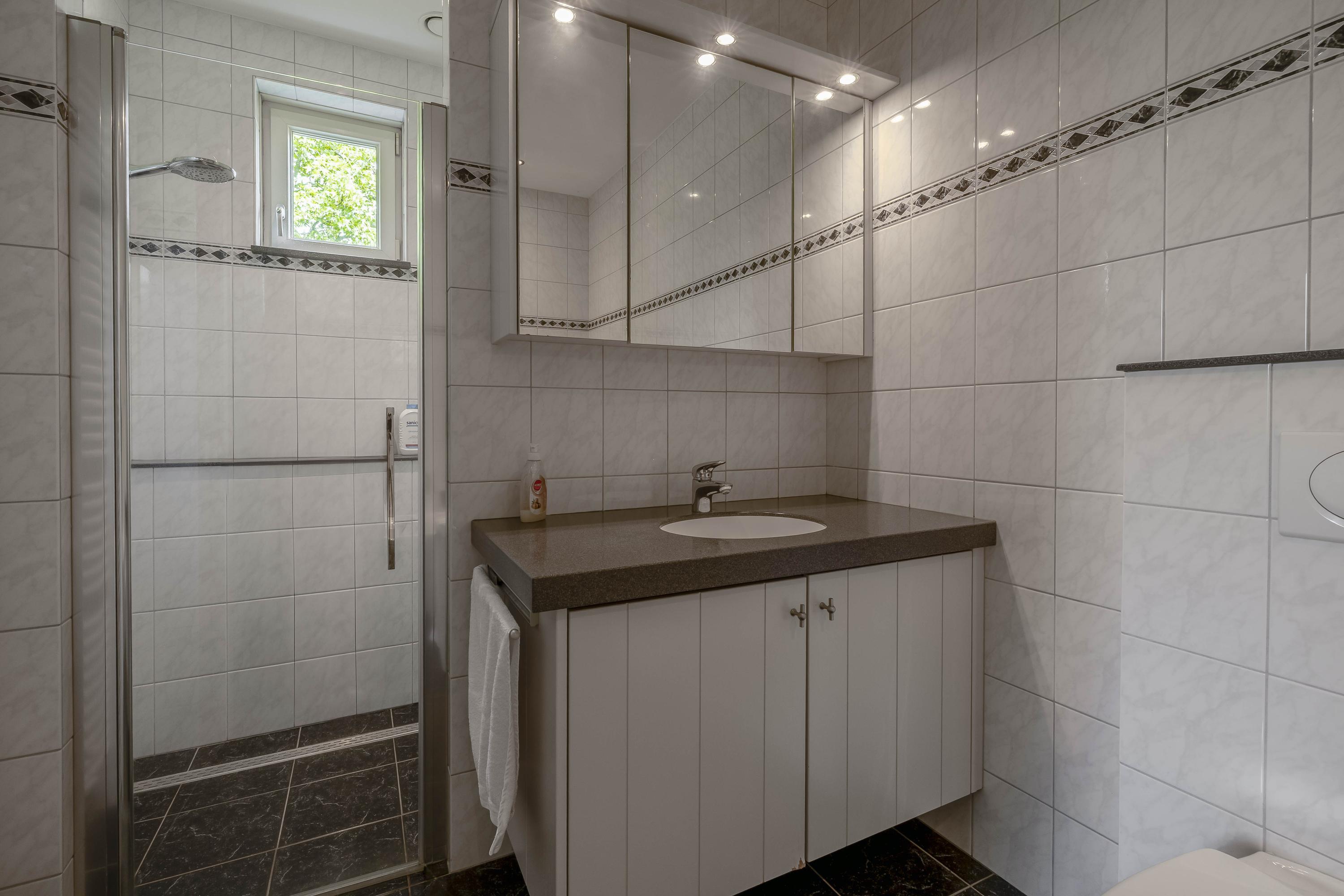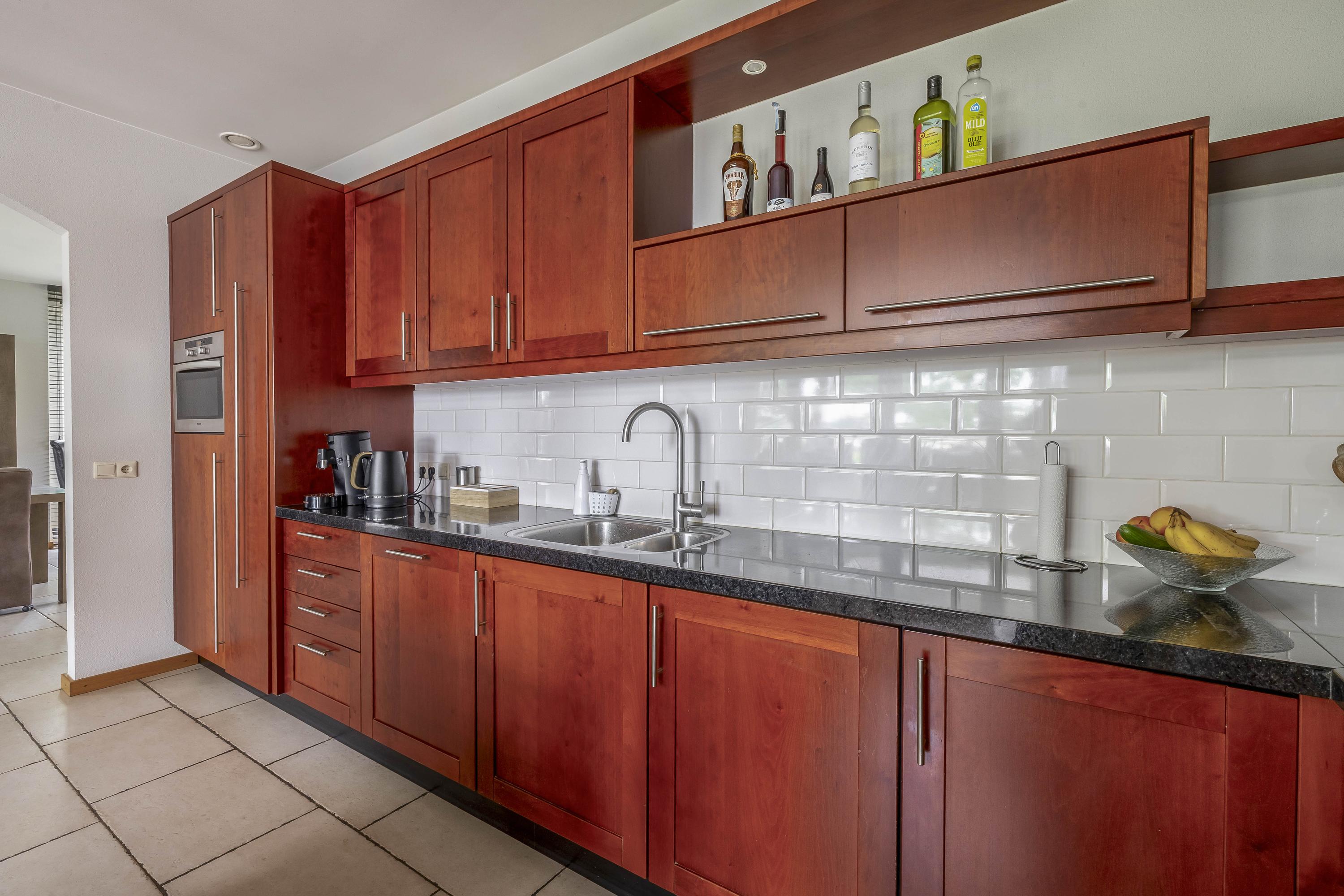 De woonkamer is afgewerkt met een tegelvloer, strakke stucwerk wanden en een stucwerk plafond met inbouwverlichting. Grote raampartijen tot aan de grond zorgen voor veel lichtinval en een ruimtelijk gevoel. De aanwezige gashaard voegt extra warmte en sfeer toe aan de ruimte. Daarnaast bieden openslaande deuren directe toegang tot het overdekte terras, waardoor binnen en buiten in elkaar overlopen. Vanuit de woonkamer is er toegang tot de keuken. De keuken is eveneens voorzien van een tegelvloer, stucwerk wanden en een stucwerk plafond. De keukeninrichting is in een hoekinrichting geplaatst en verder uitgerust met diverse inbouwapparatuur zoals een combimagnetron, vaatwasser, een spoelbak, inductiekookplaat en een koelkast. Diverse kasten zorgen voor voldoende opbergruimte. In de kast is een stortkoker voor de was gesitueerd. Ook hier zorgen openslaande deuren voor toegang tot het overdekte terras. De praktische bijkeuken is voorzien van een tegelvloer en een stucwerk plafond. De ruimte is geheel betegeld. De bijkeuken is uitgerust meteen keukenblok met kasten en een spoelbak. De aansluitingen voor de wasapparatuur zijn hier gesitueerd. De toiletruimte is eveneens geheel betegeld en verder voorzien van een zwevend toilet en een fonteintje. De woning beschikt over een slaapkamer met badkamer en-suite op de begane grond, hierdoor is de woning levensloopbestendig. De slaapkamer is afgewerkt met een laminaatvloer, spachtelputz wanden en een stucwerk plafond. Twee praktische inbouwkasten zorgen voor opbergruimte. Raampartijen zorgen voor natuurlijke lichtinval en ventilatie. De ruime badkamer en-suite is geheel betegeld en verder uitgerust met een ligbad, douche, wastafel met wastafelmeubel en een zwevend toilet.