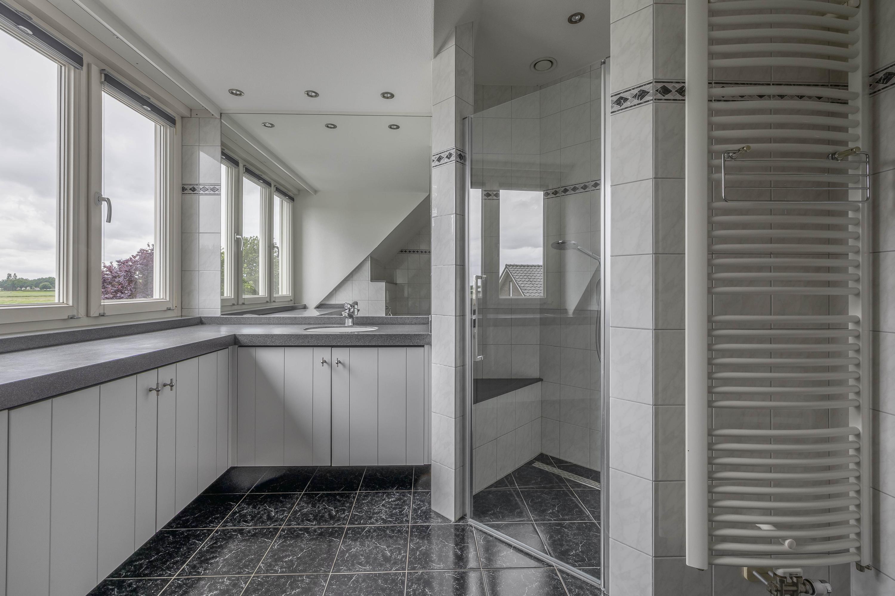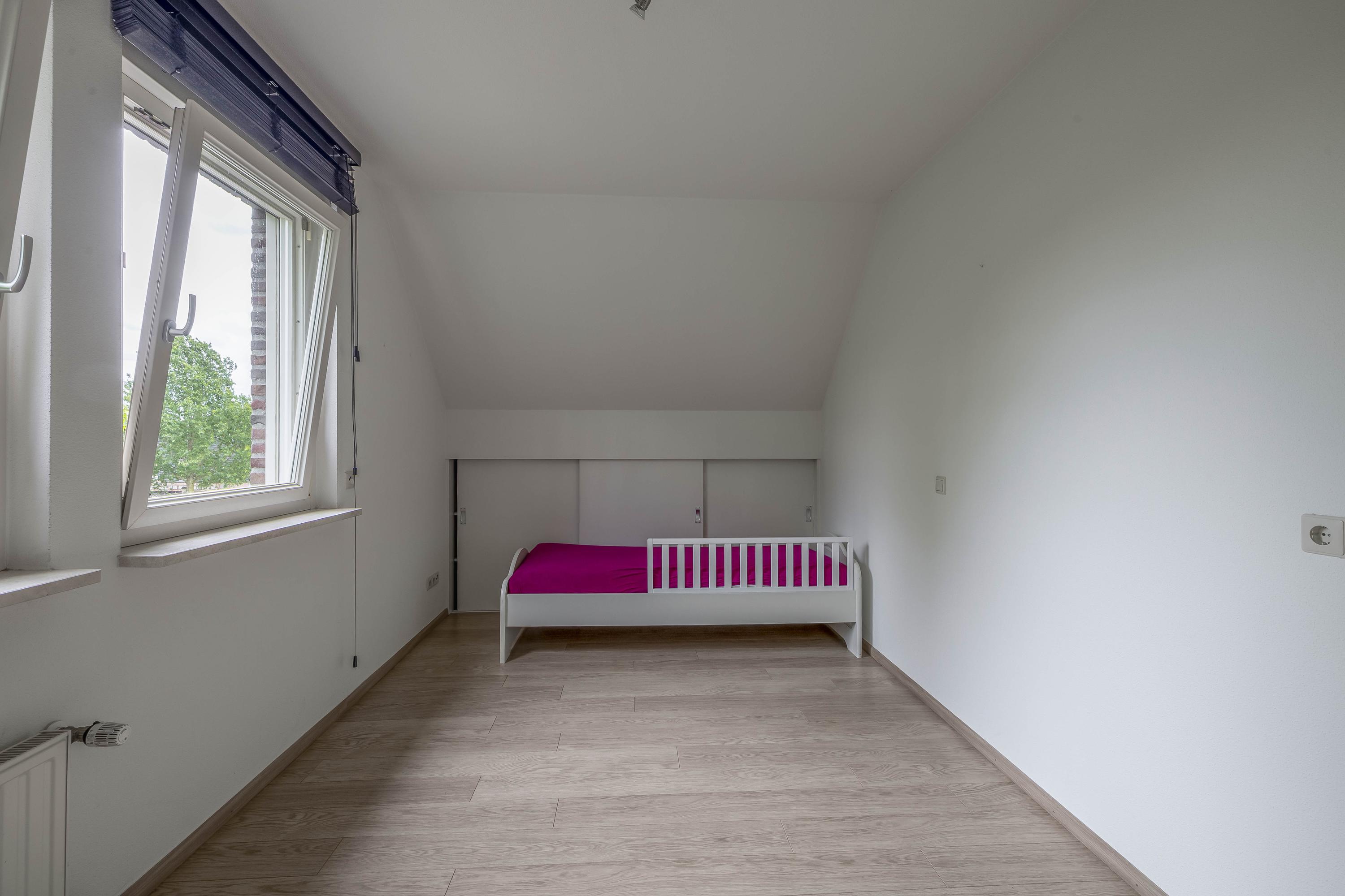 De ruime overloop met vide biedt toegang tot 3 slaapkamers, een badkamer en een technische/stookruimte. In de technische ruimte is het stofzuigsysteem, de WTW-installatie en de boiler gesitueerd. Slaapkamer I en III zijn beiden voorzien van een laminaatvloer, spuitwerk wanden en een spuitwerk plafond. In beide ruimtes is bergruimte gecreëerd onder de dakschuinte door middel van praktische schuifkasten. Twee ramen in de kopgevel zorgen voor natuurlijke lichtinval. Slaapkamer II is eveneens voorzien van een laminaatvloer, spuitwerk wanden en een spuitwerk plafond. Een dakkapel zorgt voor natuurlijke lichtinval en ventilatie in de ruimte. De ruime, geheel betegelde badkamer is uitgerust met een ligbad, wastafel met wastafelmeubel, douche, toilet en een designradiator. Een praktisch pluspunt van deze badkamer is de handige stortkoker voor de was. De koker mondt uit in de keuken, waardoor de vuile was direct beneden terechtkomt, dicht bij de wasapparatuur. Dit maakt het doen van de was een stuk efficiënter en zorgt voor extra gemak.