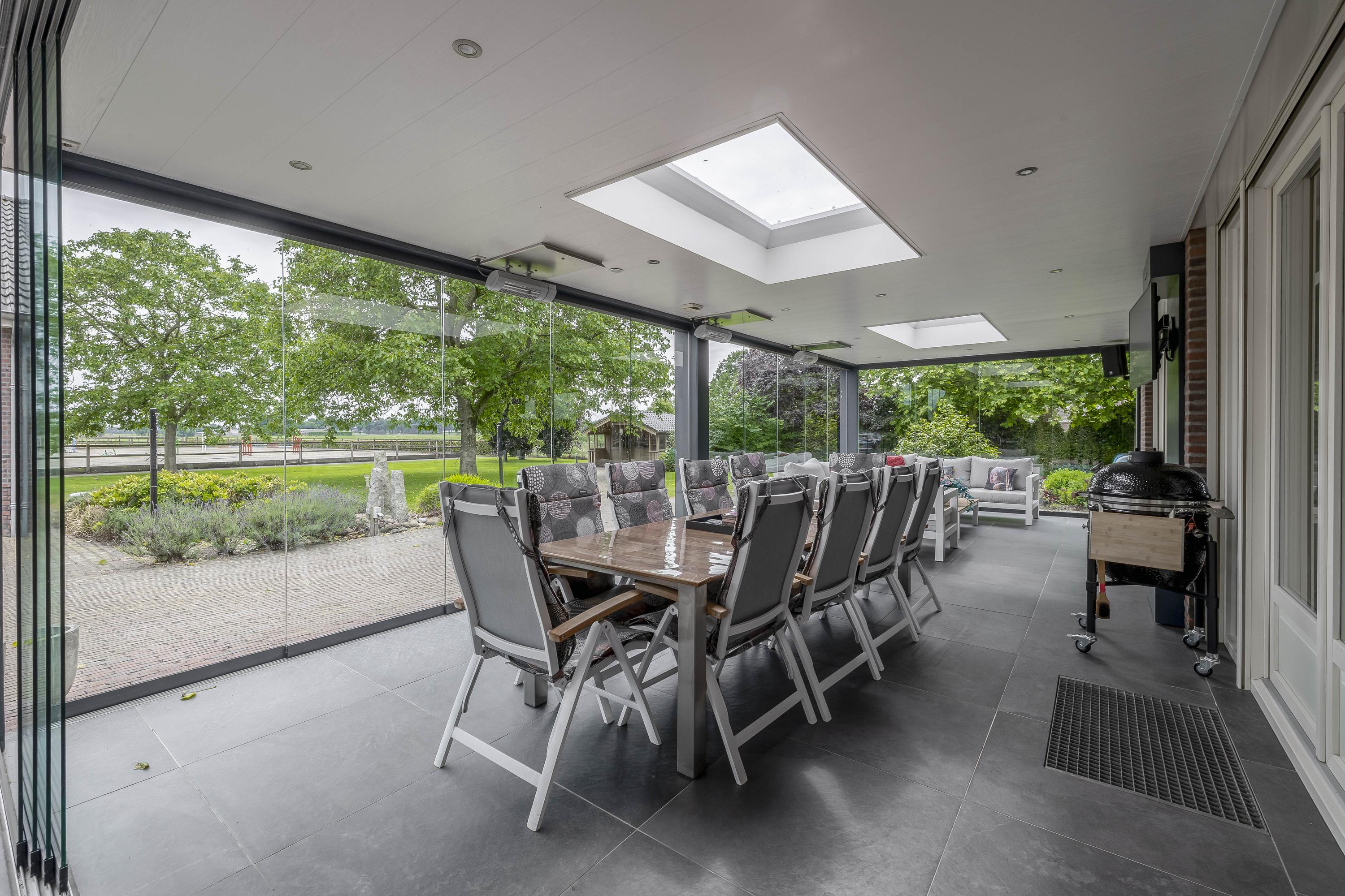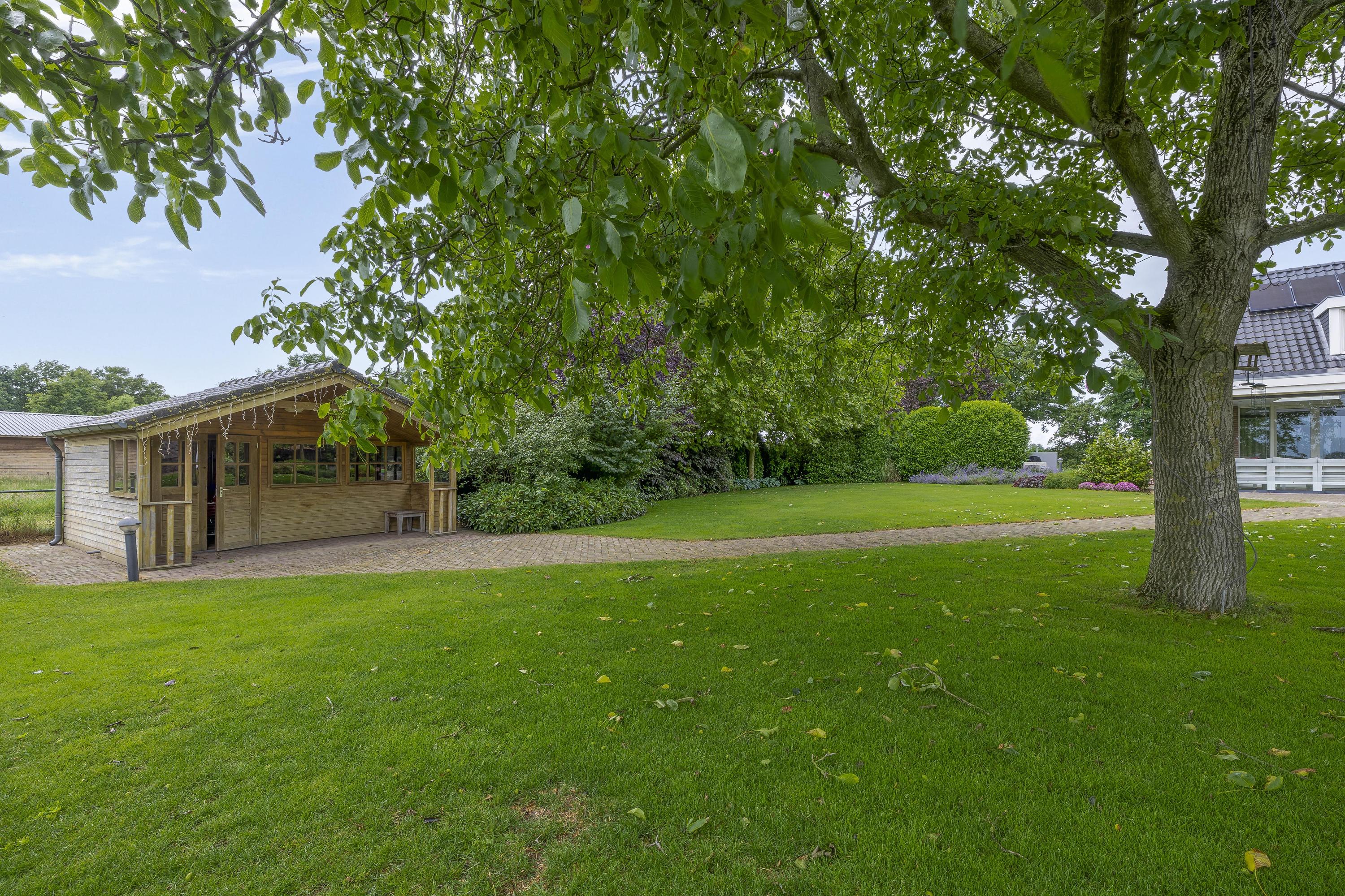 De tuin is voorzien van een royaal overdekt terras met glazen schuifwanden, zodat u het hele jaar door kunt genieten van het buitenleven. Vanuit het terras heb je een fraai uitzicht op de tuin en zelfs op de buitenpiste. Daarnaast is er een tuinhuis, een uitgestrekt gazon en diverse volwassen bomen en struiken aanwezig. Voor extra gemak beschikt de tuin over een beregeningsinstallatie. Het erf is grotendeels voorzien van betonklinkers. Een gedeelte, de weg tot aan de garage is afgewerkt met gebakken klinkers. Het deel vanaf de weg, naast de stal en tot aan de achterzijde van de stal is voorzien van gebroken asfalt. Er zijn 2 opritten aanwezig, er is een aparte oprit die toegang biedt tot de accommodatie.