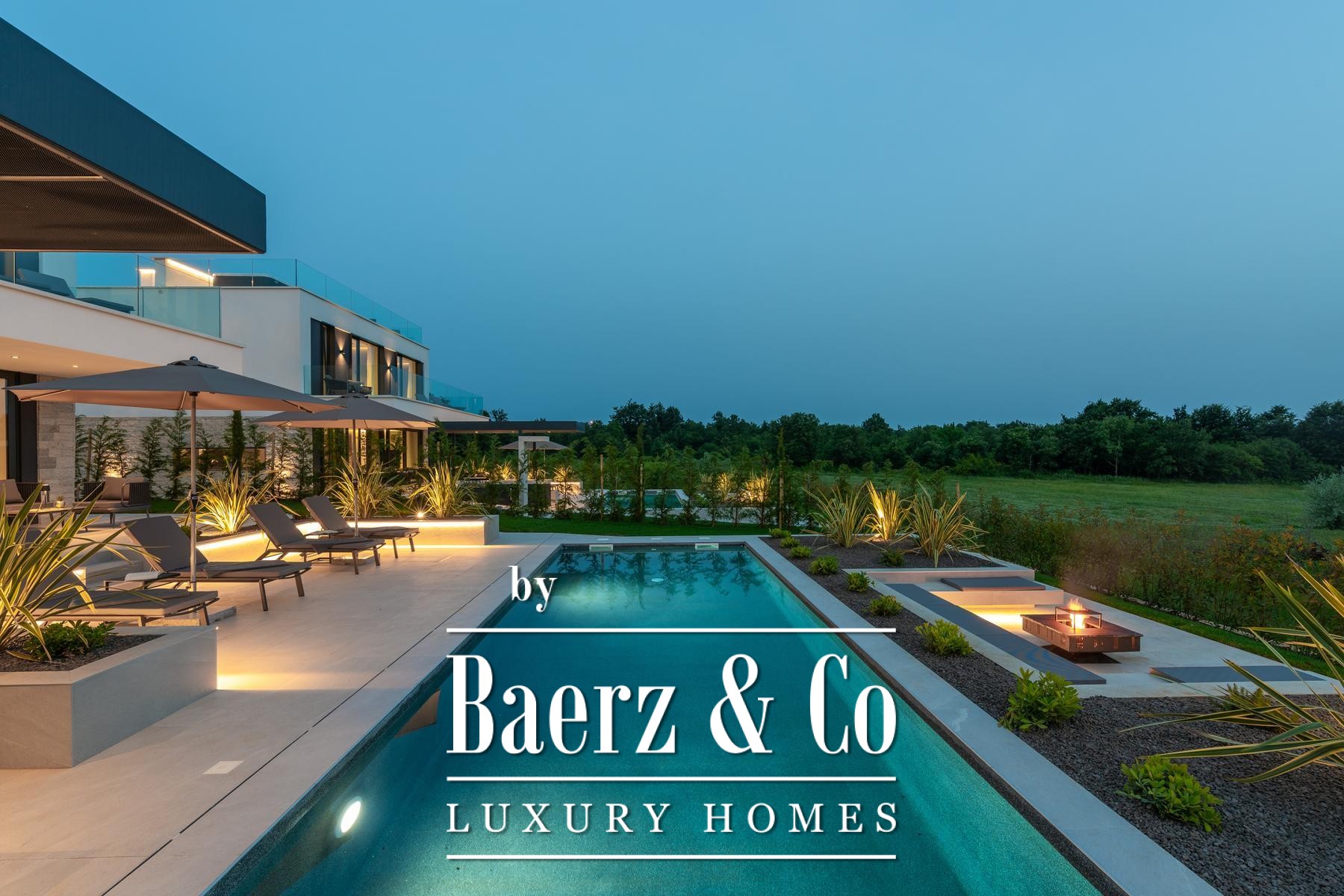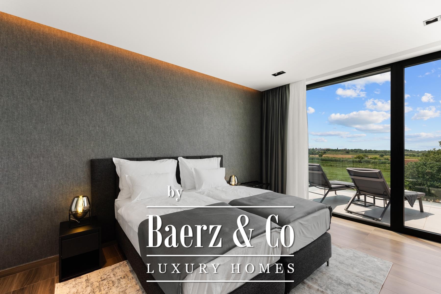 Villa Parenzo One This beautiful complex of houses is located on an area of 3730 m2 in the village of Kukci, in the immediate vicinity of the city of Poreč. It consists of 4 free-standing, fully furnished and equipped buildings with a view of the open sea (as the crow flies, about 2 kilometers). Four identical houses, each built on its own plot, with modern architecture, clean lines and a very pleasant and functionally designed interior. Many design details in the villa area make the living space great for rest and relaxation. Each of the 4 villas is equipped with the same high-quality equipment and household appliances. The ground floor consists of an entrance hall, a staircase for access to the first floor and the roof terrace, a living room, a kitchen and a dining room, a bedroom with a separate bathroom, an additional toilet, a bathroom and a sauna, a technical room with a laundry room, a storage room and an outdoor toilet, each of which has a separate entrance. On the first floor there is a staircase, a corridor, three bedrooms with separate bathrooms and an additional room (gym, playroom, etc.). Staircase for access to the roof terrace, where there is an outdoor bar, a sun deck and a hot tub. In the environment there is an outdoor heated pool, a sunbathing area, a covered terrace for dining, a canopy with a summer kitchen and an uncovered terrace directly next to the pool. There is a fire pit in the lower part of the yard. In the courtyard there is also a designer outdoor shower with hot water and a floor siphon. Heating: Vaillant, external air-water heat pump powered by electricity - 10.3 kw heating system and energy class A++ hot water preparation, with an additional machine room in the house and a 300-liter boiler and circulation. Underfloor heating in all rooms with separate room/bathroom regulators. Possible remote control via Wi-Fi network. Cooling/reheating: A Samsung Multi Split system with two outdoor units and 6 indoor units was installed. Equipped with the possibility of cooling and heating the space. Additionally, the devices have Wind-freeTM technology for pleasant airflow. Possible remote control via Wi-Fi network. Equipment: • Premium Duravit sanitary equipment, Grohe faucets, Geberit and Tece drainage systems, Grohe cisterns, Walk-in shower. • Top quality ceramics from the most famous Italian manufacturers (Graniti Fiandre, Panaria, Keope, Love). In the bathrooms, large-format ceramics, placed up to the ceiling. • Built-in system for softening water from the water supply network. • Built-in high-end Ajax alarm system with motion sensor, water leak detector and fire detector. Version in black. • DVC video