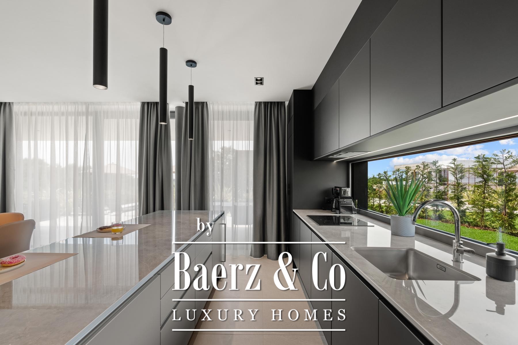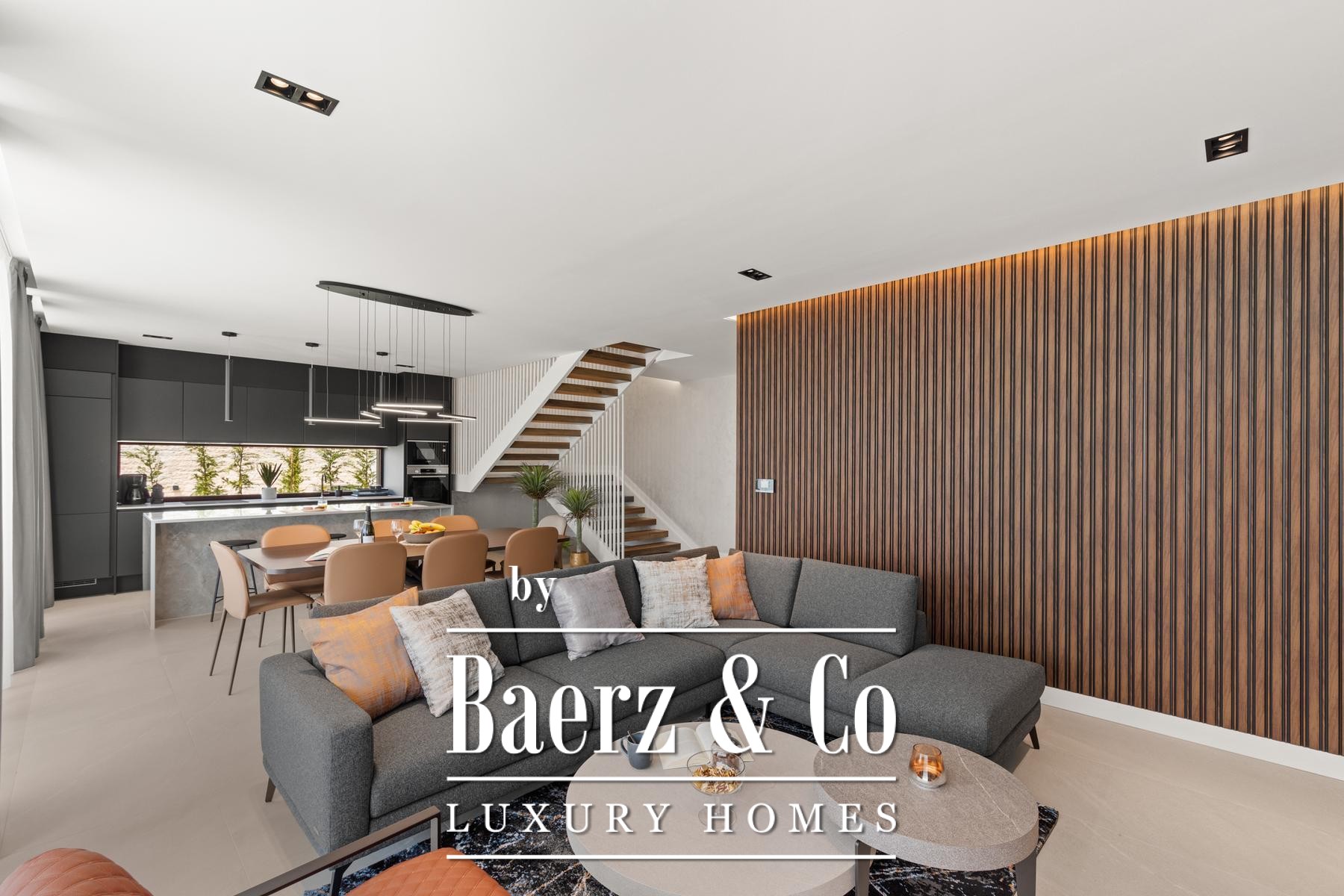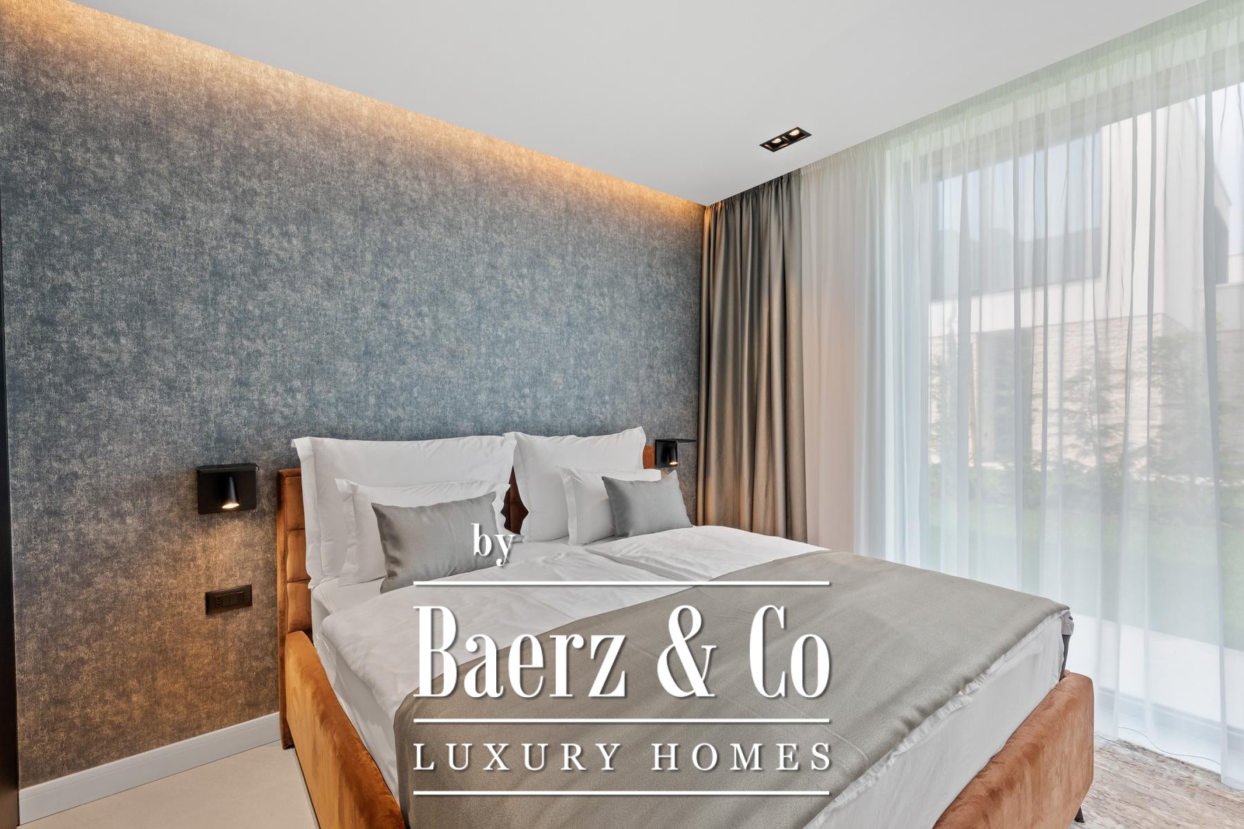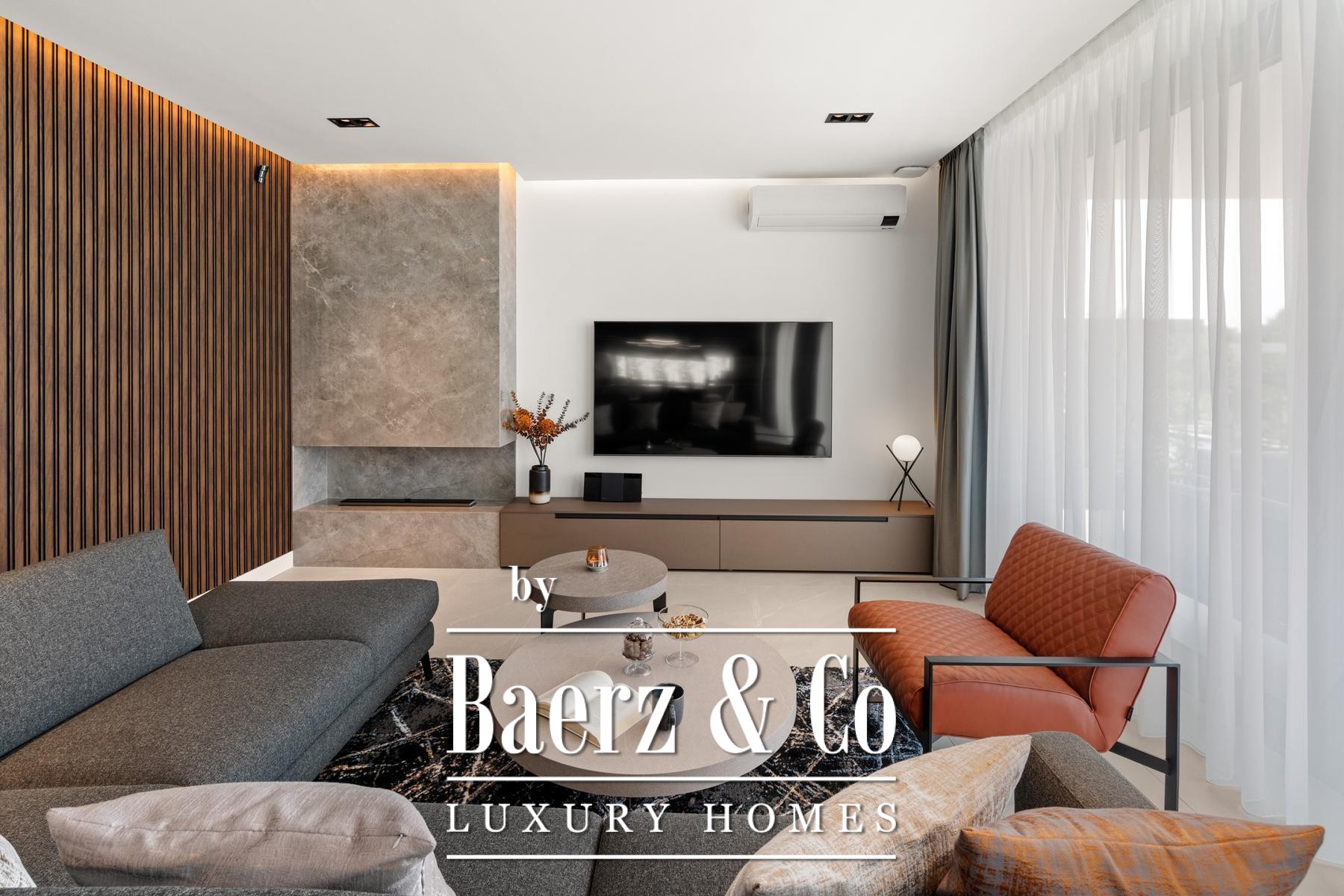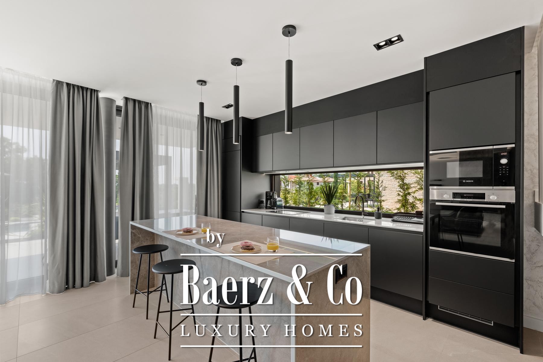 surveillance with 2 TB HDD recorder and 4 external IP cameras with 5 Mpx. • Lighting from the Austrian manufacturer Eglo. • Internal switches, buttons and sockets of the Italian brand Bticino from the Legrand group. • Built-in complete antenna and satellite system for each room. • Built-in additional Wi-Fi signal boosters in the house and on the outdoor terrace. • Internal doors of the well-known Italian manufacturer Braga with hidden hinges and magnetic locks, 44 mm wide, Bianco Matrix design with black Prisma handles. • Video intercom with control of opening the front door and electronic control. the gate. • Wallbox charger for charging Mercedes-Benz electric cars up to 22 kW. • Bio fireplace in the living room. • External channels and drains on terraces and balconies of the top German manufacturer Aco. • Glass railing on the balcony and roof terrace. Kitchen and furniture • DanKüchen kitchen, model Silbermond in anthracite version - kitchen and island, with Sapienstone - Fior di Bosco ceramic worktop 12 mm thick. • The kitchen is equipped with all necessary built-in Bosch appliances (oven, microwave, hob, dishwasher and combined refrigerator). • A Candy brand wine refrigerator is also installed in the island. • Franke sink, Grohe faucet, Faber hood with ventilation channel. • Washing machine and Tumble dryer Bosch - Serie 6, both with a larger capacity of 9 kg, located in a specially designed closet in the technical room. • Smart TV in all rooms, the size in the living room is 75'' QLED 4K, and all other rooms have TV dimensions 55'' UHD LED 4K. • The bedrooms are equipped with double beds with premium mattresses from the Hespo Luxury Plus line, built-in wardrobes, a desk with a Kave Home armchair, and bedside lamps. • Piere Cardin carpets have been installed in all rooms, and part of the walls are covered with Lamelio Milo slats in walnut color and wall wallpapers from the German brand Hohenberger. • The living room is equipped with high-quality Italian furniture from the brands Tomasella, Sedit-Italia, Veneta Cucine, and the sofa is from the Natuzzi brand. Sauna • Custom-made Finnish sauna, lined with Kyte Termo Spruce and Led lighting. • Professional sauna stove EOS THERMAT BLACK 7.5 kW. • External control electronics HARVIA XENIO CX110. Courtyard part of the villa: Terrace in front of the living room • Rattan sitting comfortable sofa set, model Ando. • Rattan dining room chairs "The stated price refers to legal entities in the VAT system, while the VAT item is calculated for natural persons. The buyer is exempt from paying real estate sales tax." For additional informations please contact.