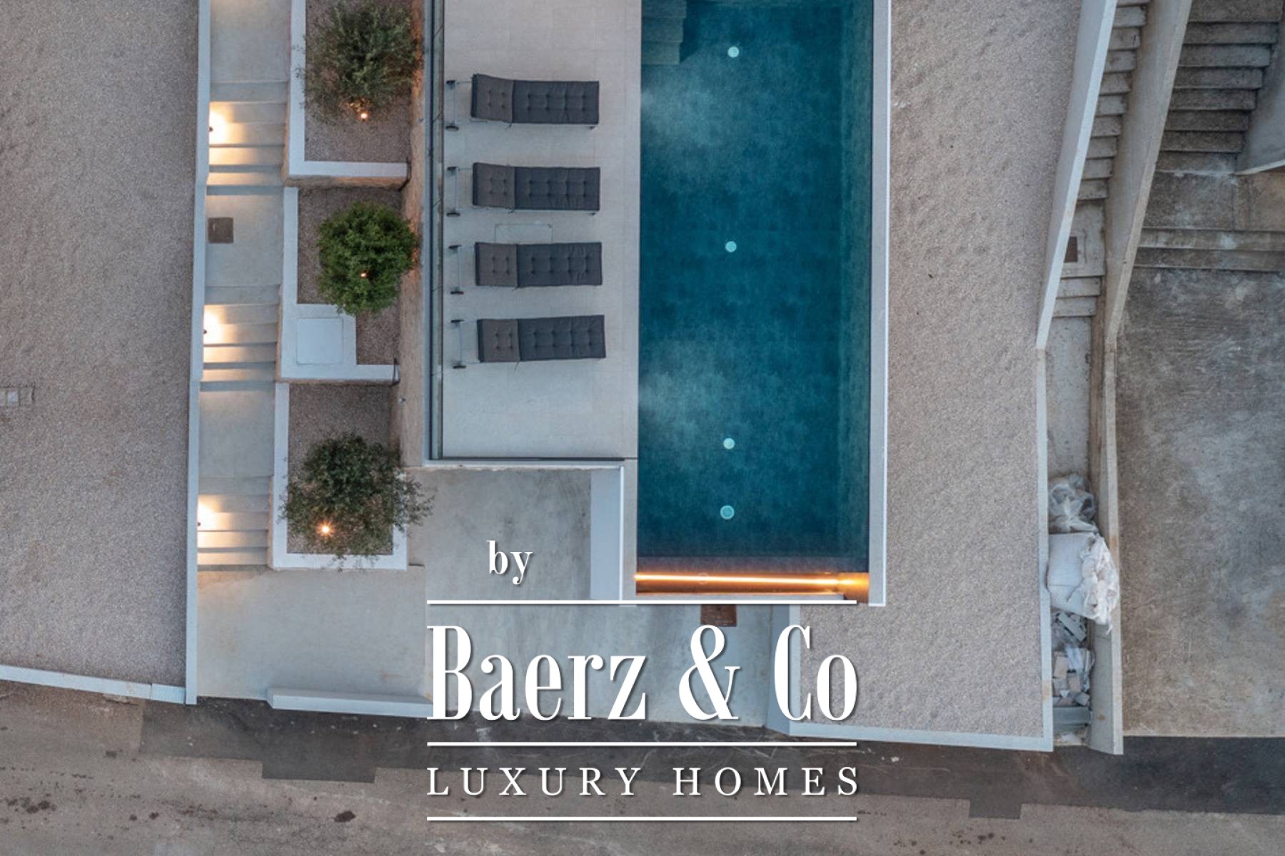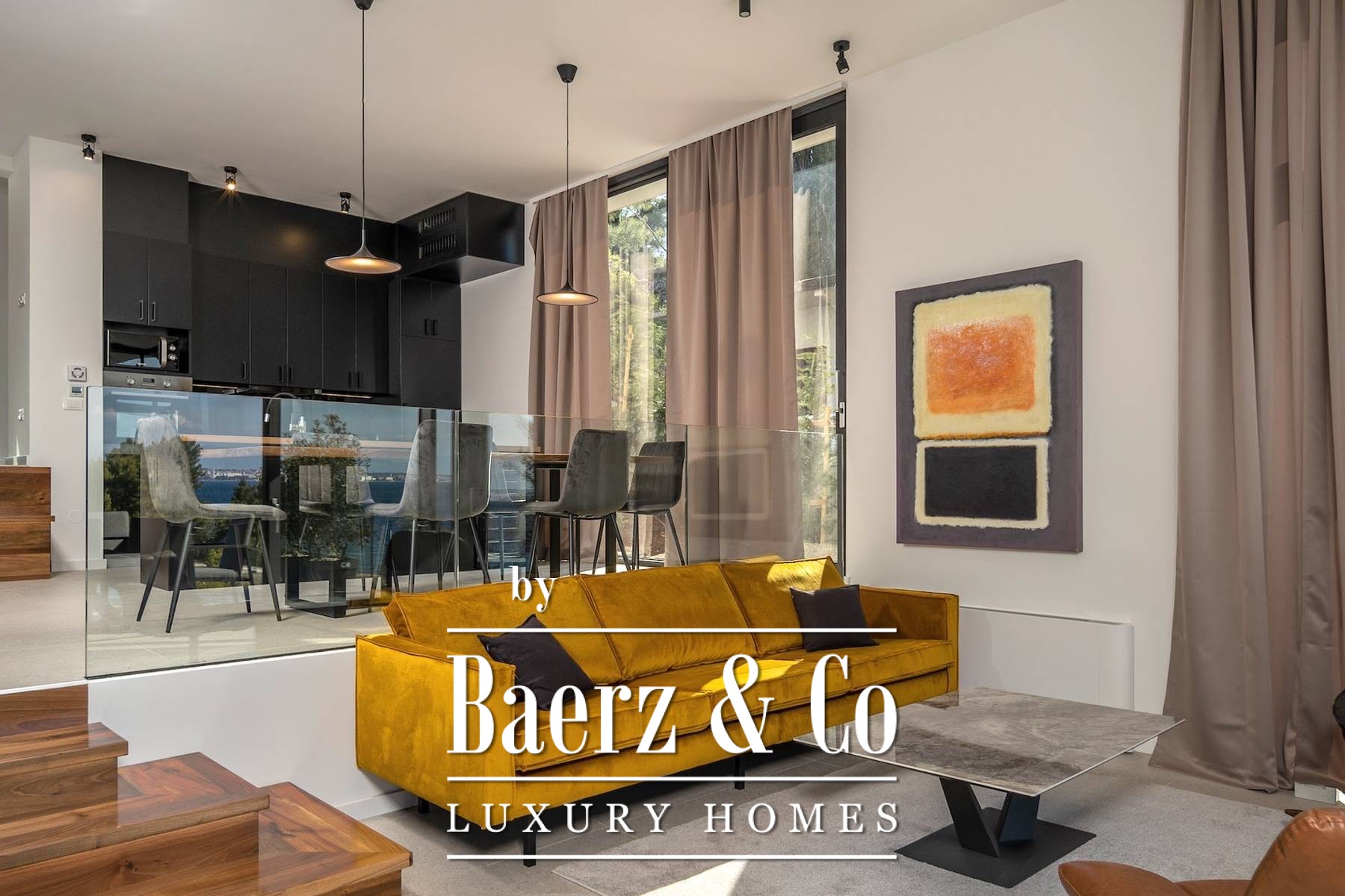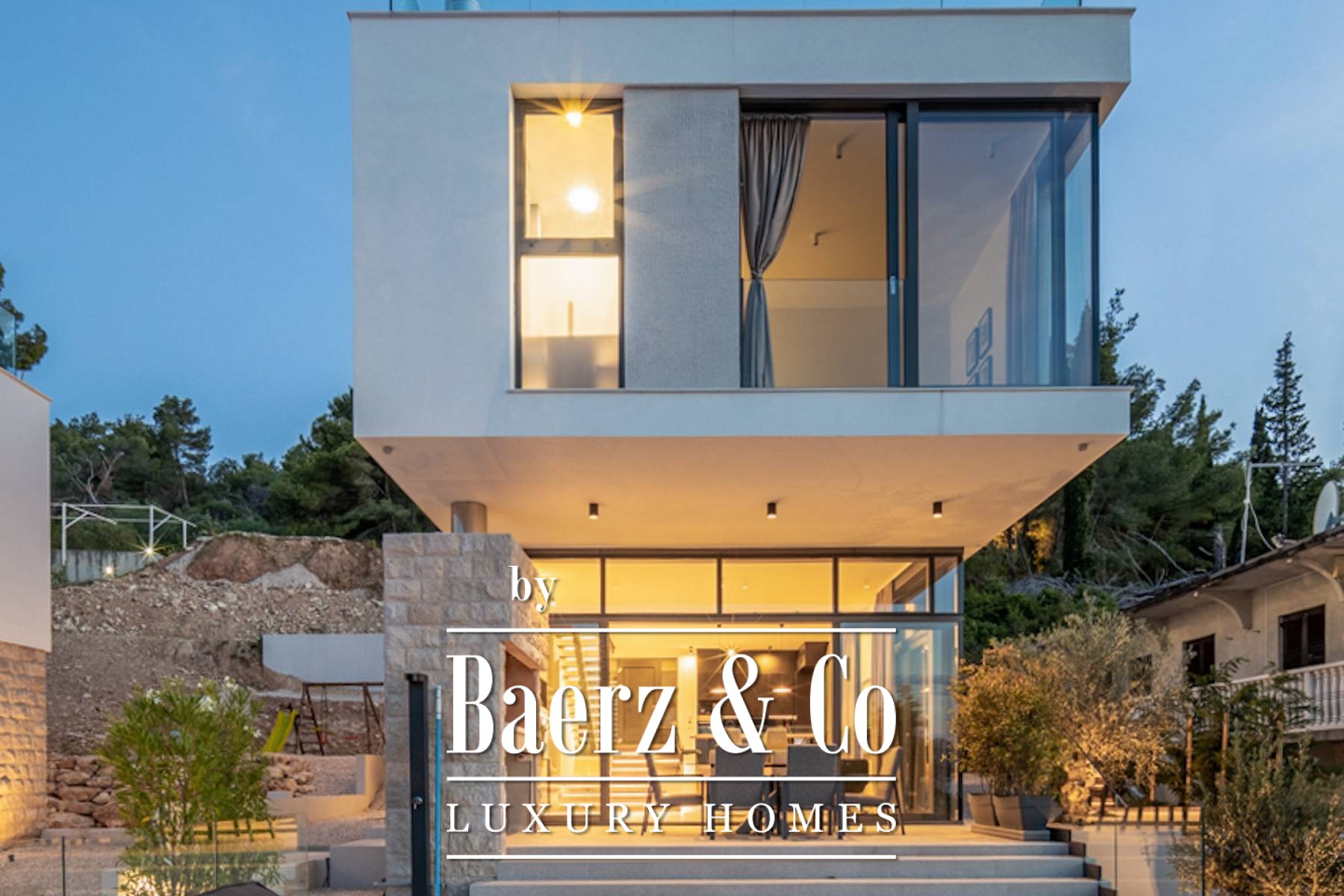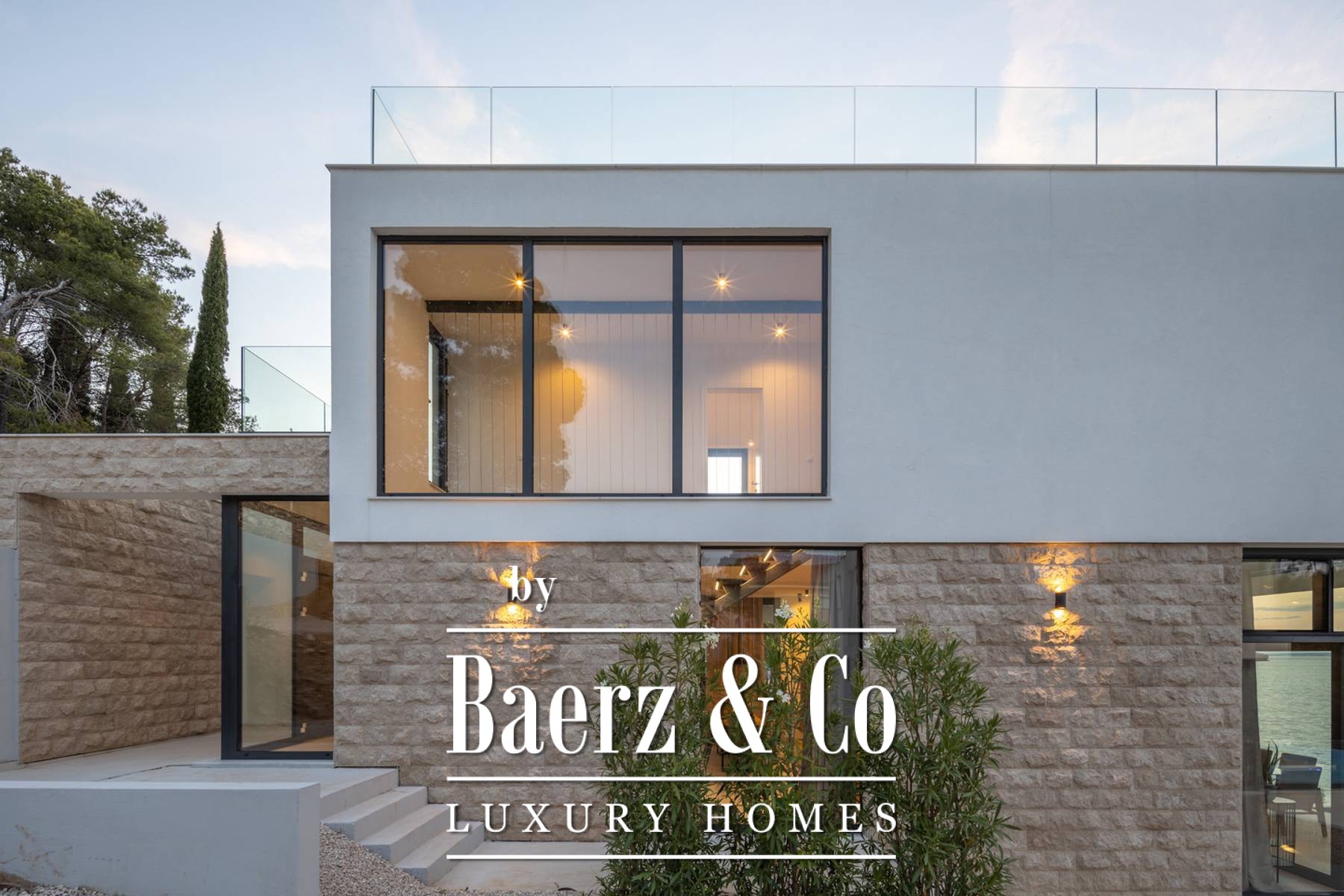 Modern, beautiful, luxurious villa with a swimming pool and a garage for 2 cars, first row to the sea. Built in a contemporary style, the interior of this luxurious villa stands out with its clear lines and refined modern style. It has a modern design, with an open view of the sea and is slightly elevated above the level of the driveway, offering superior comfort and privacy.The villa harmoniously fits into the magical environment in which it is located, and will especially intrigue lovers of minimalist aesthetics and natural light in the interior.This modern villa has three luxurious bedrooms; each room has its own bathroom (two with a shower and one with a bathtub), and a large terrace with a sea view, all just a few steps from the pebble beach.The gross living area of the property is 266 m2, and it is located on a plot of 445 m2. The special features are the spacious terraces, and the swimming pool with a built-in heating / cooling system and a central vacuum system.The entire building is fully air-conditioned, and the ceramic tiles have an underfloor heating system.In the basement there is a garage with two garage spaces, then a machine room and a staircase.The ground floor, which extends over three cascades, consists of an entrance hall, a guest toilet, a beautiful open space living room with a dining room and kitchen, and an additional laundry room. The living room opens onto the terrace and swimming pool.The terrace with an infinity pool and a sundeck is located just