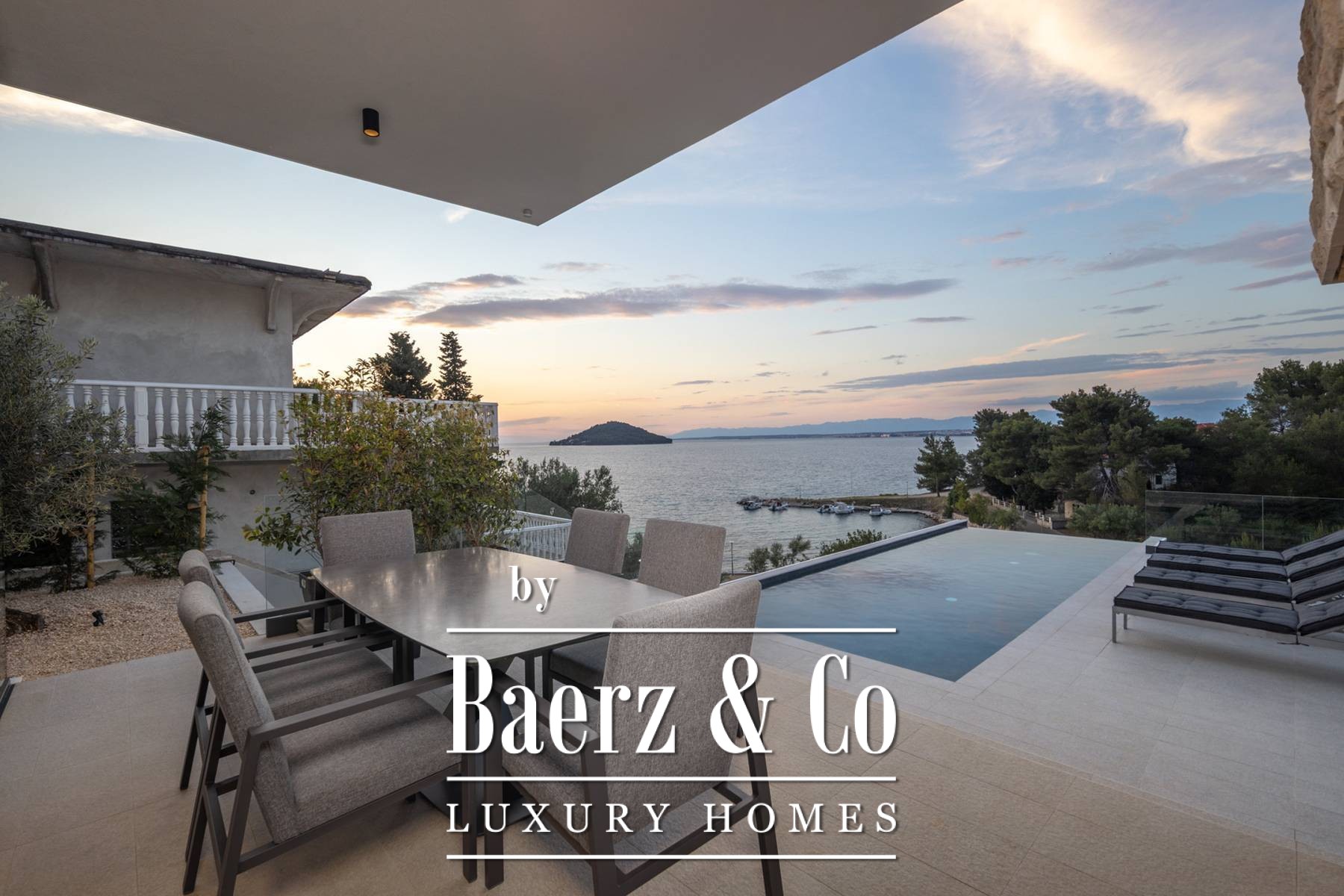 a few meters from the sea and has a beautiful sea view.The first floor consists of an entrance hall, three comfortable luxurious bedrooms with ensuite bathrooms, glass walls and a sea view.At the top of the building is a spacious roof terrace, with a glass fence from which a magnificent panoramic view offers. The courtyard with beautifully lit stairs and olive trees gives the villa a special atmosphere at night.The beautifully organized outdoor space offers plenty of opportunities for relaxation. Among other things, it includes a 32 m2 swimming pool and a sunbathing area.It is located on the beautiful Dalmatian island of Ugljan, (northern Dalmatia) which amazes with its natural beauty and untouched nature, and the villa itself has a beautiful sea view, a coastal position. Considering the picturesque location of the property right by the sea, and good connections to popular tourist destinations, the villa has enormous potential and represents an excellent investment opportunity whether you are looking for a modern holiday home or a rental property in one of the increasingly popular destinations.Nearby is the Kornati National Park (consisting of 89 islands, islets and rocks), and the city of Zadar is only half an hour away by boat (a historic city over 3000 years old).Next to this property there is another, similar property (visible in the first picture) and there is a possibility of purchasing both properties together.We are at your disposal for all other information.