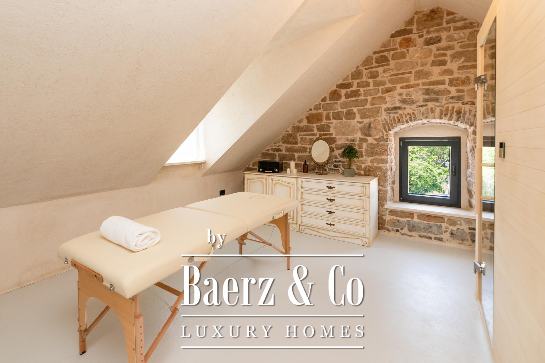 Op de zolder bevindt zich een exclusieve privésauna, compleet met jacuzzi en massagegedeelte, waar persoonlijke wellness centraal staat. Deze stenen woning in Pučišća geldt als een authentiek toevluchtsoord aan de kust van Brač, waar erfgoed, eigentijds wonen en ingetogen verwennerij harmonieus samenkomen.