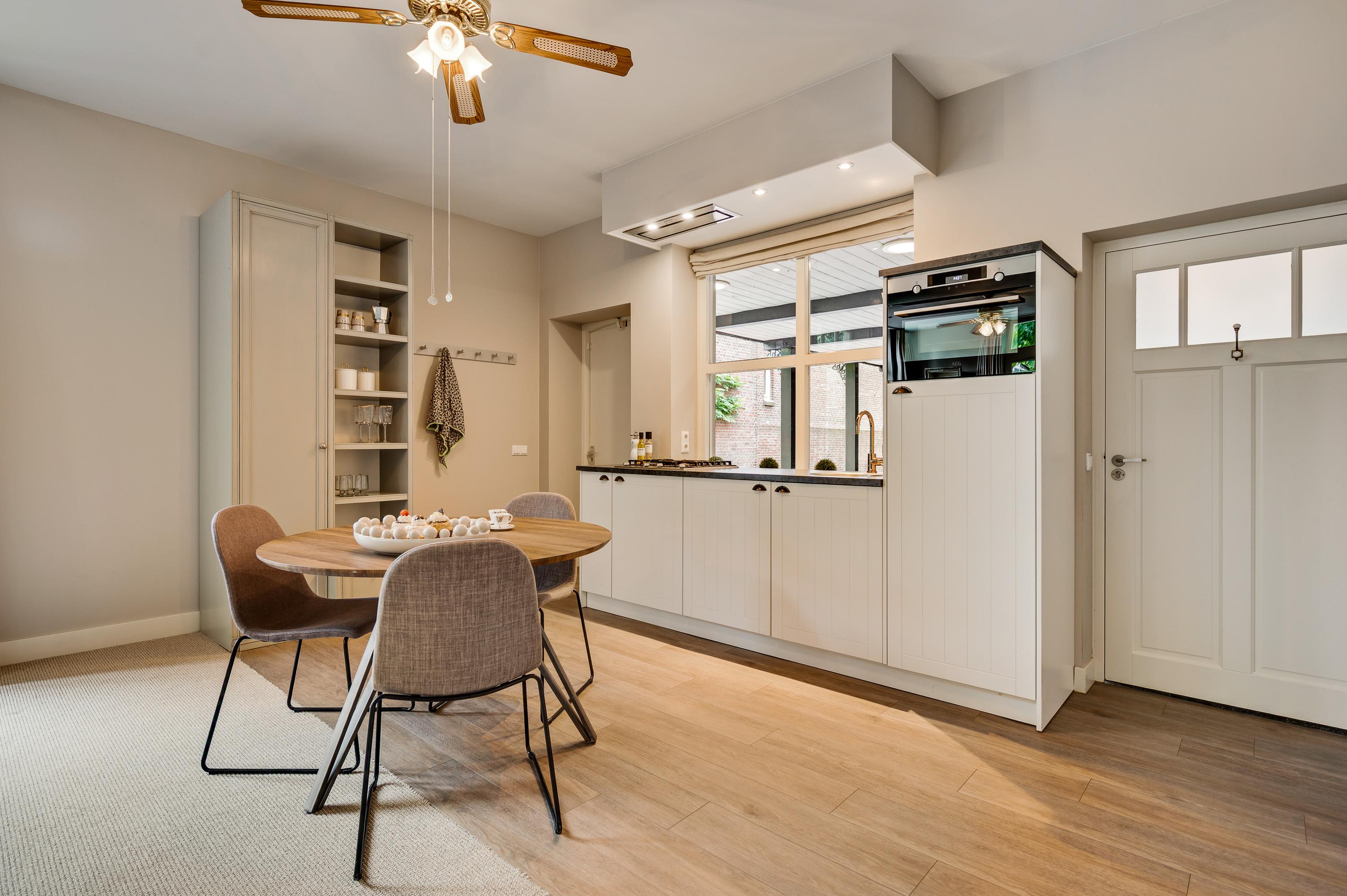 Vanuit de statige hal bereikt u de indrukwekkende woonkeuken van circa 25 m². Deze is uitgerust met een luxe keukenopstelling die klassiek vakmanschap combineert met modern gebruiksgemak. Het terrazzo werkblad, de 6-pits Boretti gasfornuis met dubbele oven, en de hoogwaardige inbouwapparatuur maken deze keuken tot het kloppende culinaire hart van het huis. De klassieke tegelvloer en de hoge paneeldeuren die de keuken van de eetkamer scheiden, benadrukken het verfijnde karakter van de woning.