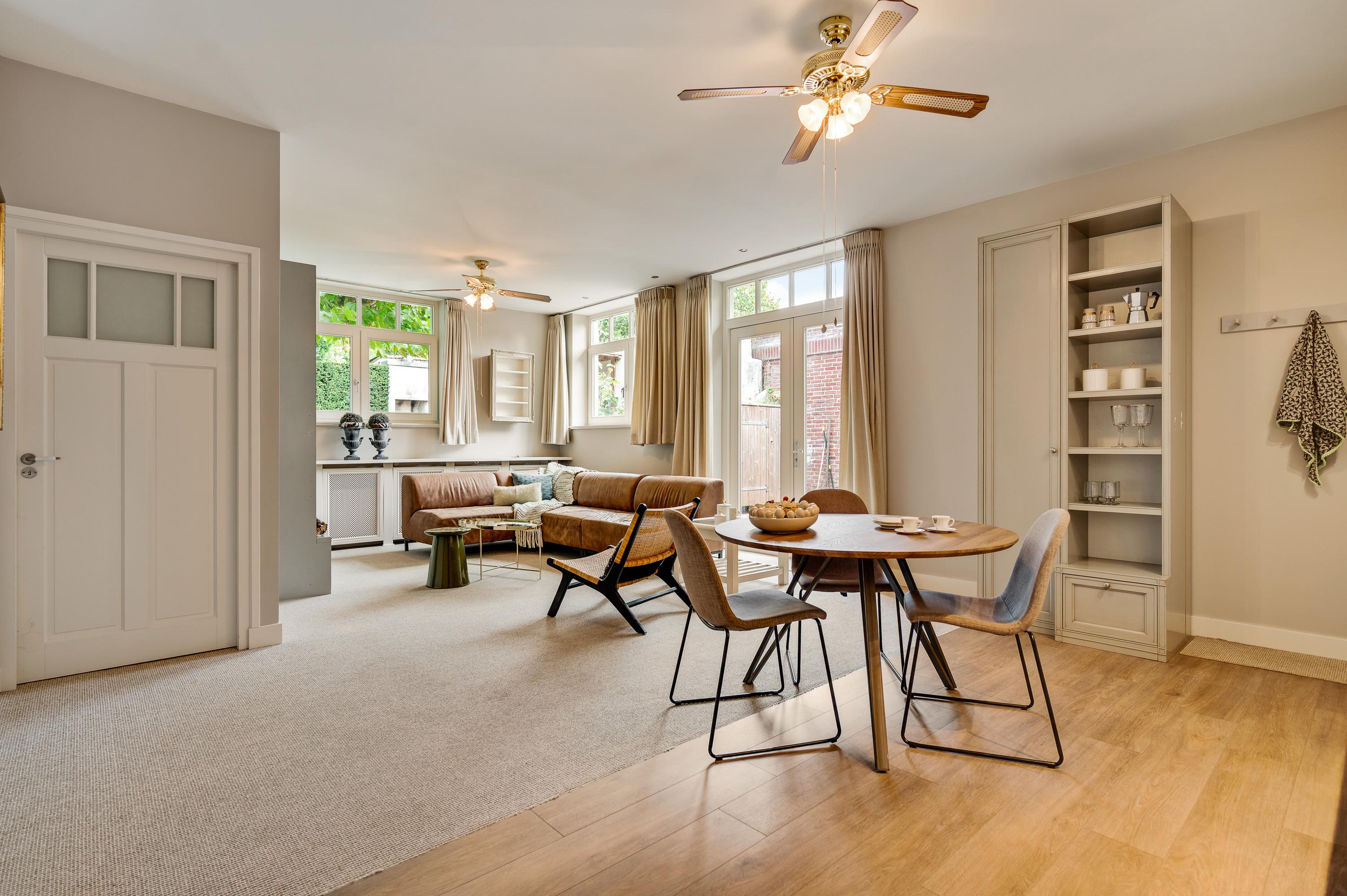 Bij binnenkomst wordt u direct omarmd door de warme sfeer en verfijnde afwerking. De imposante woonkamer van bijna tien meter lengte vormt het hart van het huis. Hier ligt een prachtige Versailles-parketvloer, die in combinatie met de design gashaard en de hoge raampartijen zorgt voor een ambiance van exclusieve rust. Via de openslaande tuindeuren loopt de ruimte naadloos over in het overkapte terras en de stijlvolle stadstuin – een privé-oase midden in de stad.