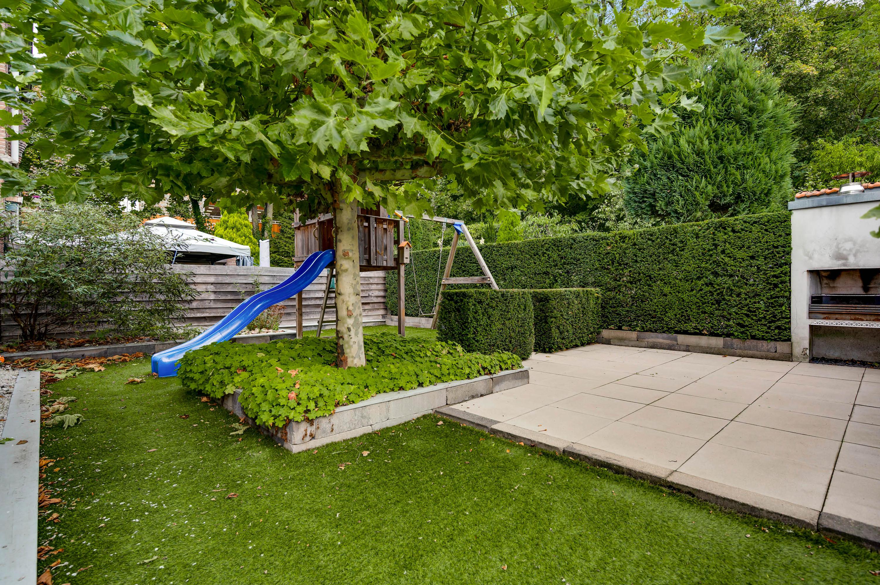 Aan de zijkant van het huis loopt u door naar de achtertuin. Hier is een plek gecreëerd voor de kinderen om lekker te spelen. Ook al groenvoorzieningen is er gedacht. De verschillende plekjes geven de tuin een speels gevoel.