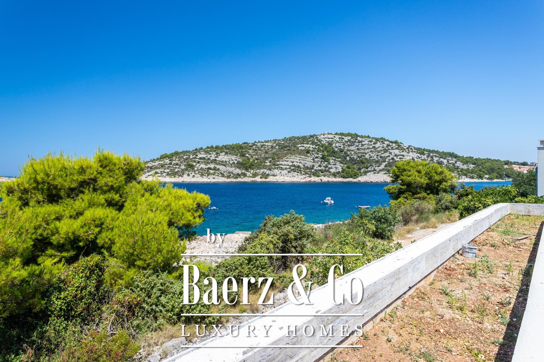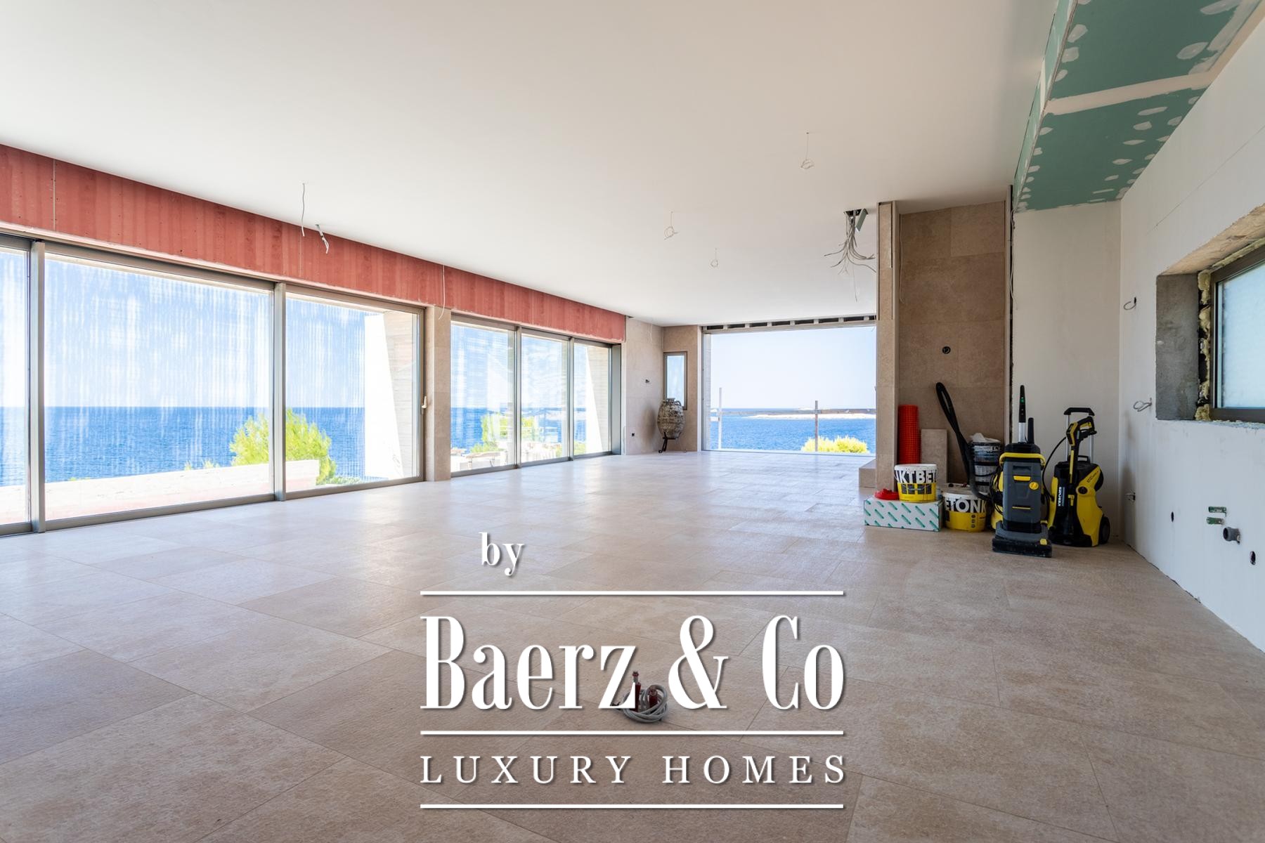Unique ultramodern villa first row to the sea in the vicinity of Raznja!Outstanding contemporary exterior and interior design! The position right next to the sea, at the end of the construction zone, borders the green belt of the forest.The total area is 540 m2. The yard is 810 m2 in size.The villa consists of three floors.Floor -1: tavern with kitchen, fitness/gym with bathroom and potentially sauna, entrance to the 250 m2 swimming pool. with a pool of 75 m2.Floor 0: entrance hall, exit to the staircase, guest toilet, large living room with kitchen, bar, dining room, living room and terrace that opens to the sea.Floor +1: hallway, bedroom with bathroom, walk-in wardrobe and terrace with sea view, three more bedrooms
