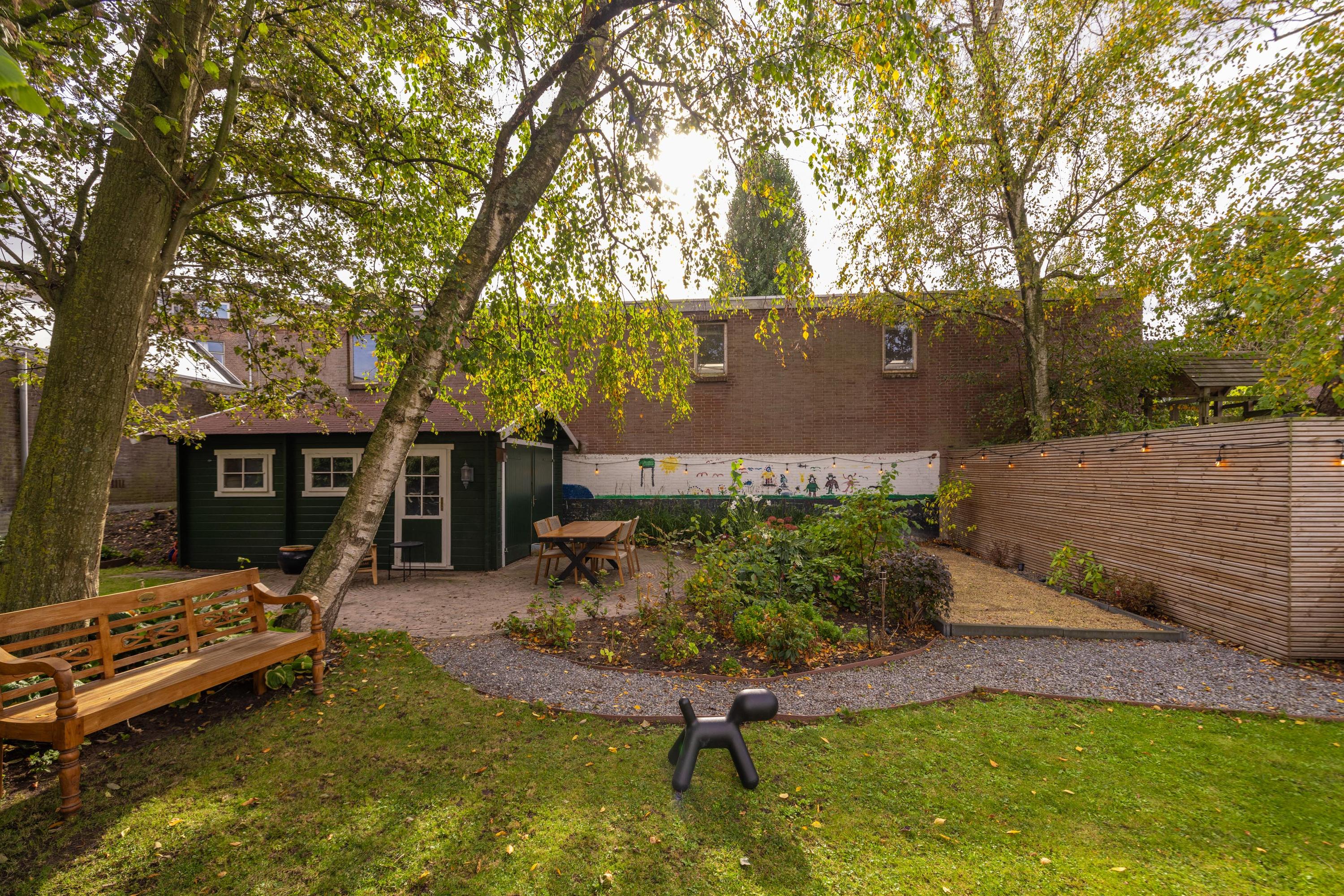 De achtertuin is werkelijk een verrassing: zo royaal dat het voelt als een privépark, met volop zon, groen en rust. Een plek waar kinderen kunnen spelen, waar je gasten ontvangt en waar je zelf tot laat in de avond geniet van de buitenlucht. Achterin de tuin staat een imposante berging van maar liefst ca. 18 m², ideaal voor tuingereedschap, hobby’s of extra opslagruimte.