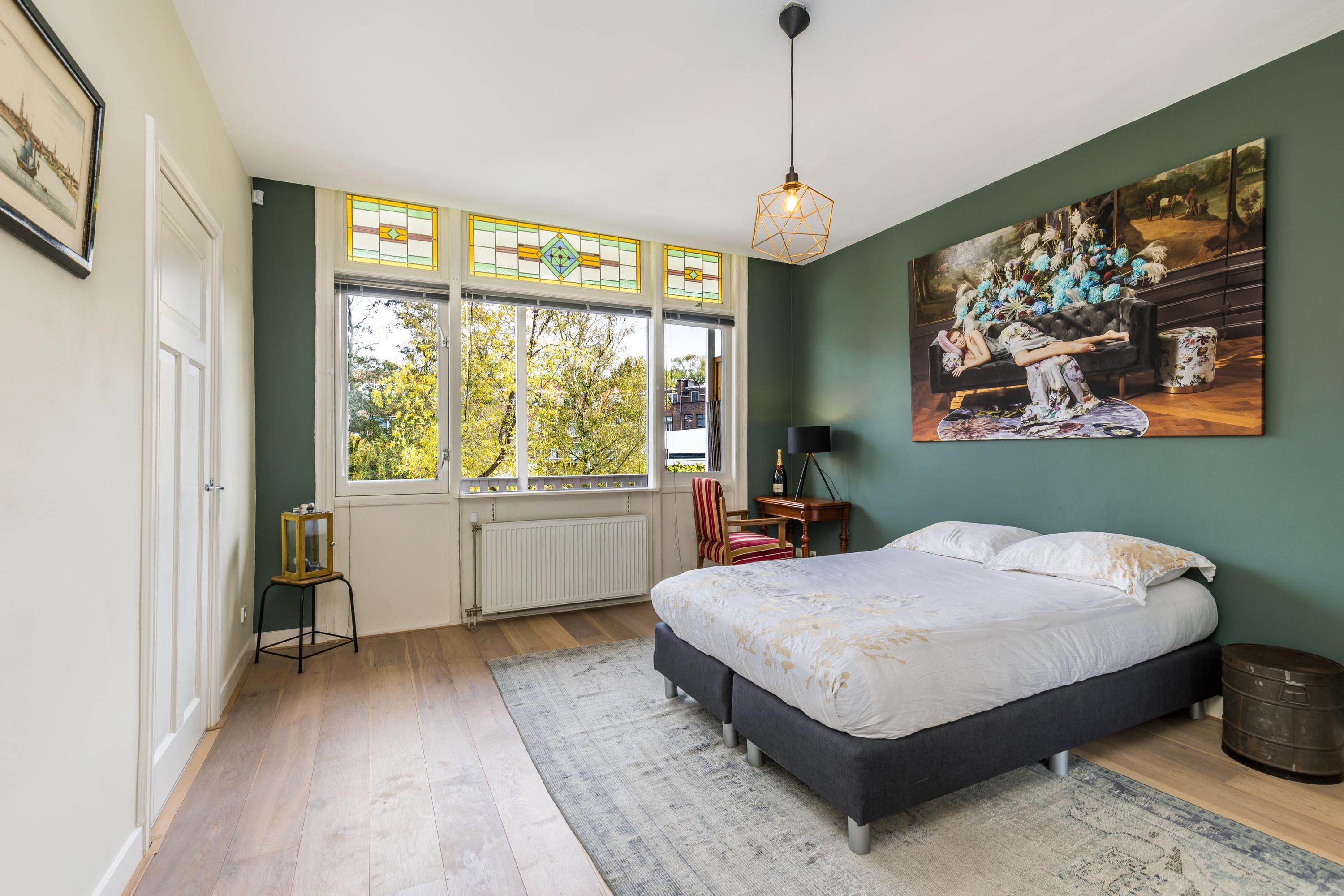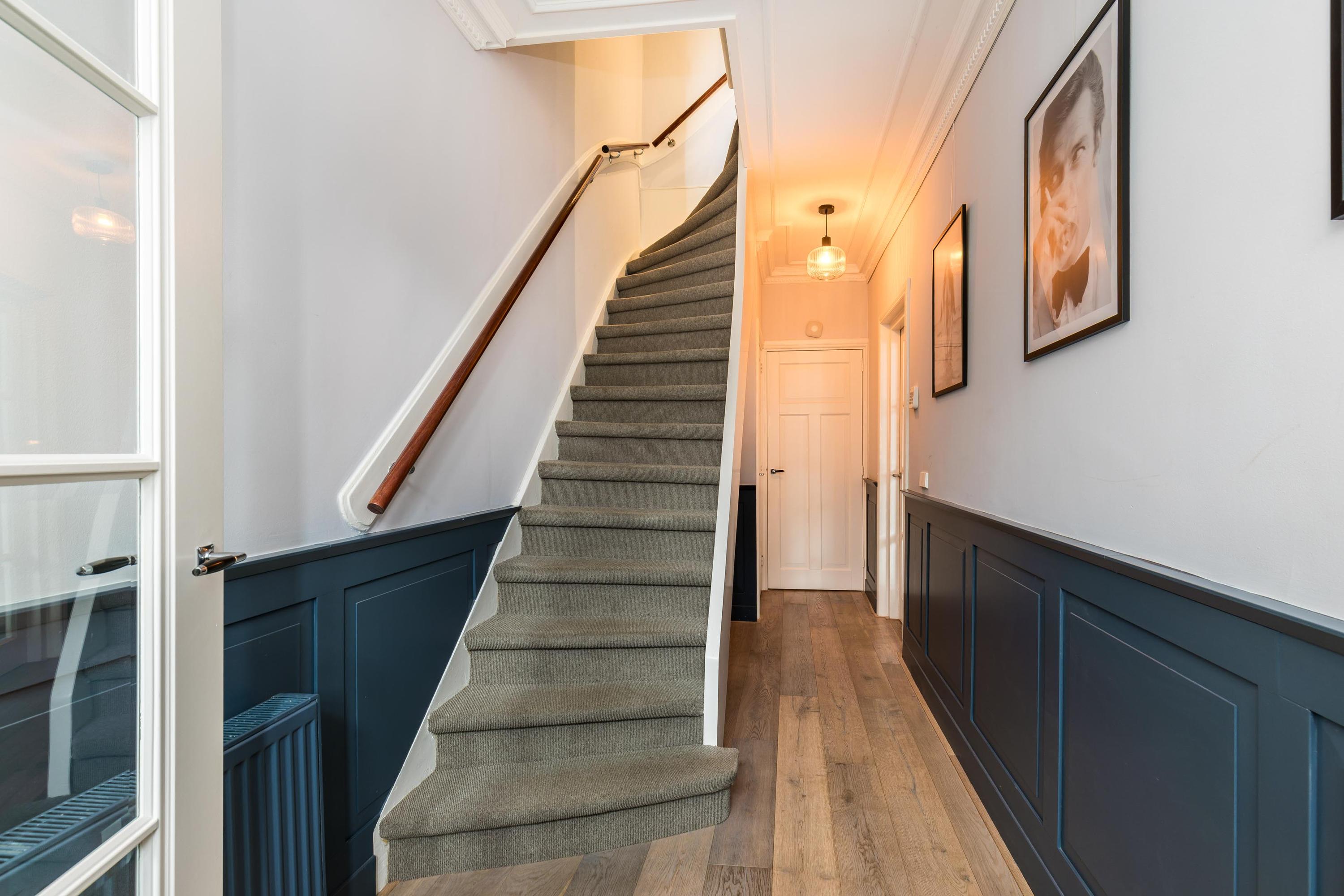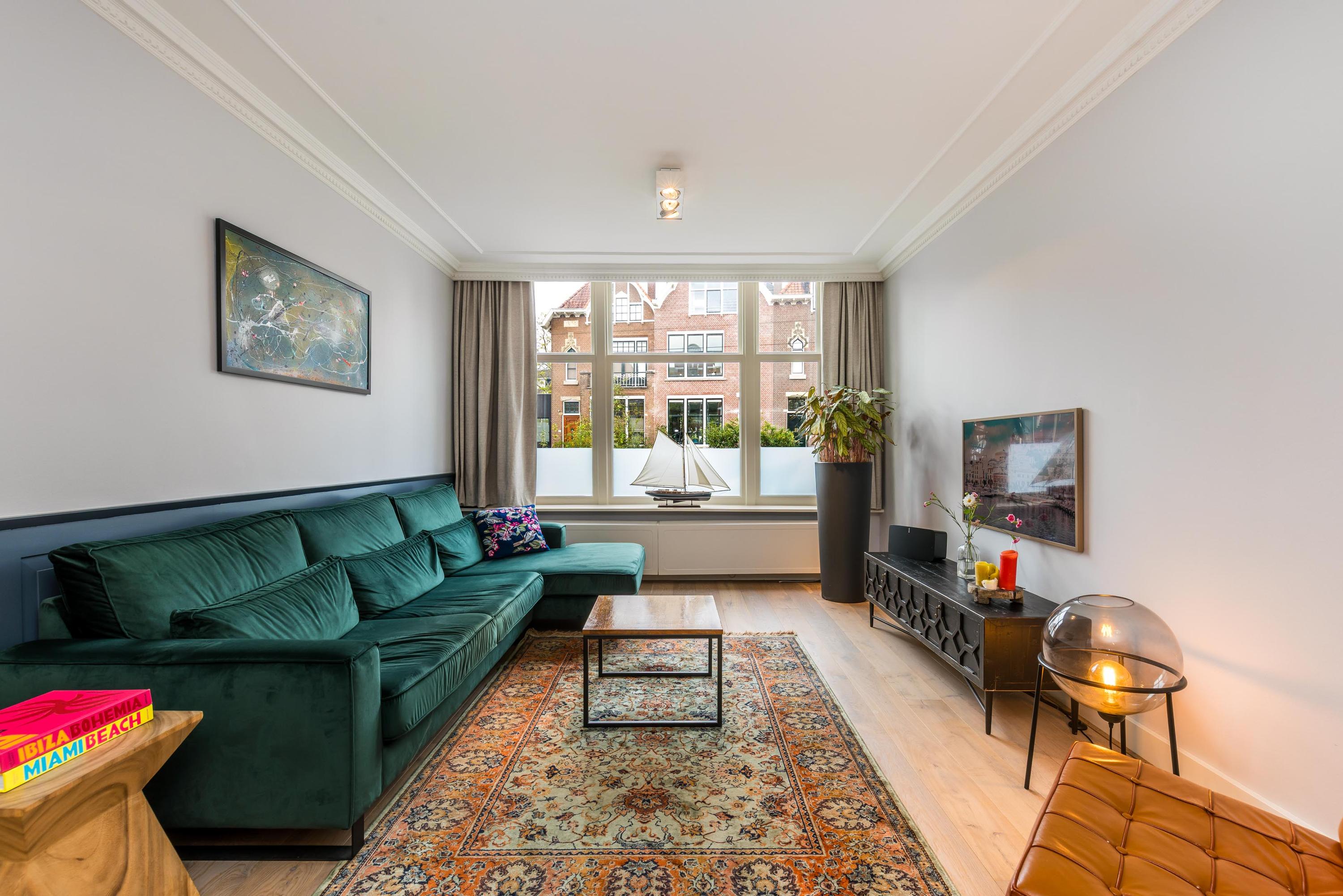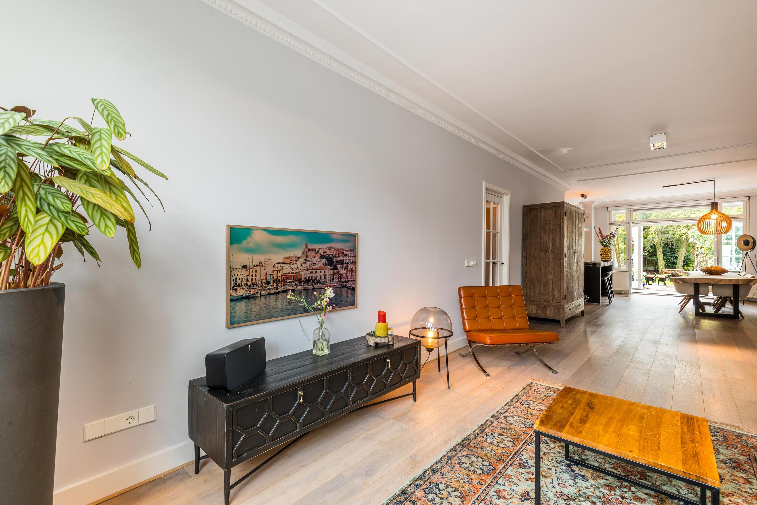 Representatieve entree met hoge plafonds en originele details. Vanuit de hal toegang tot het moderne toilet en de royale leefruimte met prachtige eikenhouten vloer. De open keuken (vernieuwd in 2022) vormt het hart van het huis, uitgevoerd met een groot kookeiland, hoogwaardige inbouwapparatuur waaronder ook een stoomoven en een (wijn-)klimaatkast. Aansluitend de lichte serre met openslaande deuren naar de zonnige achtertuin, waar binnen en buiten naadloos in elkaar overgaan.