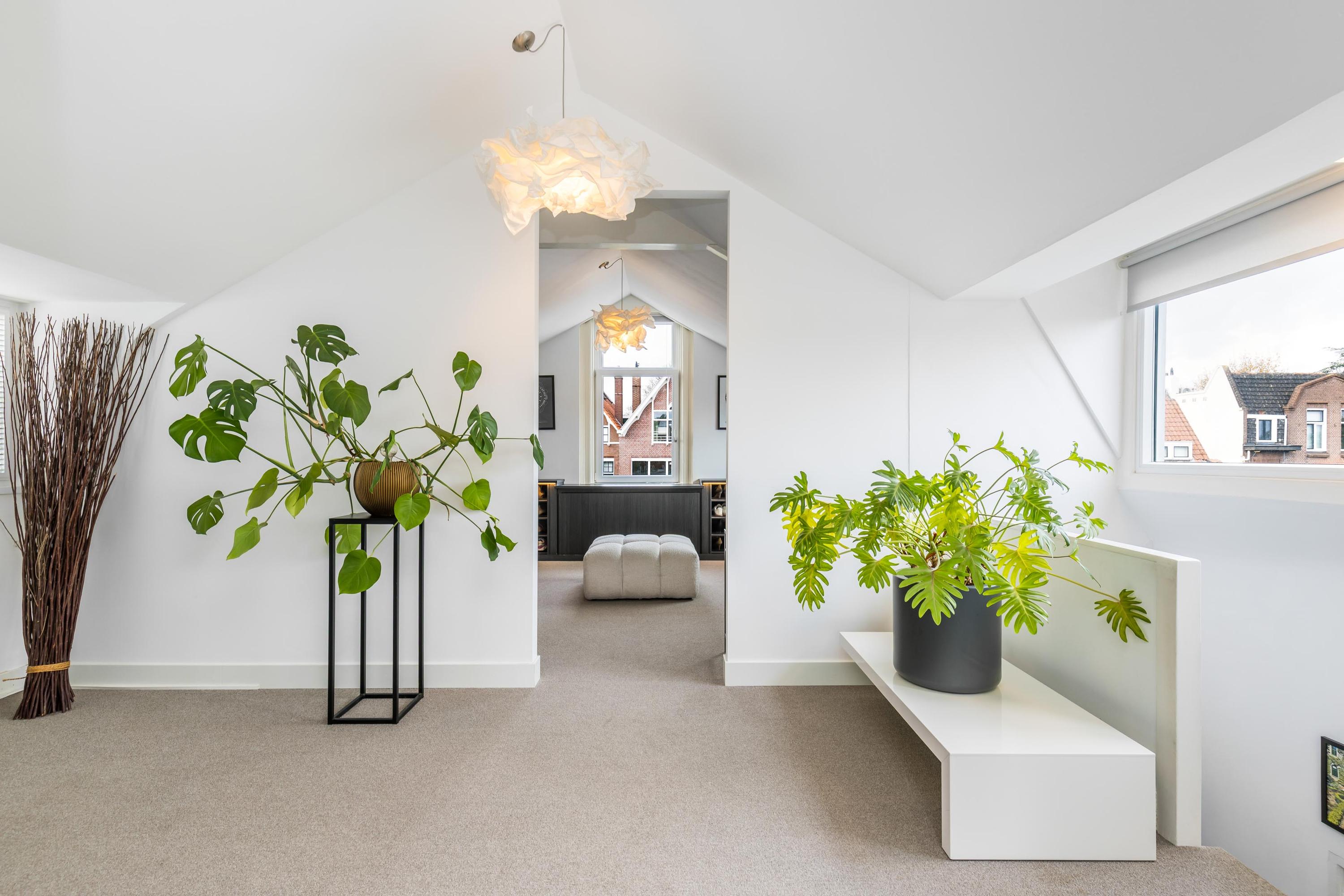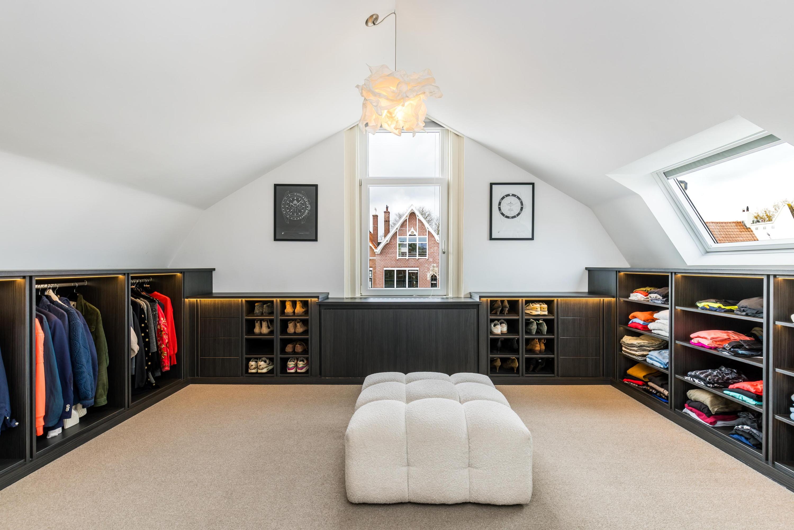 De zolderverdieping is verrassend ruim en biedt momenteel één slaapkamer aan de achterzijde. De royale kamer aan de voorzijde is ingericht als een grote walk-in closet, maar is uiteraard eenvoudig om te vormen tot een zeer ruime tweede slaapkamer. De slaapkamer aan de achterzijde biedt een fraai vrij uitzicht over de tuin. Daarnaast een tweede moderne badkamer met inloopdouche en wastafel, en een praktische wasruimte met opstelling voor wasmachine en droger.