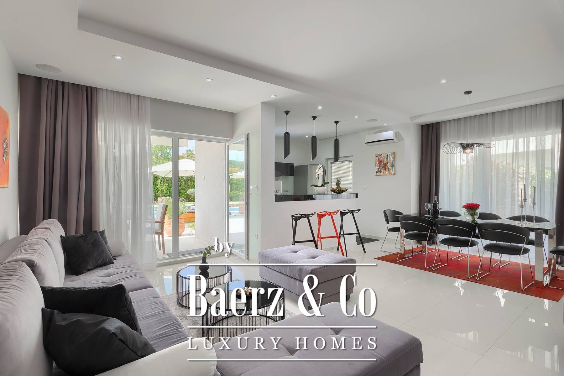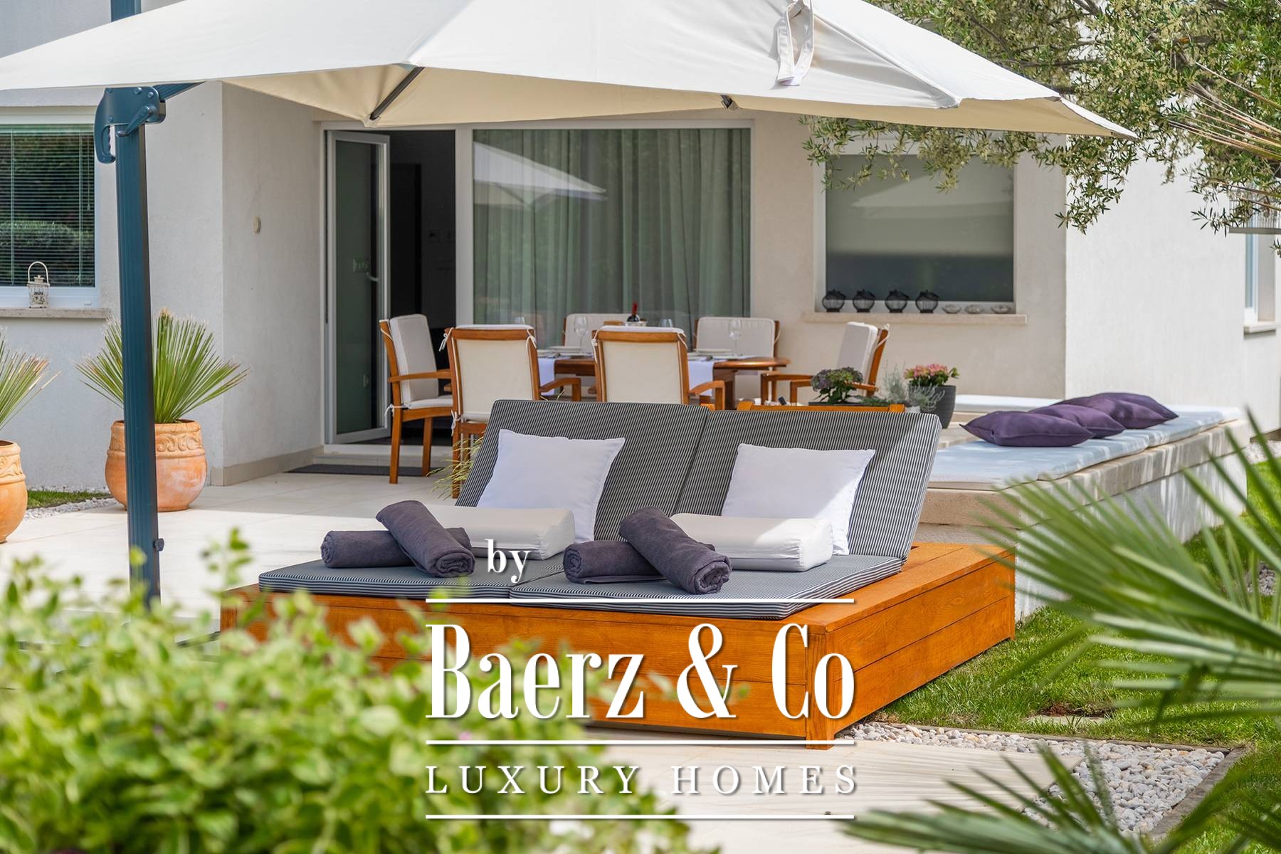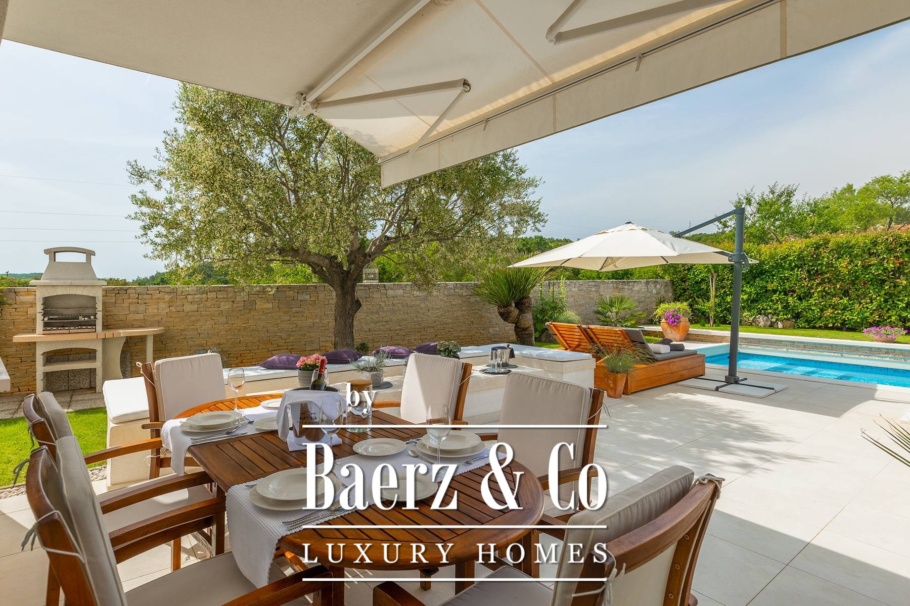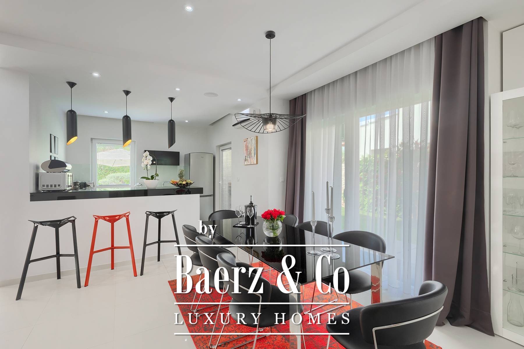 landscaped and maintained with an irrigation system. There is also a barbecue in the garden. On the first floor there are two bedrooms with private bathrooms and a spacious terrace that unites the rooms. The villa's underfloor heating is electric, it is also air-conditioned. It is sold in a furnished condition. Electric blinds. Complete villa sound system. Private parking for 2 cars and video surveillance. The villa is owned by the company, which is an additional benefit to the future buyer. It is used for tourist purposes, has a 5* rating and is occupied throughout the entire tourist season, and due to its characteristics, it can be rented throughout the year. We are at your disposal for more additional information.