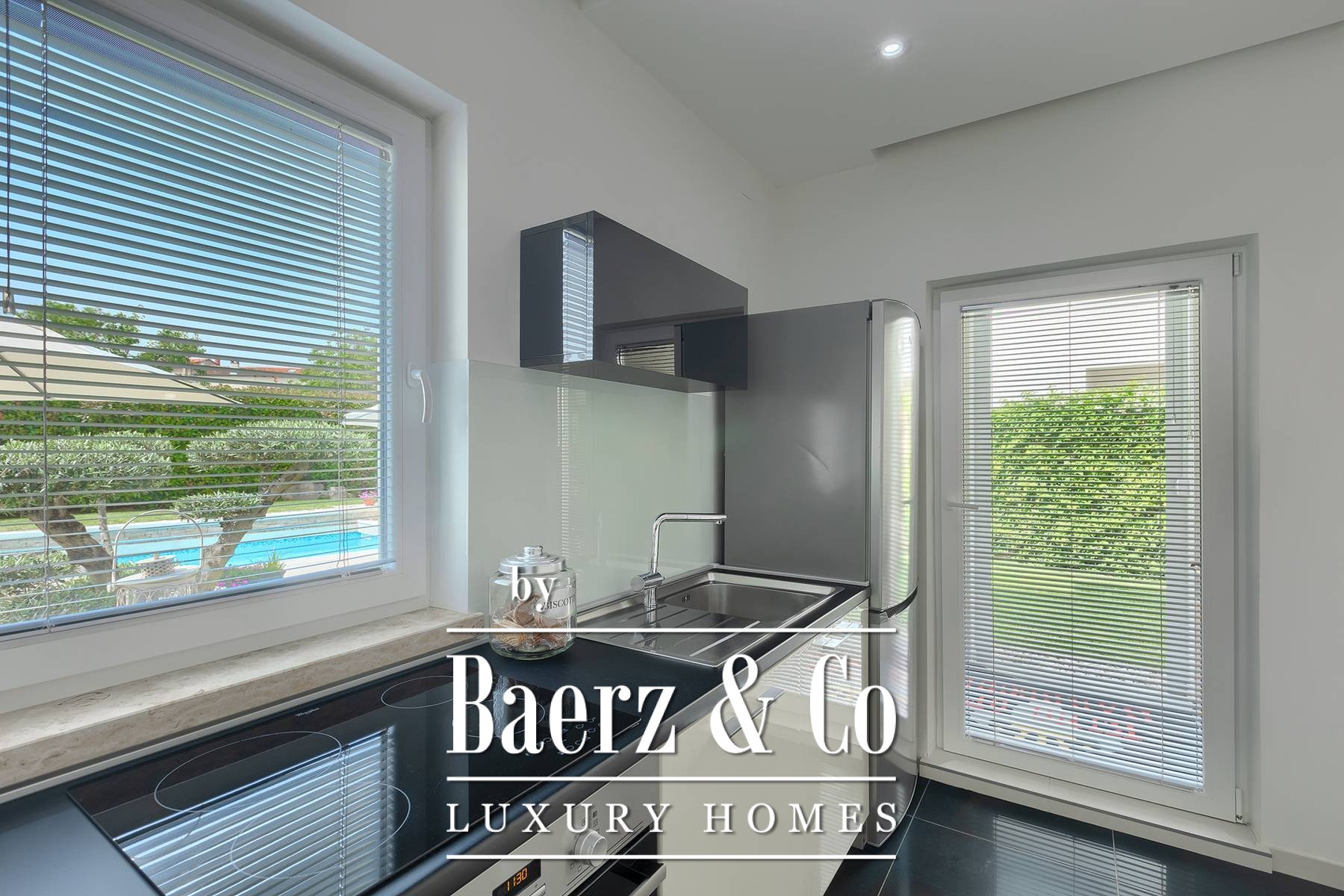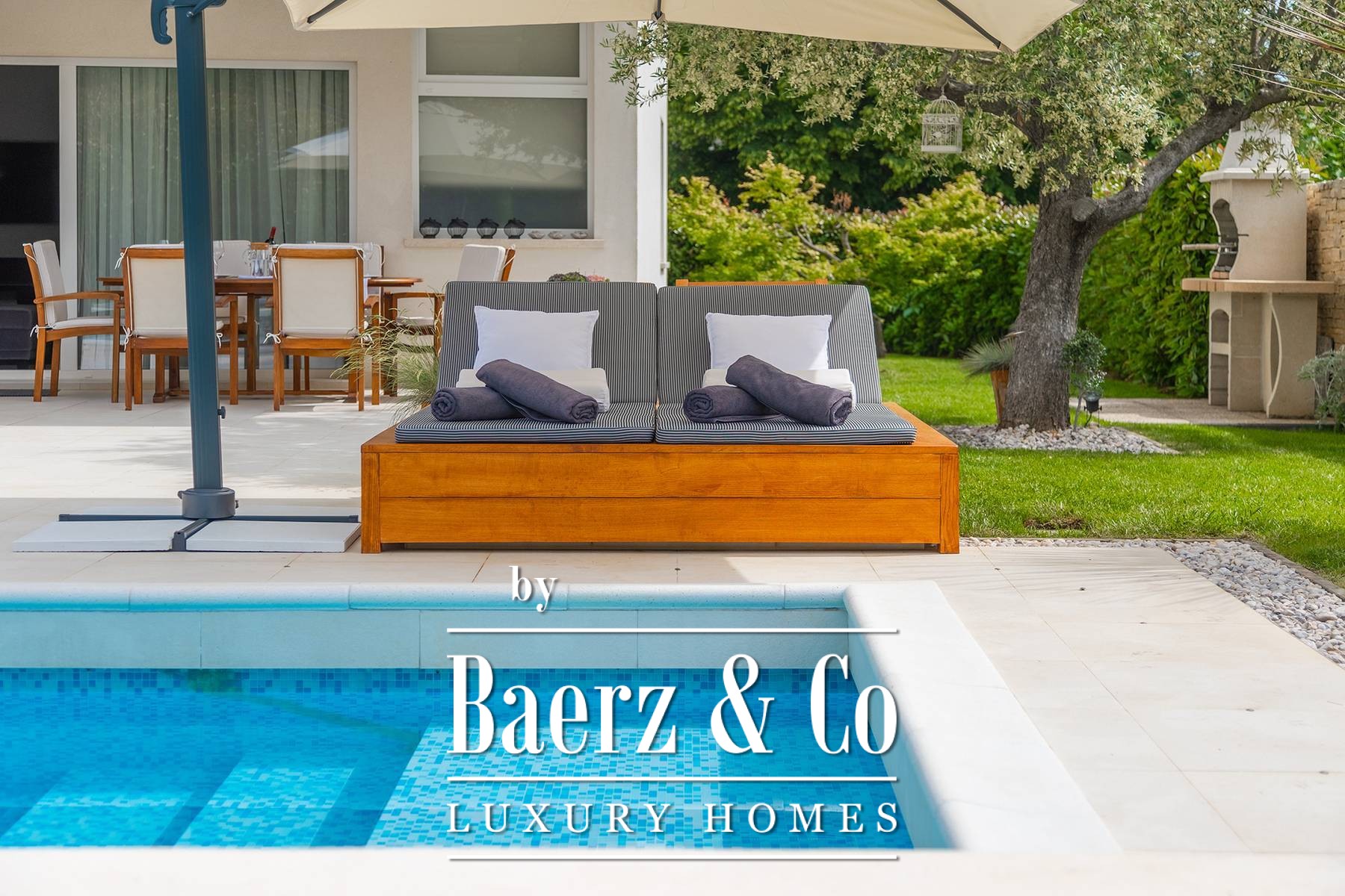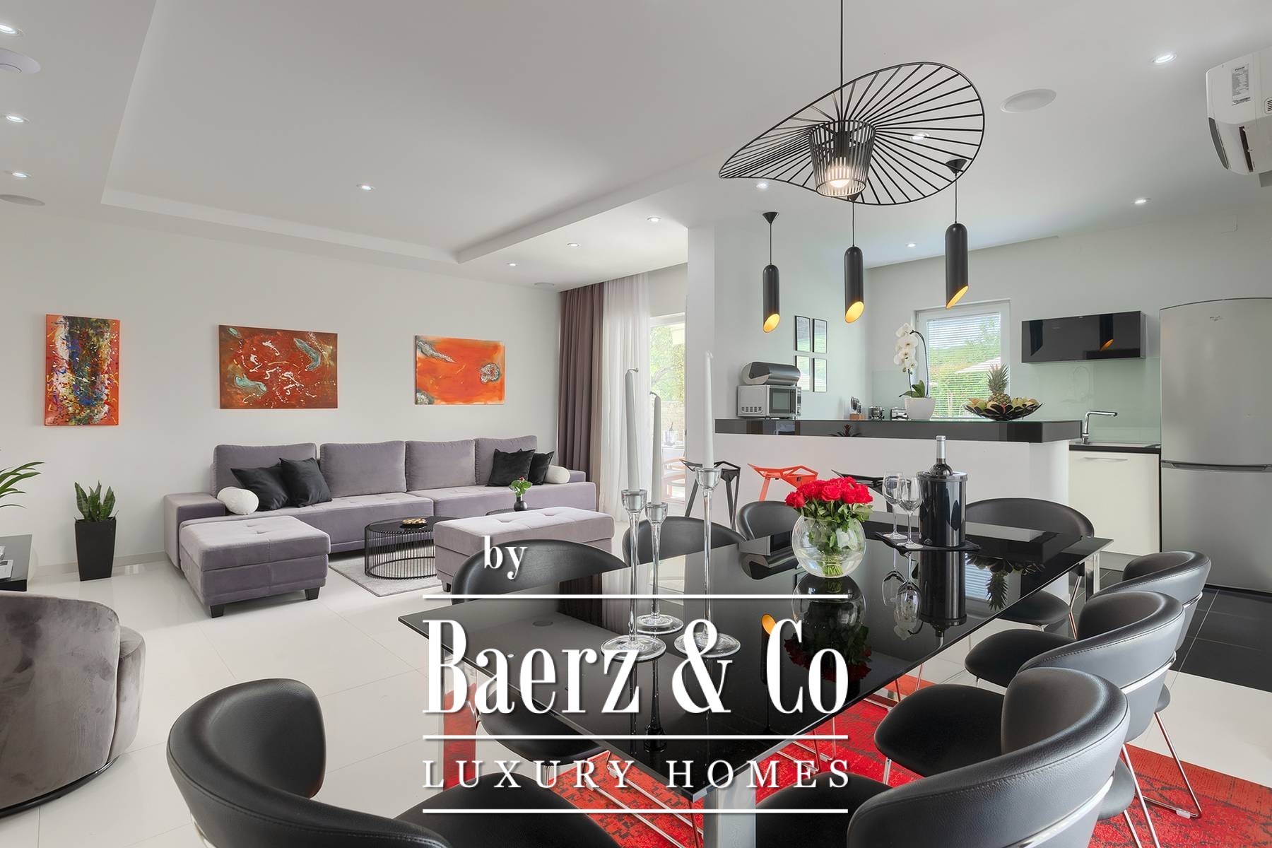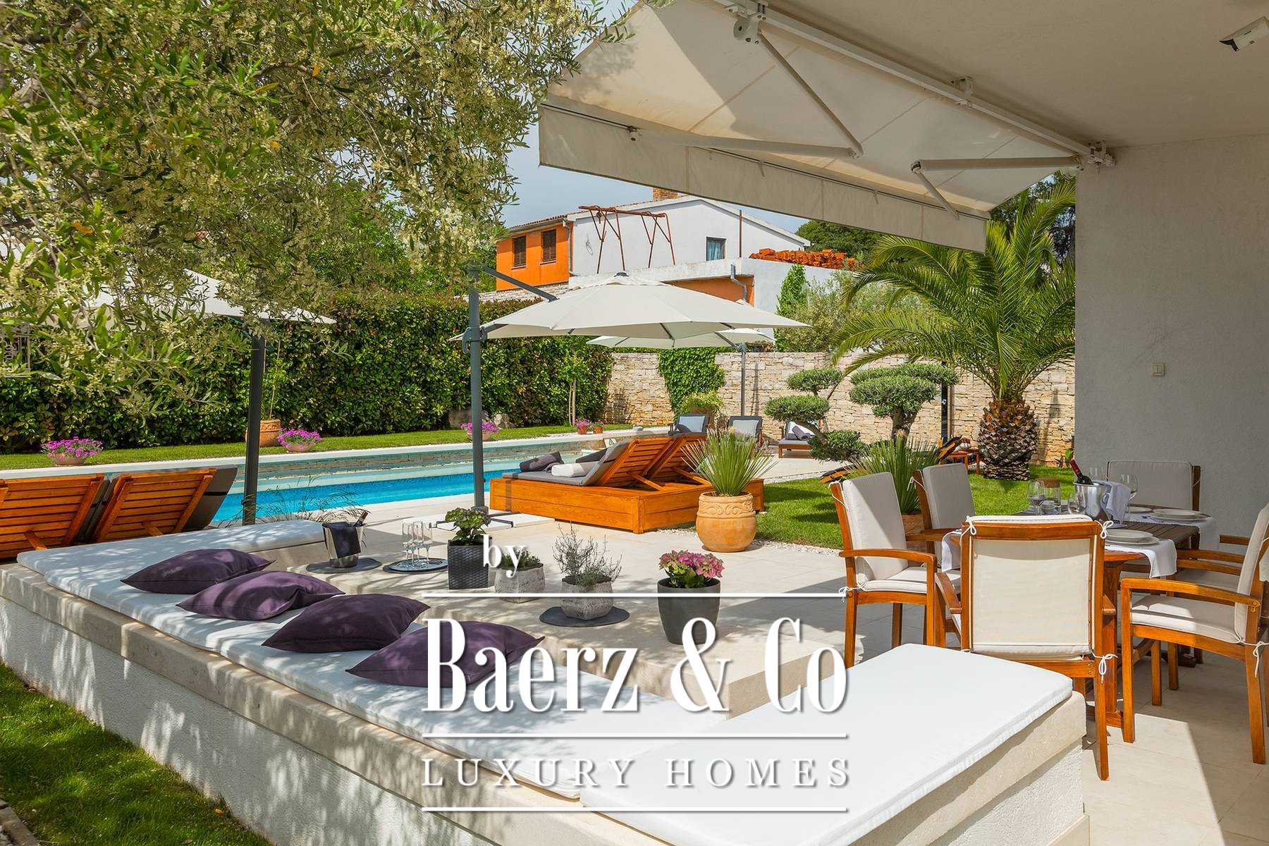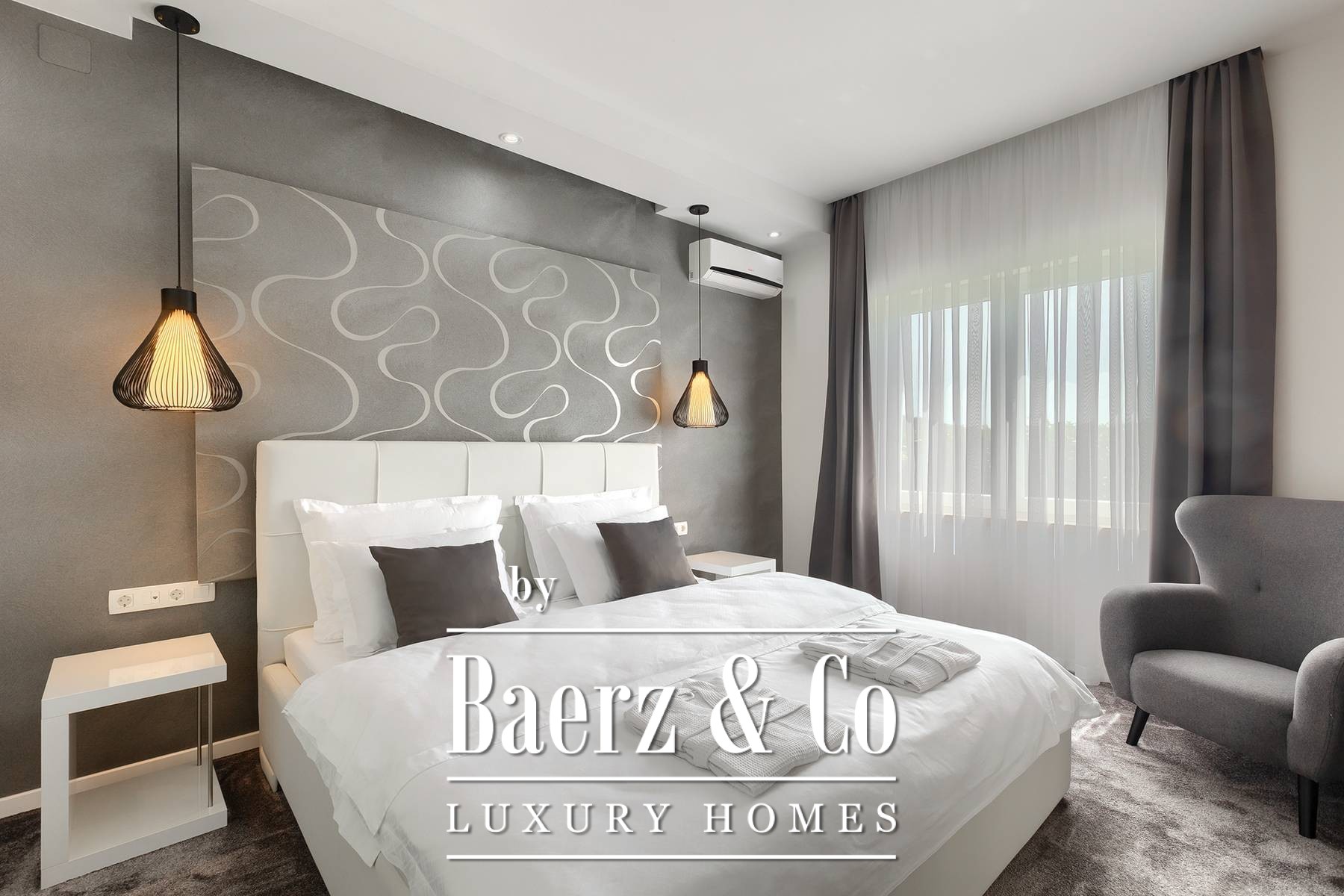 landscaped and maintained with an irrigation system. There is also a barbecue in the garden. On the first floor there are two bedrooms with private bathrooms and a spacious terrace that unites the rooms. The villa's underfloor heating is electric, it is also air-conditioned. It is sold in a furnished condition. Electric blinds. Complete villa sound system. Private parking for 2 cars and video surveillance. The villa is owned by the company, which is an additional benefit to the future buyer. It is used for tourist purposes, has a 5* rating and is occupied throughout the entire tourist season, and due to its characteristics, it can be rented throughout the year. We are at your disposal for more additional information.