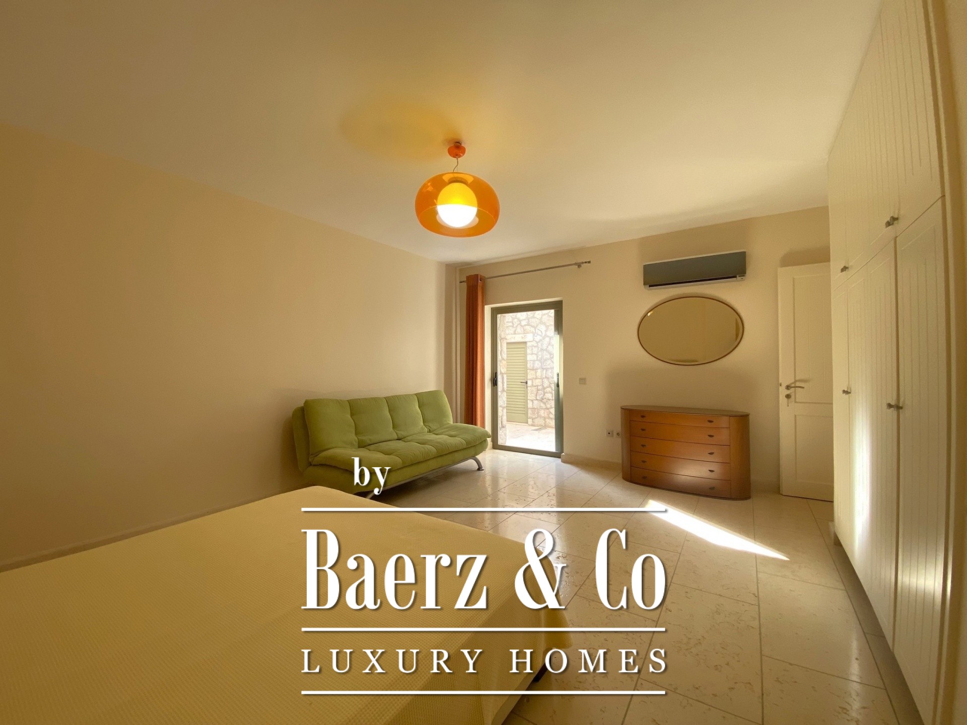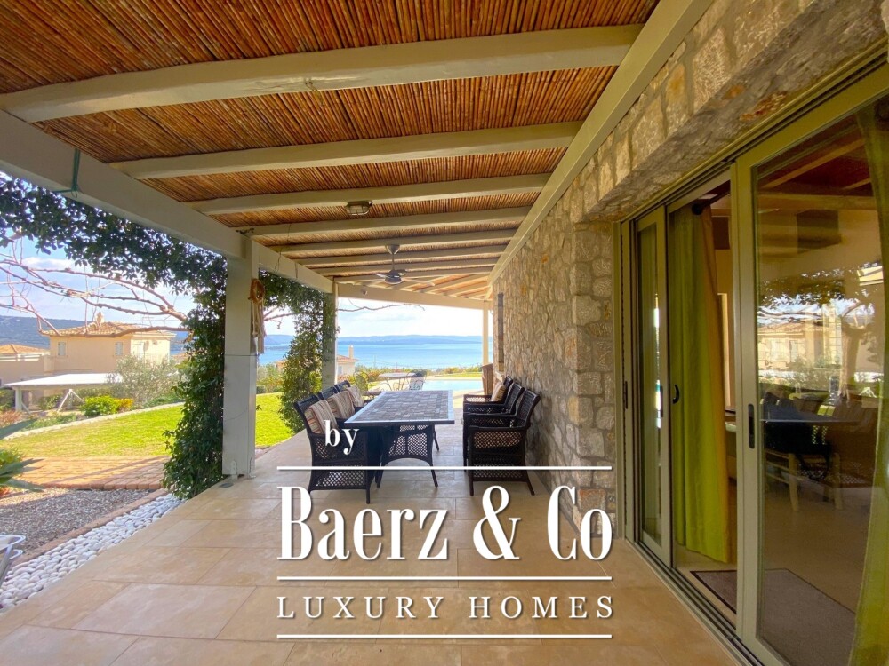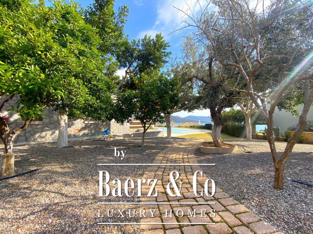 Buitenom creëert 1.400 m² omheind terrein een besloten sfeer, omgeven door lokale beplanting en volwassen bomen. Het hoogtepunt, een zwembad van 60 m², biedt vrij uitzicht op zee en bergen en vormt een uitnodiging tot rust of gezellige bijeenkomsten. De woning waarborgt privacy dankzij stenen erfafscheiding en dubbele toegangspunten: een pad leidt rechtstreeks naar het heldere water en een overdekte parkeerplaats verwelkomt bezoekers.