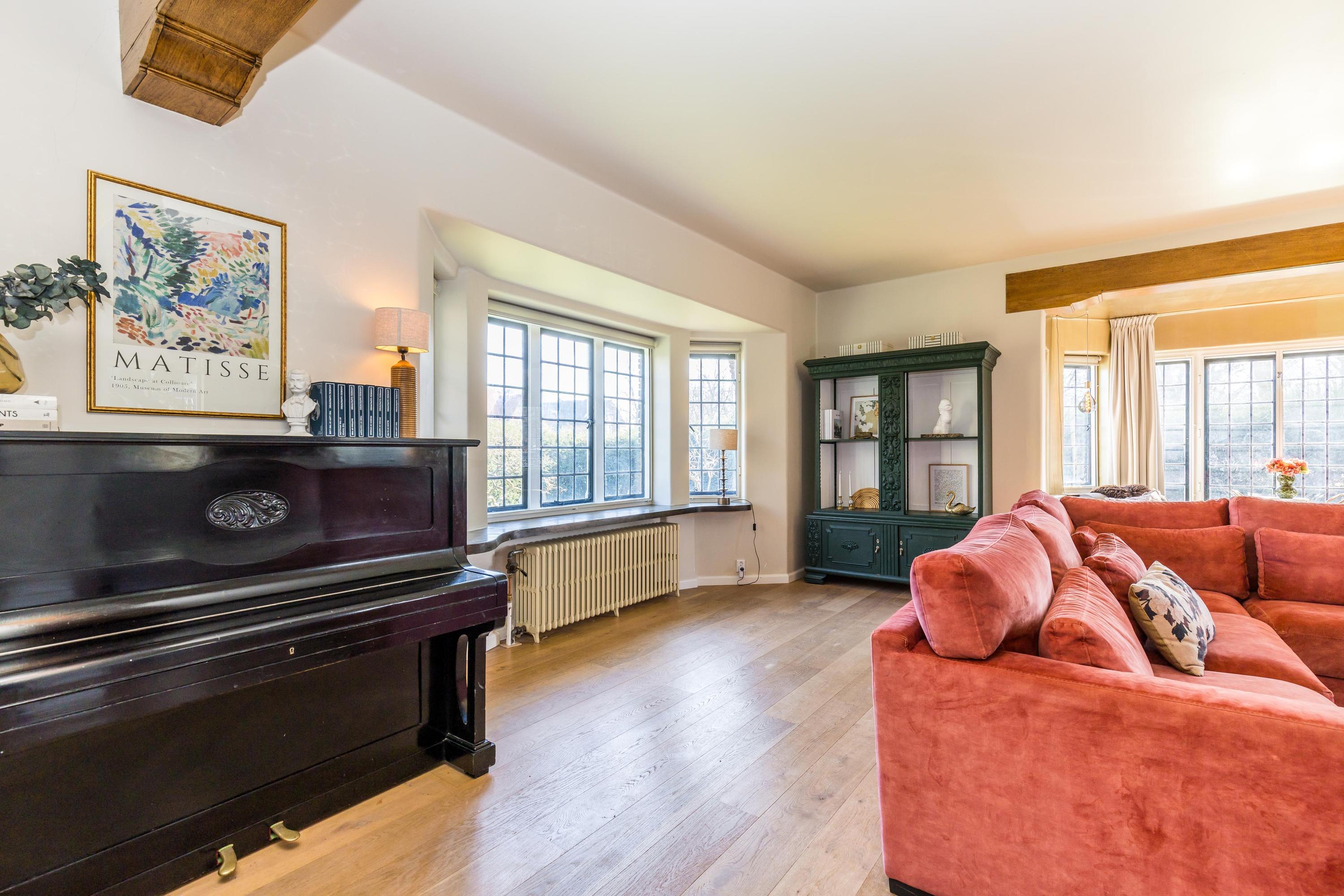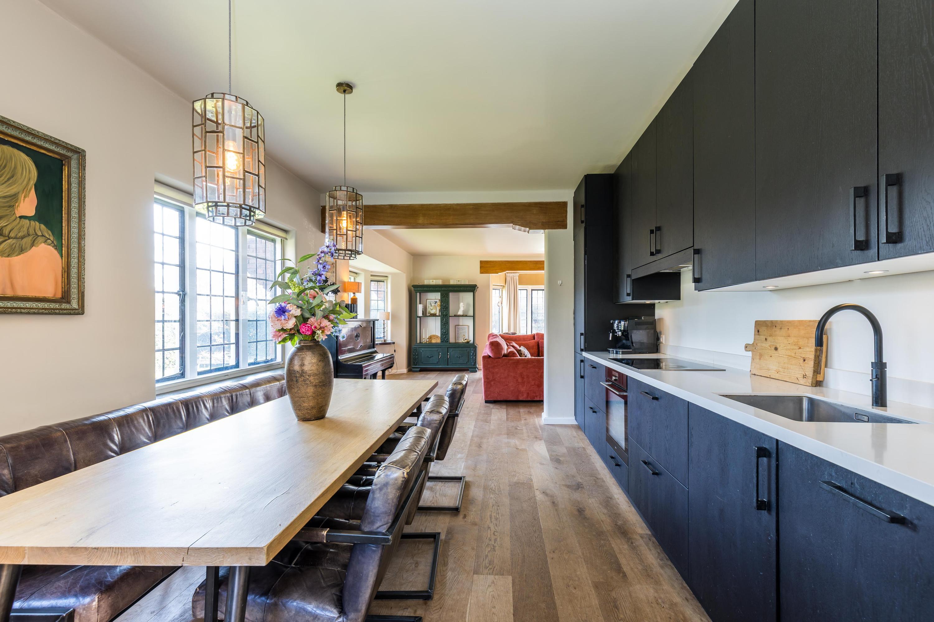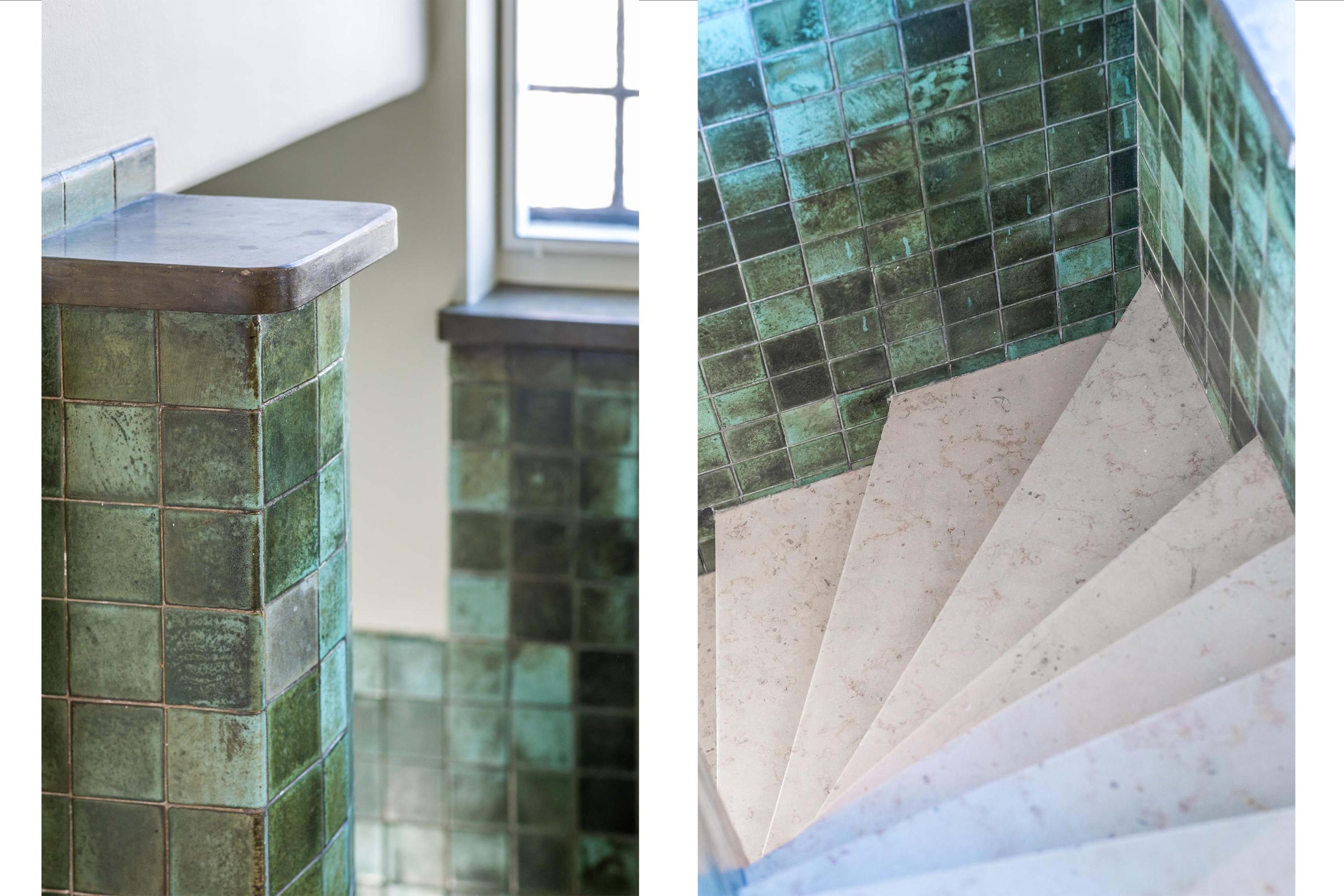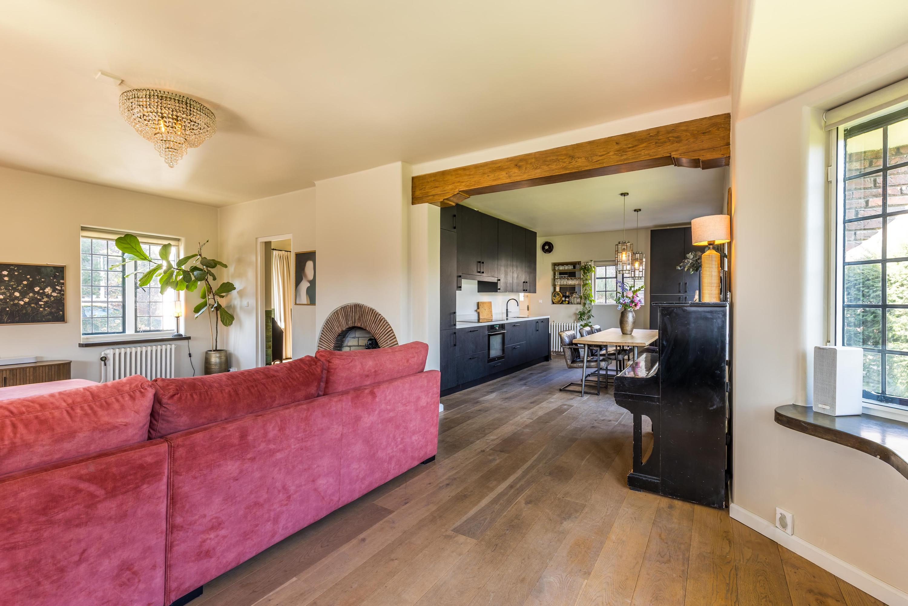 Begane grond: Entree middels een halfronde voordeur, bijzonder ruime hal waar je bij wijze van spreken zou kunnen rolschaatsen, maar van geluk zeker eens een dansje zal doen. De charmante woonkamer met houtkachel, karakteristieke erker en daglicht van 3 zijden met prachtige glas-in-lood-raampartijen, de open woonkeuken geeft een moderne twist. Het leuke aan de plattegrond op de begane grond is dat je een rondje kan lopen, via een deur in de keuken kom je via een kleine gang weer in de balzaal van een hal. Aan de hal grenst ook de toiletruimte en een vaste kast. De hal en trapopgang zijn voorzien van authentieke wandtegeltjes in verbluffend goede staat.