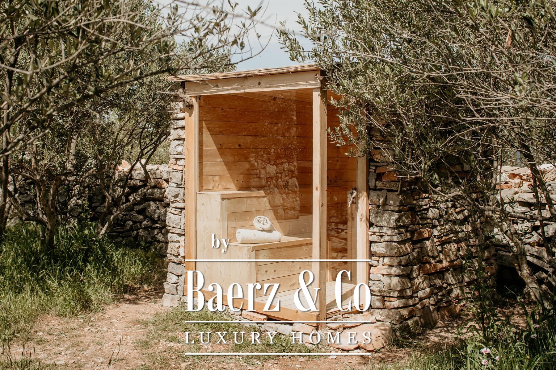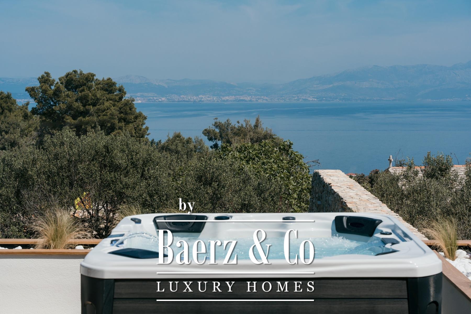 Šolta, an elegant and modernly decorated villa located on one of the most beautiful Dalmatian islands.The property is located on an elevated and peaceful location near the town of Gornje Selo, which offers spectacular panoramic views of the sea, Split and the nearby island of Brač.The villa was built in 2024 on a spacious plot of 1,800 m², which provides complete privacy and a sense of security. With a total area of 270 m², it offers supreme comfort through three bedrooms, each of which has its own bathroom and access to a shared terrace. The interior combines contemporary design and natural materials, with warm wooden floors and carefully selected details that give the space a refined character.The open living area with a fireplace, large glass walls and a view of the sea connects to the exterior of the house and creates the perfect ambiance for living all year round. The kitchen is fully equipped with modern appliances and a functional layout, while the exterior of the villa additionally impresses with a heated swimming pool with an electric cover, a jacuzzi, a sauna, an ice tub (Chill tubs), summer