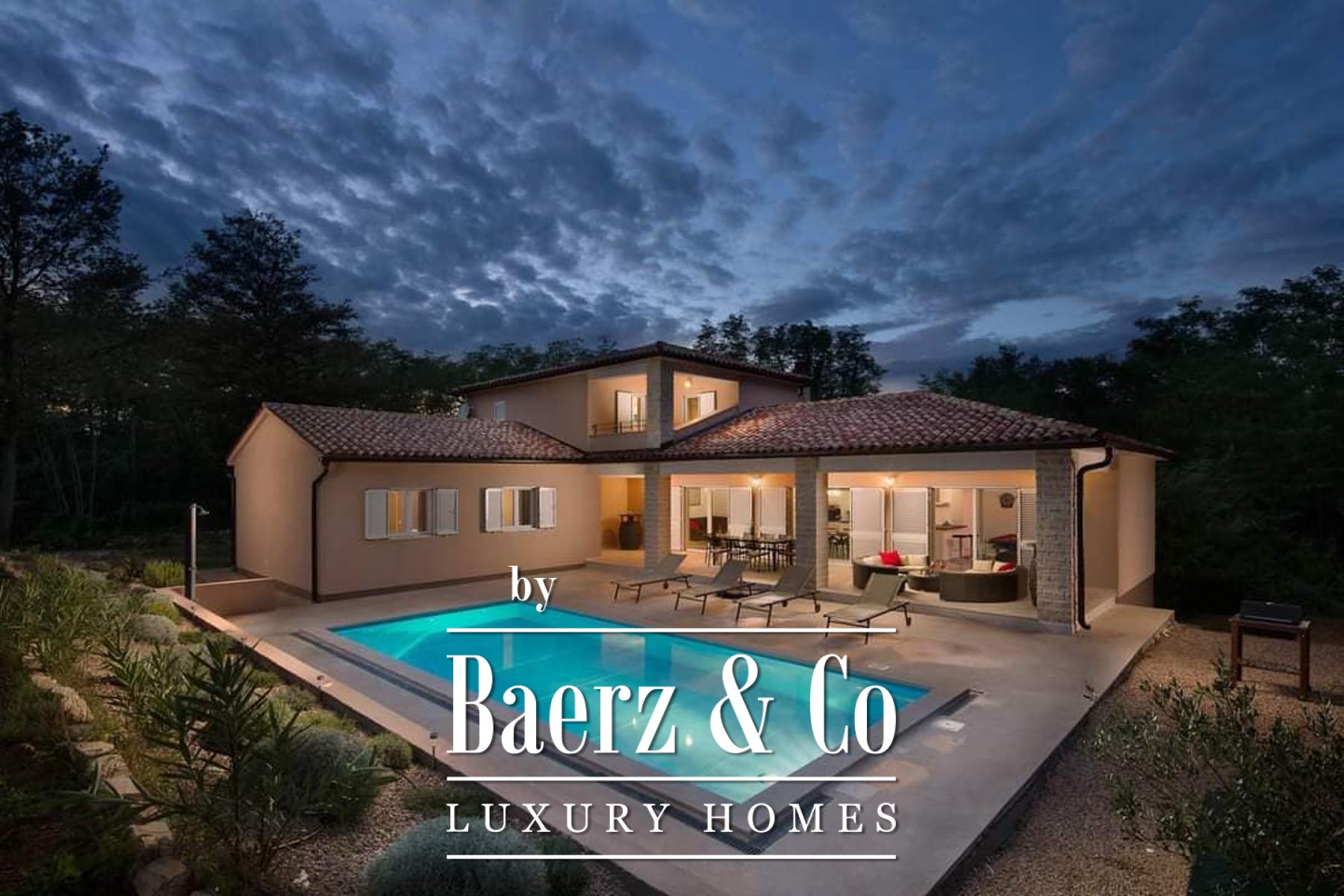 This detached house is located in a beautiful location on a plot of 2009 m2. Idyllically peaceful green surroundings and immense privacy win you over at first. The interior and exterior of the house are simple, unobtrusive, and extremely pleasant. In its 278 m2 of living space, it extends through the basement, ground floor, and first floor. The basement serves as a place for relaxation, so there is a sauna, jacuzzi, toilet, shower, and mini gym in it, then we come to the ground floor the main part of the house, where there is a spacious living room, a kitchen with a dining room, a pantry, a corner for billiards, two bedrooms with private bathrooms and a guest toilet. Upstairs, on the last floor of the house, there are two more bedrooms with their own bathrooms and access to a covered terrace. An interesting part of the property is the described floor, which communicates with glass walls to a covered terrace where there is a space for socializing, as well as a garden with