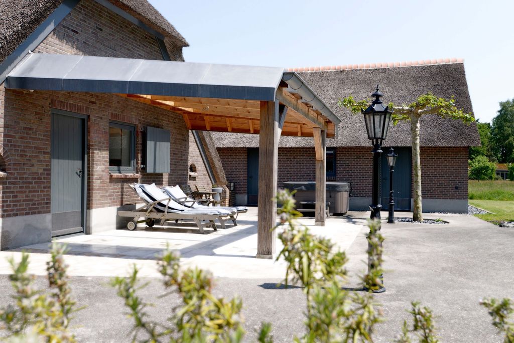 Het naastgelegen bijgebouw is volledig gerenoveerd en ingericht als luxe gastenverblijf. Onder de veranda, uitgevoerd in hout, zink en hardglas, ervaart u een prachtig uitzicht over het eigen terrein. Binnen treft u een sfeervolle woonkamer, open keuken en een luxe badkamer met koperafwerking en een driepersoons sauna. De verdieping biedt ruimte voor een slaapkamer en extra bergruimte. Dit bijgebouw is multifunctioneel inzetbaar, bijvoorbeeld als gastenverblijf, kantoor, Bed & Breakfast of inwoning.