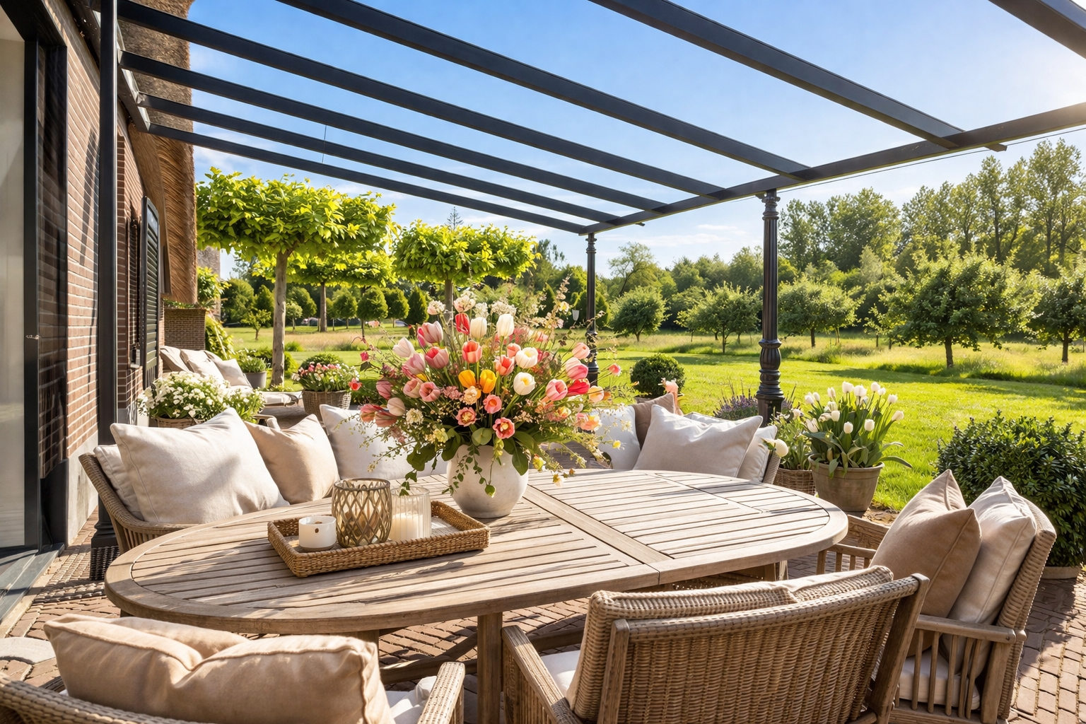 Het perceel is fraai aangelegd en volledig omsloten door laurierhagen en bomen, met aan de achterzijde de Twentsche Wetering als natuurlijke begrenzing. De tuin beschikt over meerdere terrassen en veranda’s waar rust en privacy centraal staan. De boomgaard met 15 appelbomen, aangevuld met peren- en pruimenbomen, en de weides met veldbloemen versterken het landelijke karakter. Een moestuin, kippenren en beregeningsinstallatie maken het geheel compleet.