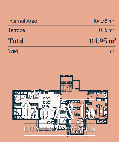 Structure of the apartment: hallway, living room with kitchen and dining table, 3 bedrooms, 2 bathrooms, a toilet and a terrace. The apartment itself has 104,78m2, while the terrace has 10,15m2.