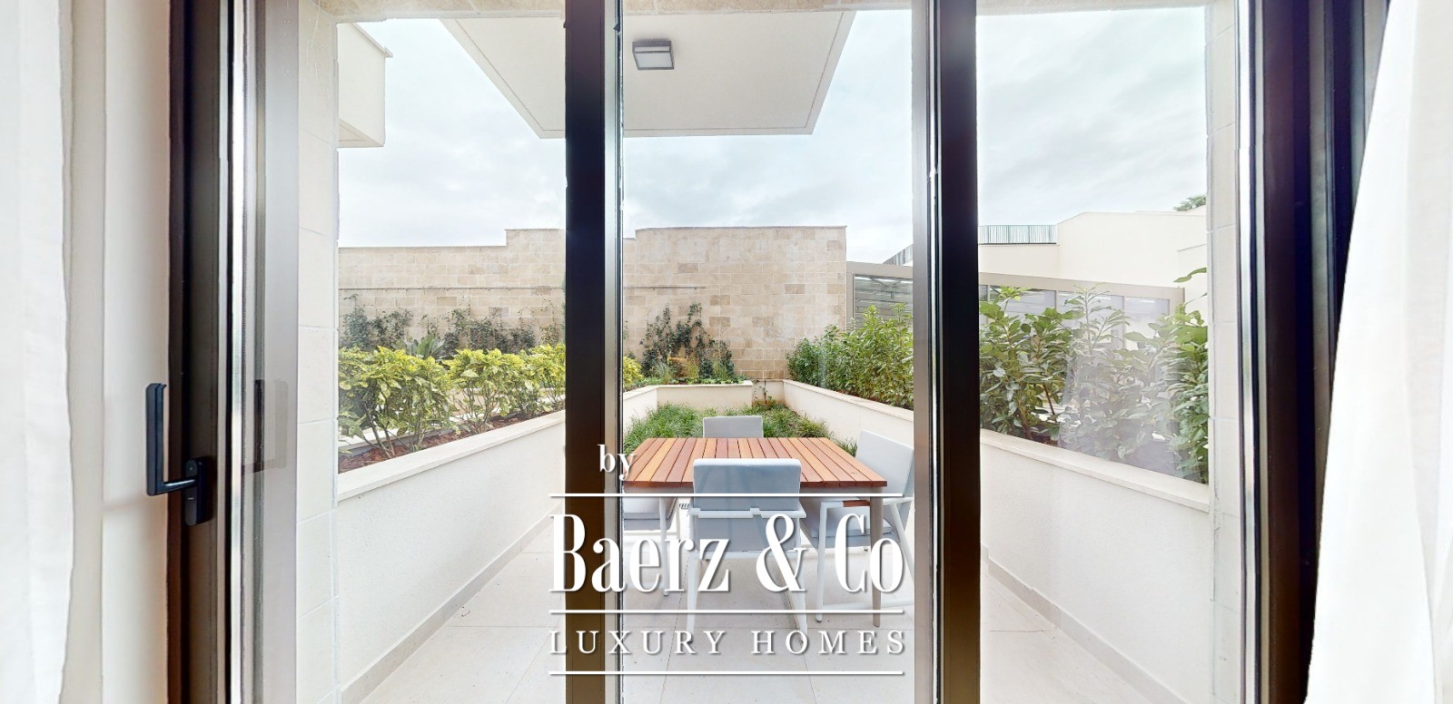 Het duplex appartement beschikt over twee slaapkamers, twee badkamers, een gastentoilet, een open woonkamer met keuken en eetgedeelte, en een uitnodigend terras. Grote ramen bieden rustgevend uitzicht op zee en bergen en versterken het natuurlijke licht en het ontspannen tempo van de omgeving. Bij de woning hoort een privéparkeerplaats in de garage, volledige meubelering en het exclusieve gebruiksrecht van een perceel van 33,49 m² bij de entree, ideaal voor een besloten tuin of loungehoek buitenshuis.