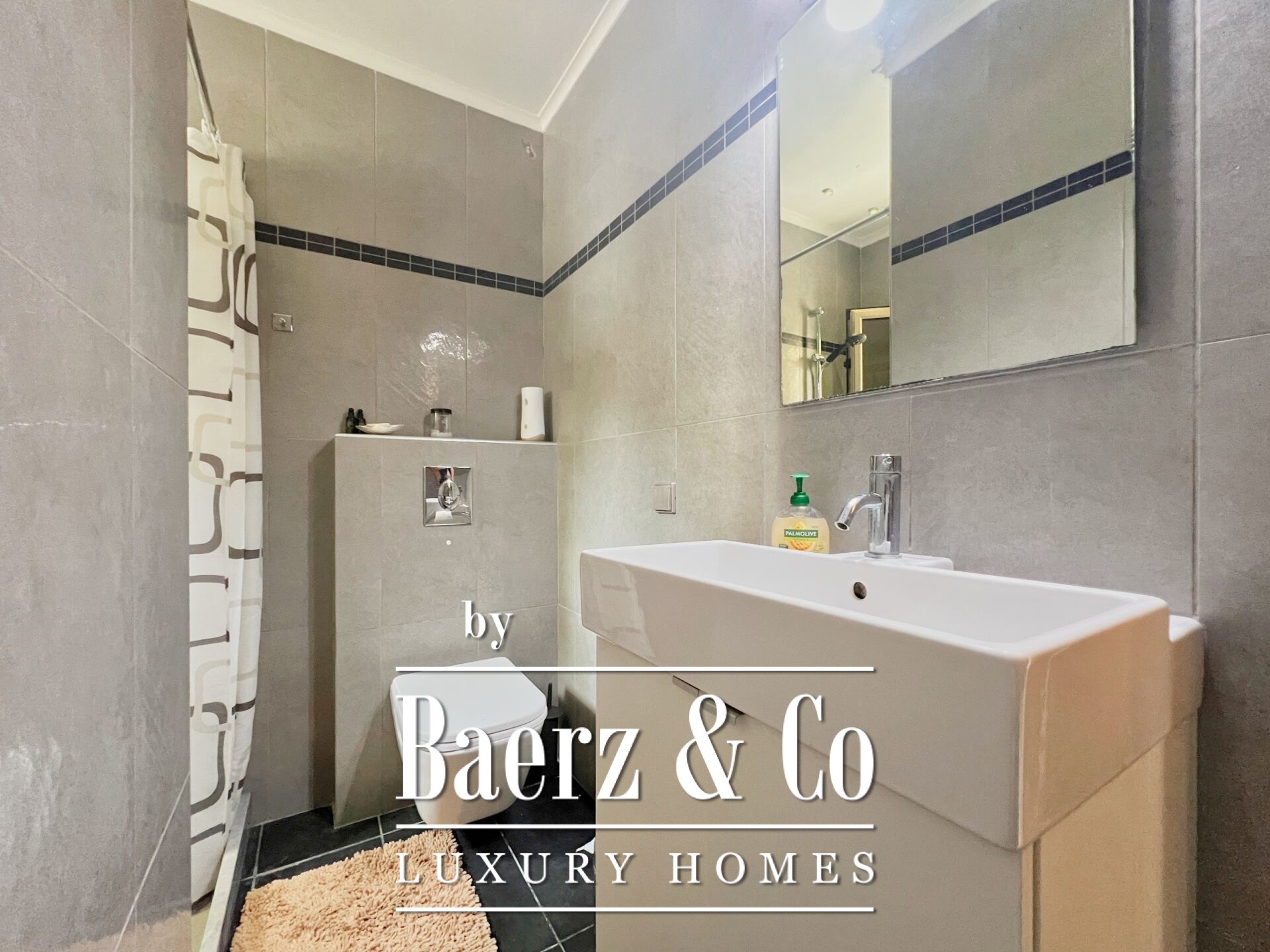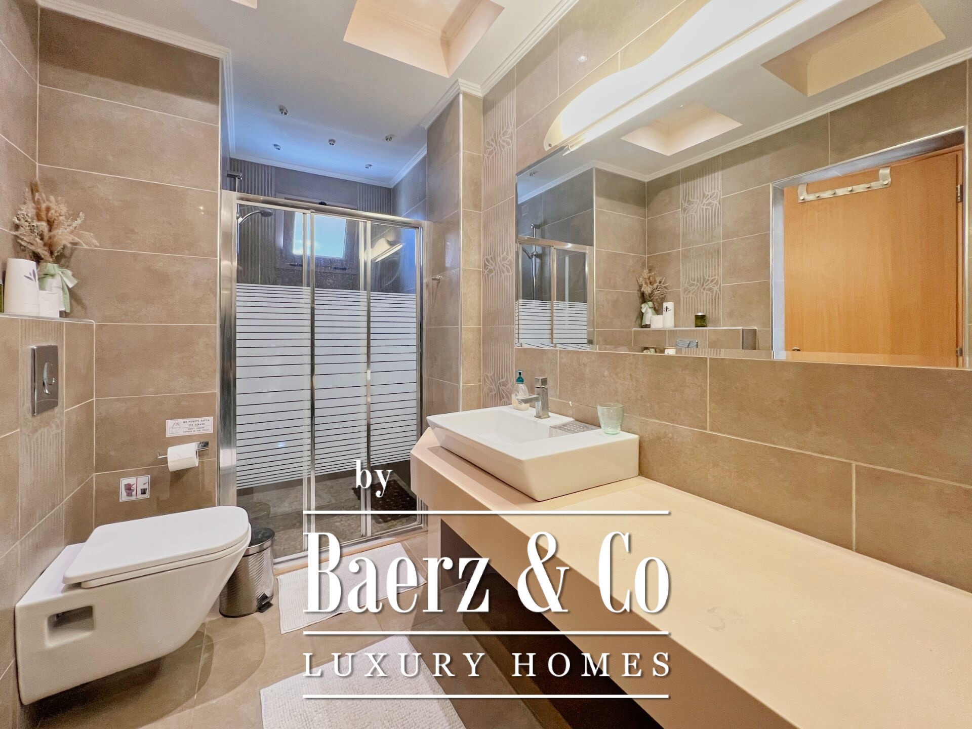 The main entrance of the residence is located on the second level, where we find the formal living room with fireplace, the comfortable dining room, the luxurious kitchen and a covered terrace with a stunning 180° view. The first level includes two bedrooms, two bathrooms and access to the garden, while the third level hosts the master bedroom with private bathroom and two large terraces.