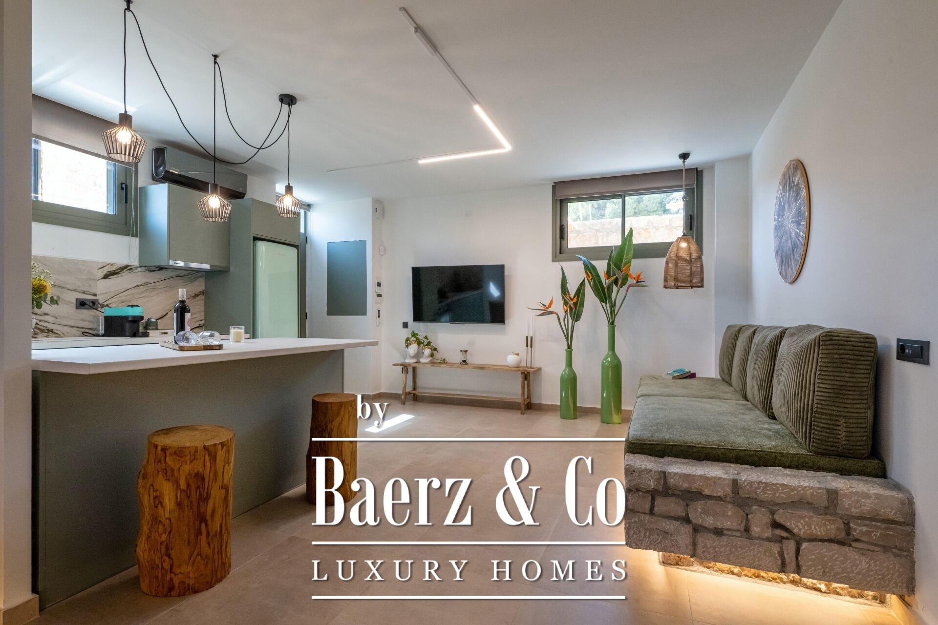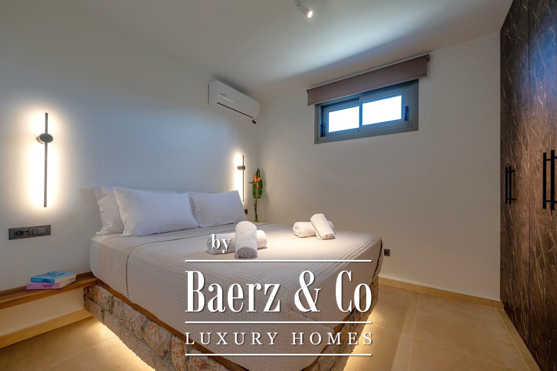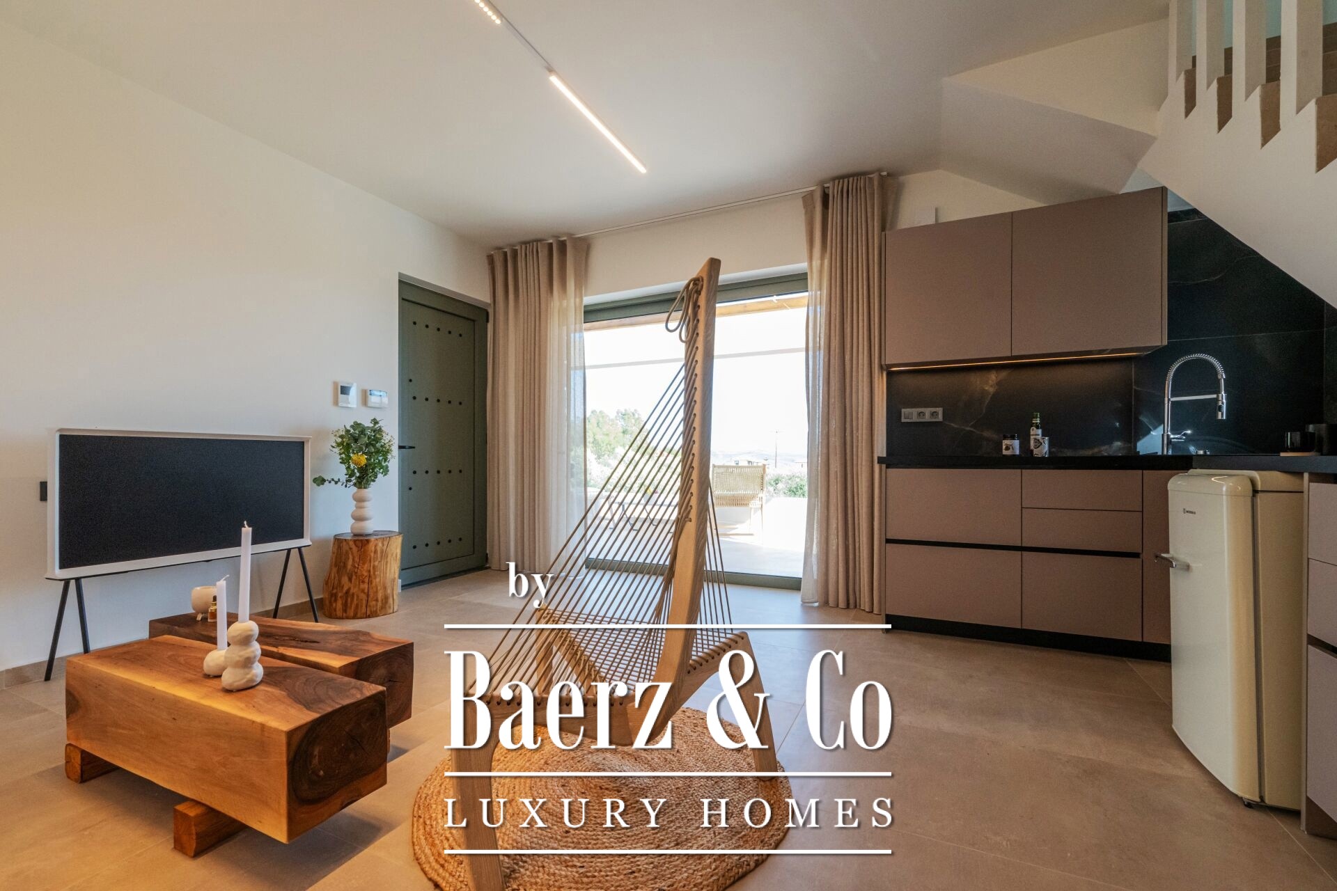 Het verhoogde ontwerp strekt zich uit over drie niveaus. Het souterrain beschikt over een leefruimte met keuken, badkamer en twee lichte slaapkamers, ontworpen met oog voor privacy en gastvrijheid. De verhoogde begane grond vormt het hart van het dagelijks leven met een open keuken, woonkamer en eetgedeelte, die naadloos overgaan naar een balkon van 30 m² onder een pergola, waar zee en licht samenkomen. Boven biedt de master bedroom met en suite badkamer een exclusieve privésfeer.