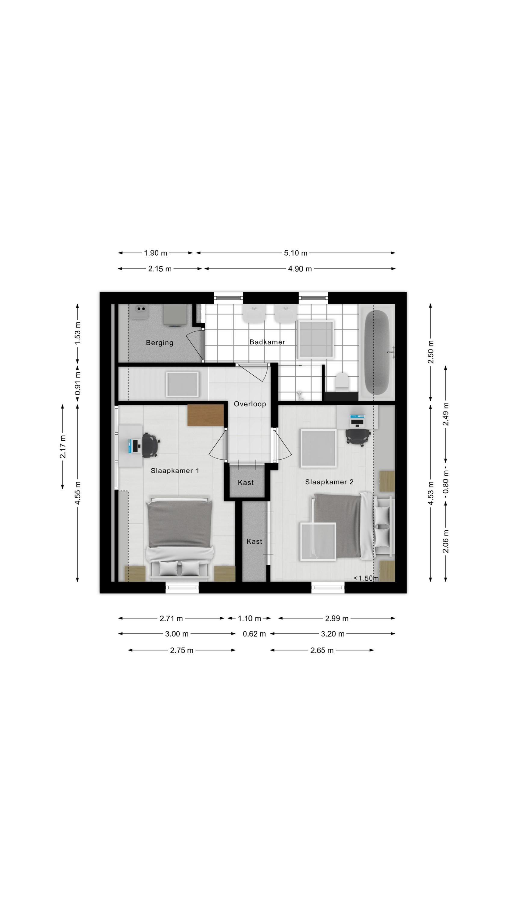Verder beschikt de woning over twee ruime slaapkamers en een volledige badkamer. De slaapkamers zijn aan de voorzijde gelegen en zijn voorzien van hoogwaardige afwerking. Op de overloop is een airco gesitueerd die zowel kan koelen als verwarmen.