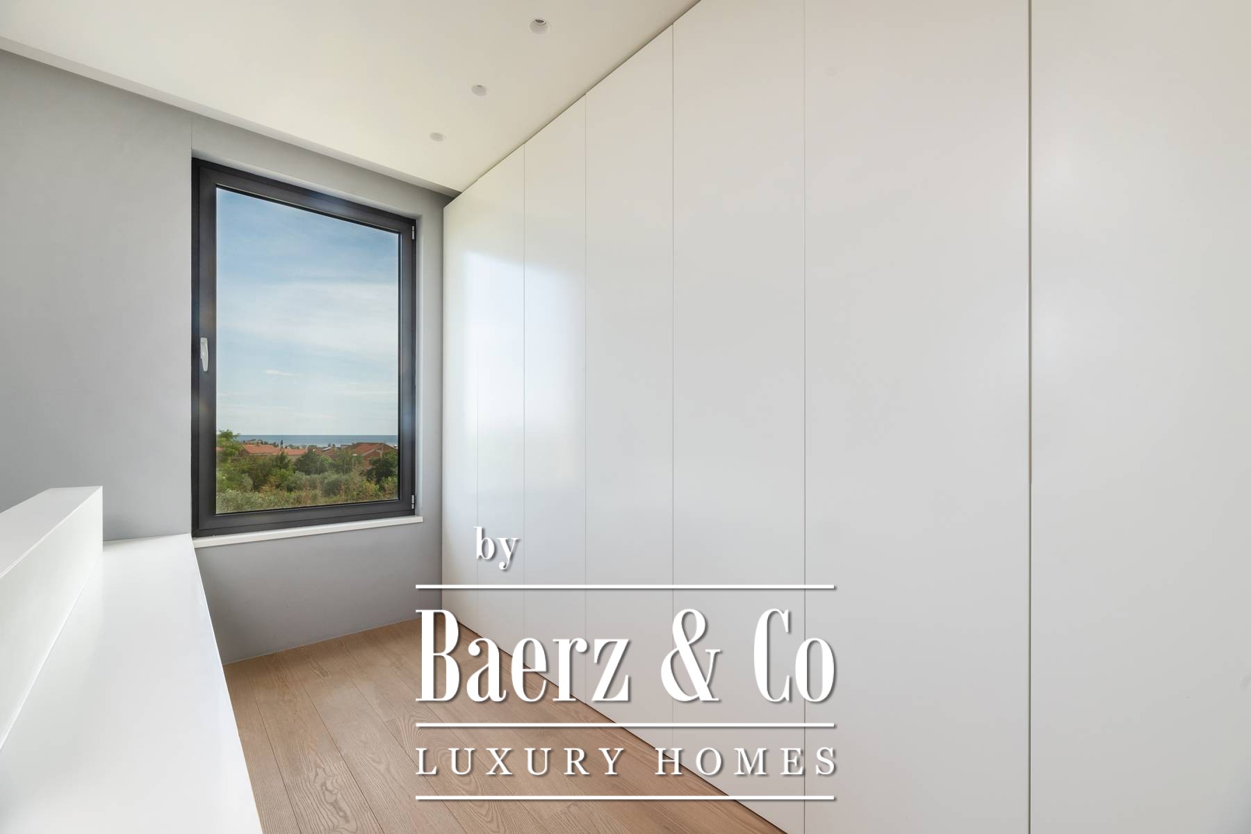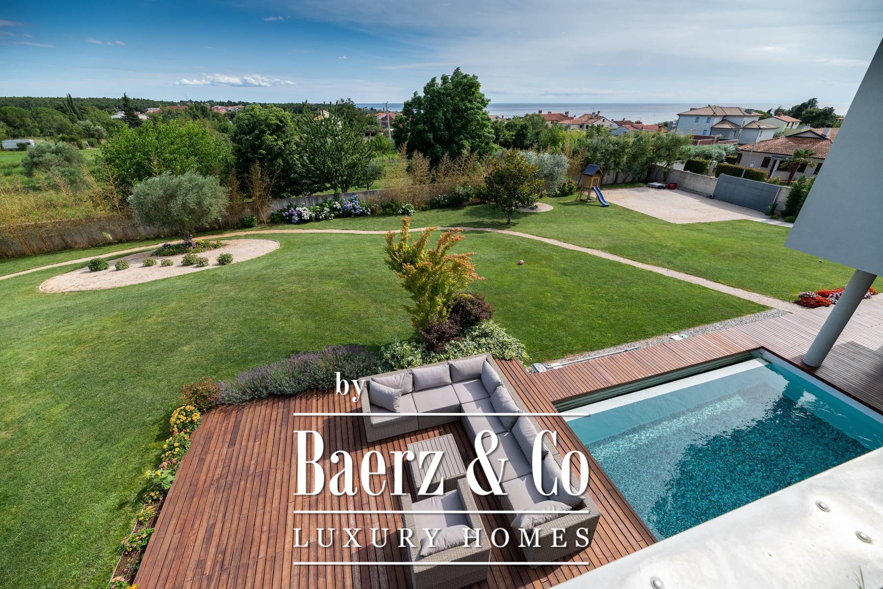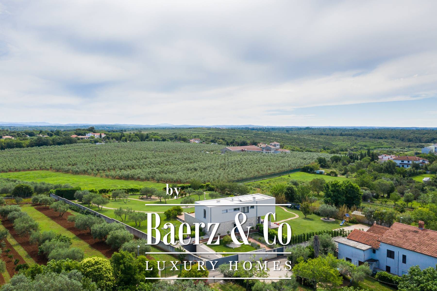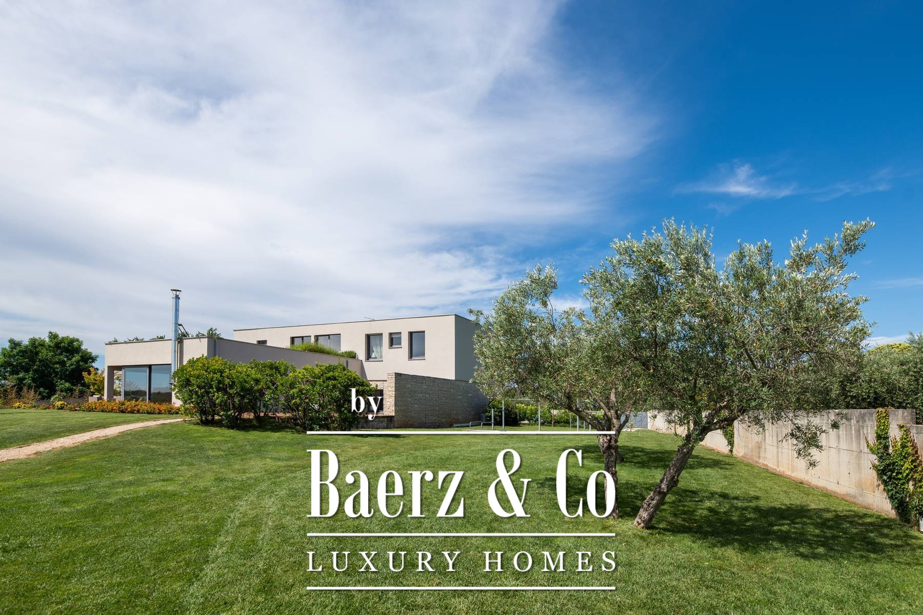 Modern smart house with 4.956 m2 land surrounded by olive groves just 400 meters from the favorite beaches of Umag. The architecture merges elegant design and stone as a traditional building element into an attractive villa with pool that provides the highest standards of modern living.The main entrance and driveway to the building are located on its west side, on the existing street, and the space for a garage with storage and a multimedia hall in the basement of the building.The ground floor consists of an entrance hall on the west side, a guest room with bathroom on the north side of the building and a unique living room, kitchen and dining room which is connected to the south facing terrace facing the sea, and north to the garden and outdoor terrace.In the entrance area, which is accessed west through the windshield, there is a garden on the north side of the house. The guest room is connected to the entrance area via an entrance hall from which one enters the bathroom. In the western part of the building, in addition to the mentioned windshield, there is a toilet to the north, and to the south there is an economic space related to the kitchen. On the west side of the south terrace, connected to the kitchen and the economic part, there is a summer kitchen covered with the volume of the upper floor.A staircase