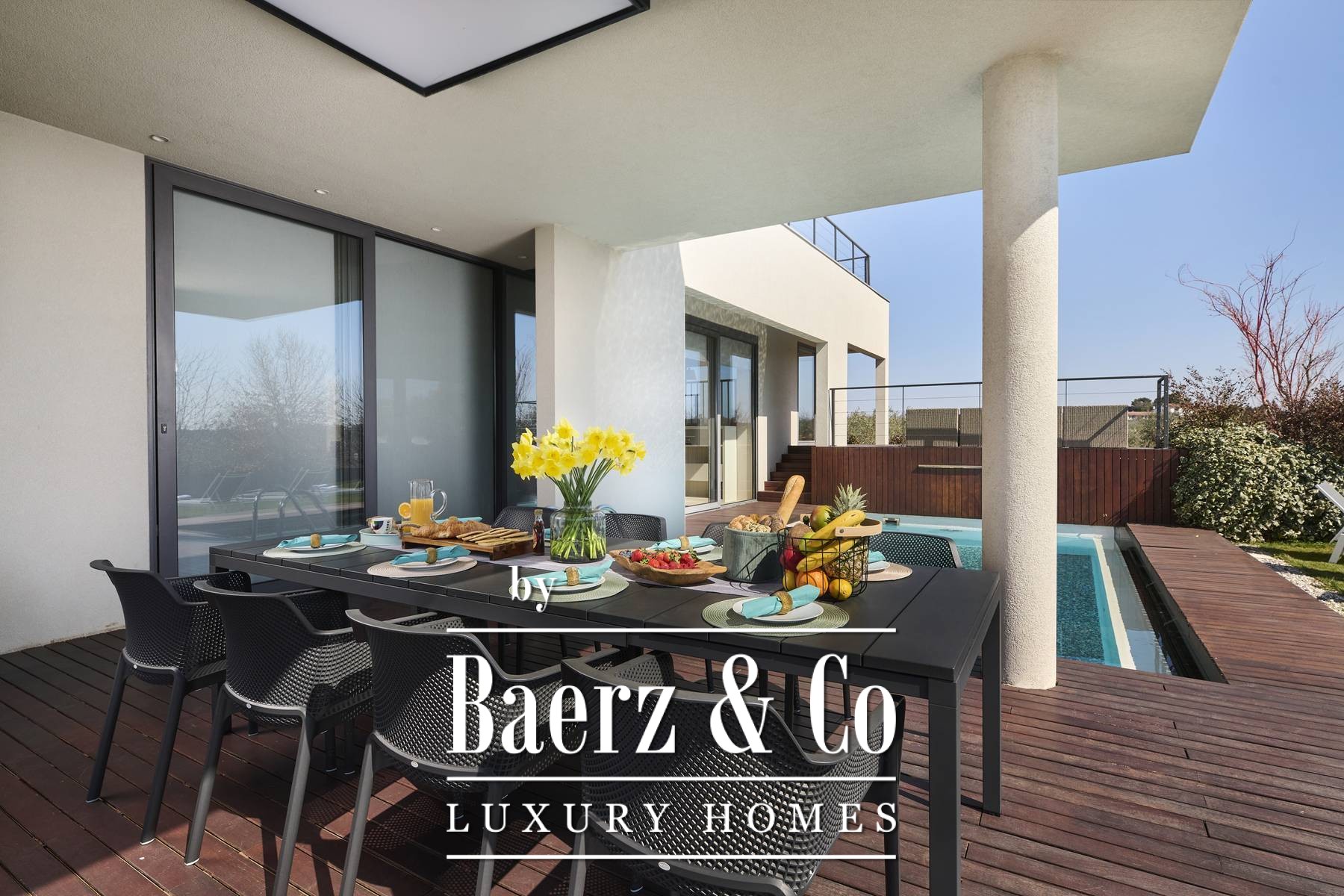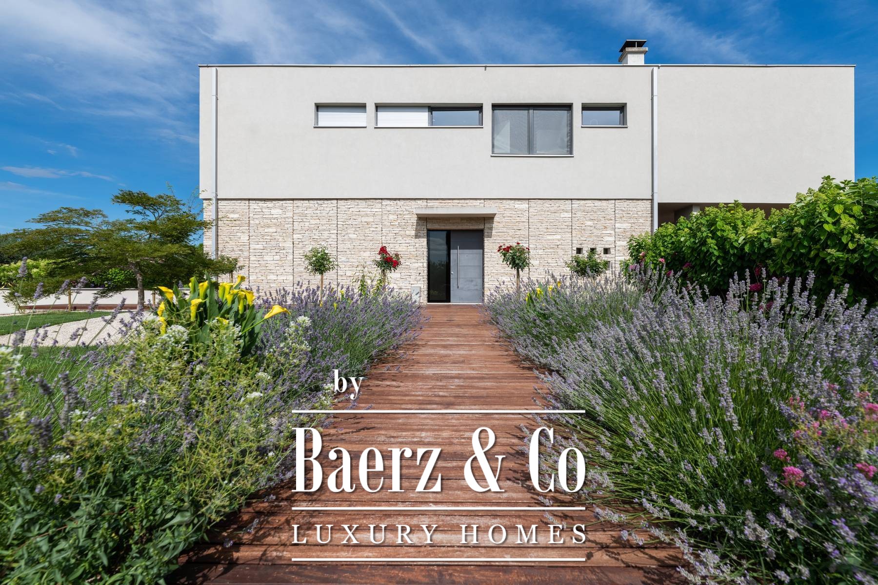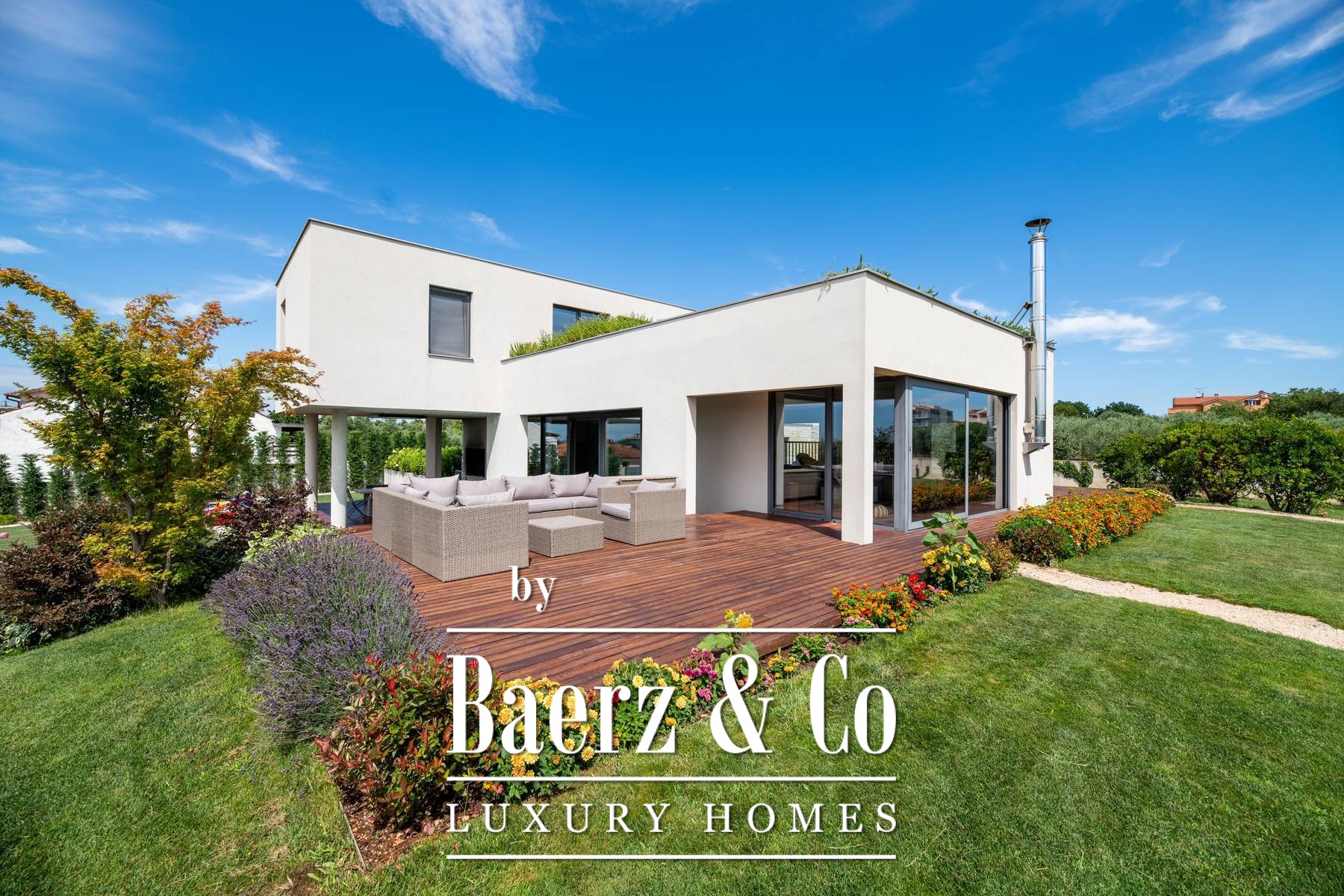 Modern smart house with 4.956 m2 land surrounded by olive groves just 400 meters from the favorite beaches of Umag. The architecture merges elegant design and stone as a traditional building element into an attractive villa with pool that provides the highest standards of modern living.The main entrance and driveway to the building are located on its west side, on the existing street, and the space for a garage with storage and a multimedia hall in the basement of the building.The ground floor consists of an entrance hall on the west side, a guest room with bathroom on the north side of the building and a unique living room, kitchen and dining room which is connected to the south facing terrace facing the sea, and north to the garden and outdoor terrace.In the entrance area, which is accessed west through the windshield, there is a garden on the north side of the house. The guest room is connected to the entrance area via an entrance hall from which one enters the bathroom. In the western part of the building, in addition to the mentioned windshield, there is a toilet to the north, and to the south there is an economic space related to the kitchen. On the west side of the south terrace, connected to the kitchen and the economic part, there is a summer kitchen covered with the volume of the upper floor.A staircase